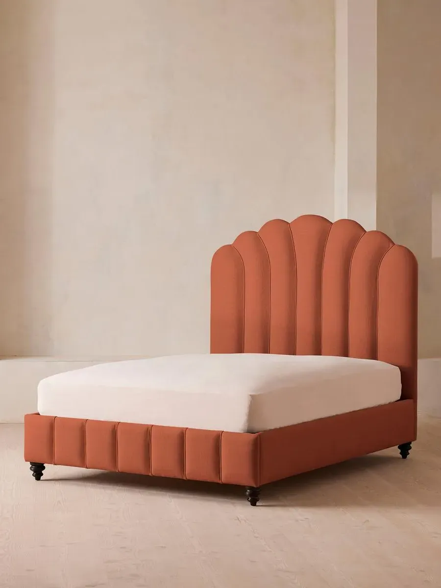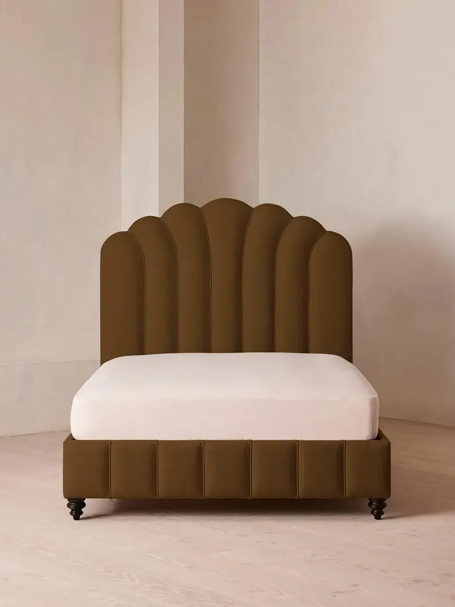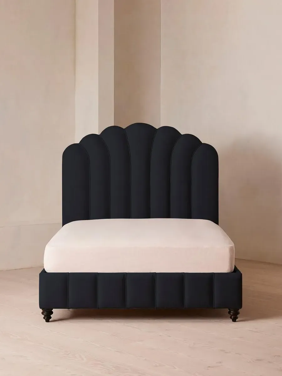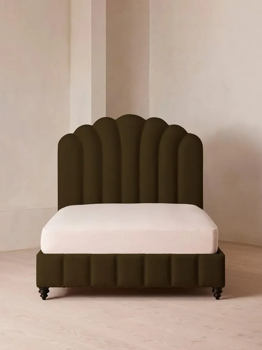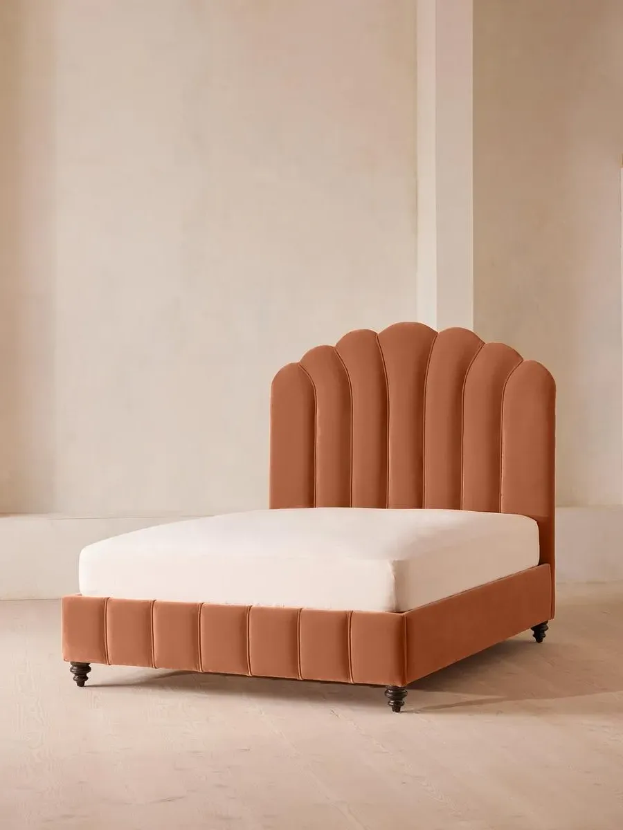 A fanned headrest and low profile wrapped in velvet upholstery are hand-crafted in the UK. Takings its inspiration from the cosy bedrooms of Kettner's in London, the Manette bed frame has a fanned headrest designed as a focal point for your room. Resting on turned hardwood feet, its low profile is handmade by skilled craftspeople, fully upholstered in velvet that comes in our full made-to-order palette.