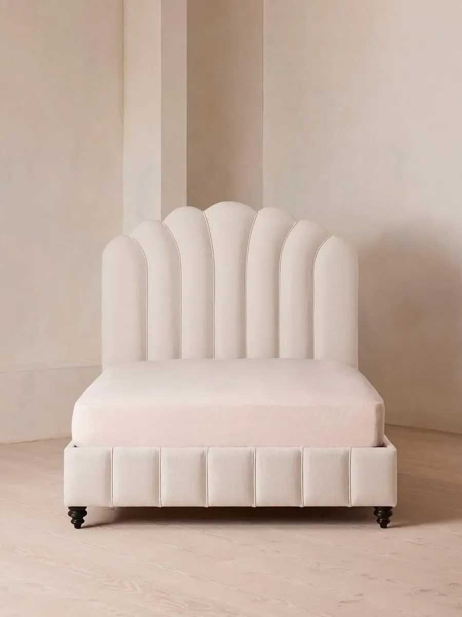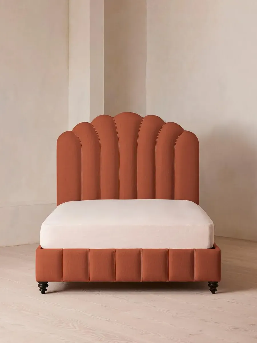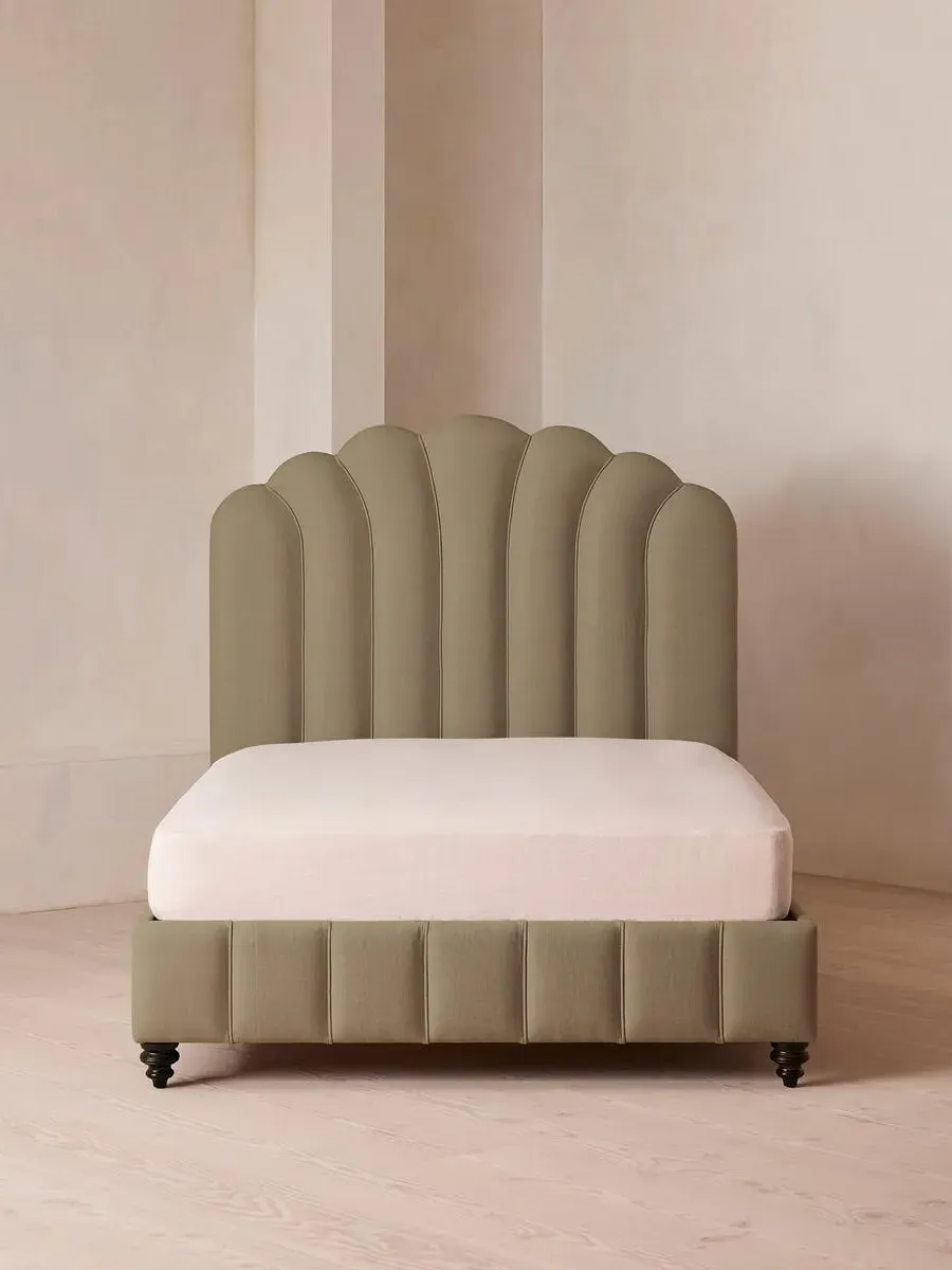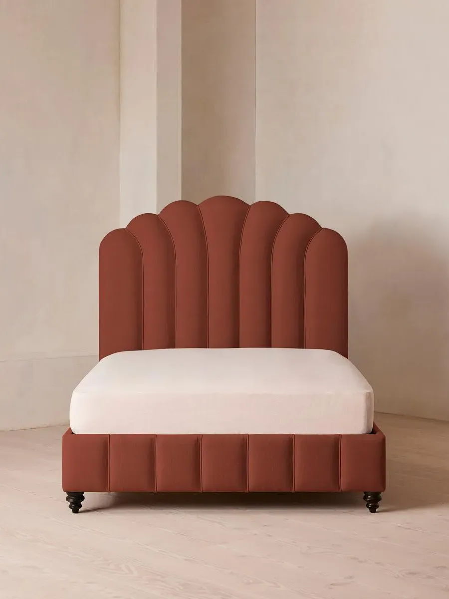 A fanned headrest and low profile wrapped in velvet upholstery are hand-crafted in the UK. Takings its inspiration from the cosy bedrooms of Kettner's in London, the Manette bed frame has a fanned headrest designed as a focal point for your room. Resting on turned hardwood feet, its low profile is handmade by skilled craftspeople, fully upholstered in velvet that comes in our full made-to-order palette.