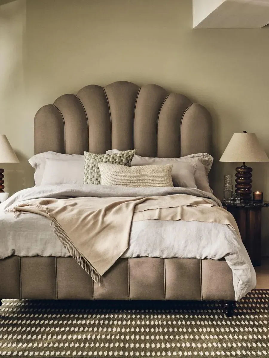 The bed features an Art Deco-inspired fan headboard with piping detail, upholstered in rich velvet. Its handcrafted construction provides durability, while the turned hardwood feet add depth and texture. The low-profile design offers ease of access and comfort for daily use.