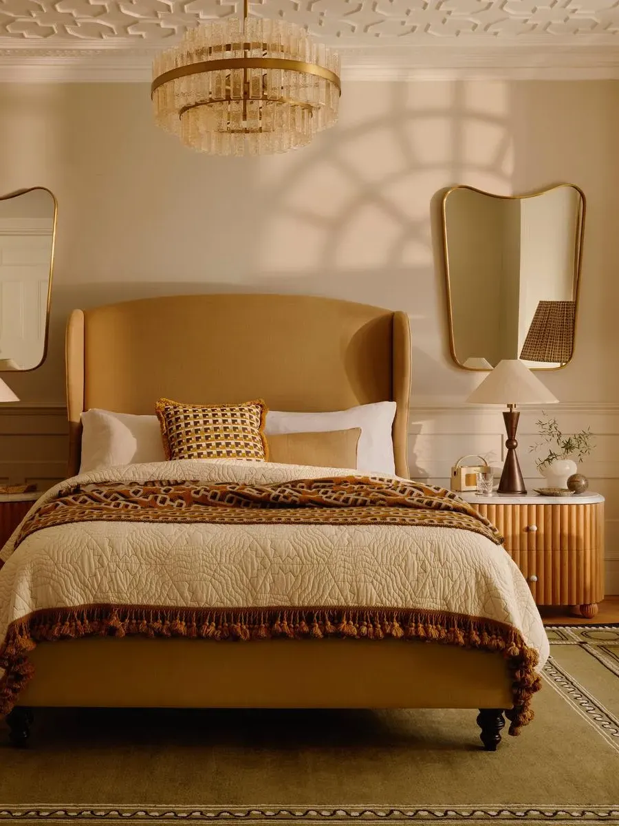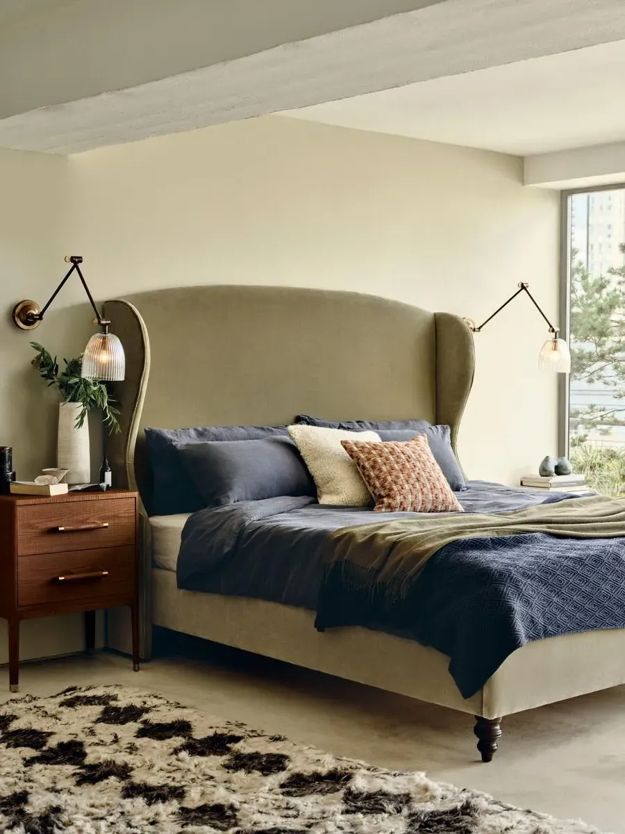 An oversized headboard hand-crafted in the UK helps to create a cocooning effect. Inspired by the warm, welcoming interiors of Soho House Barcelona, the Rivas bed is characterised by its large, winged headboard. Handcrafted in the UK, it's fully upholstered in rich velvet and sits on dark, turned hardwood feet.