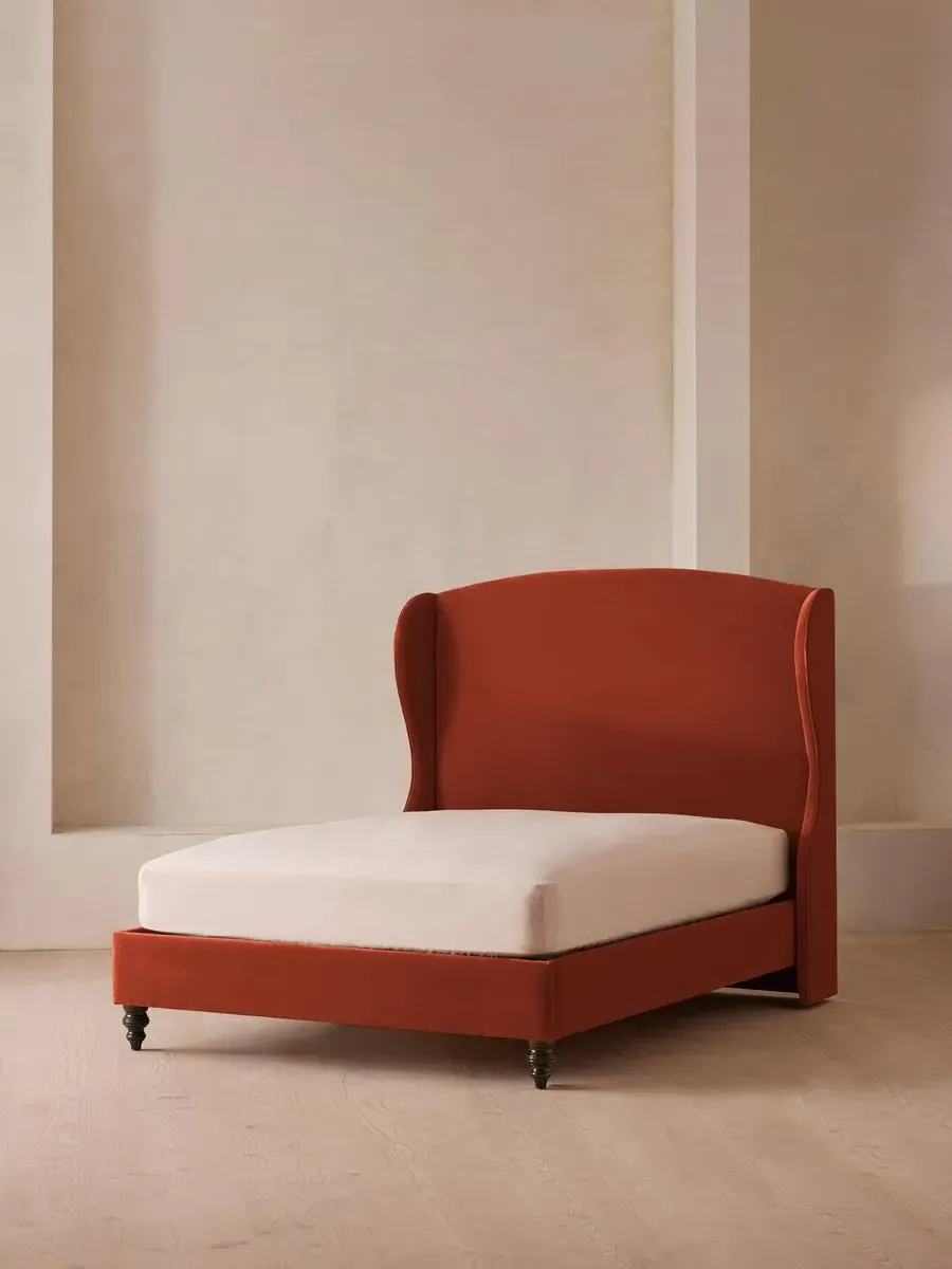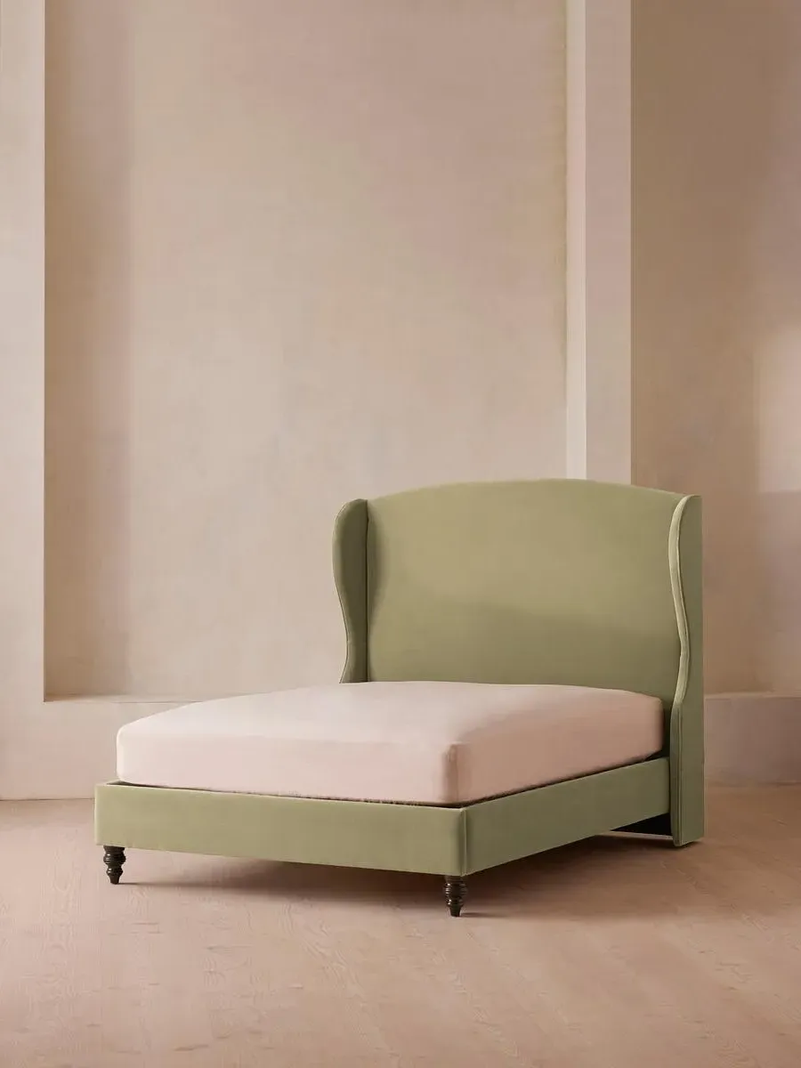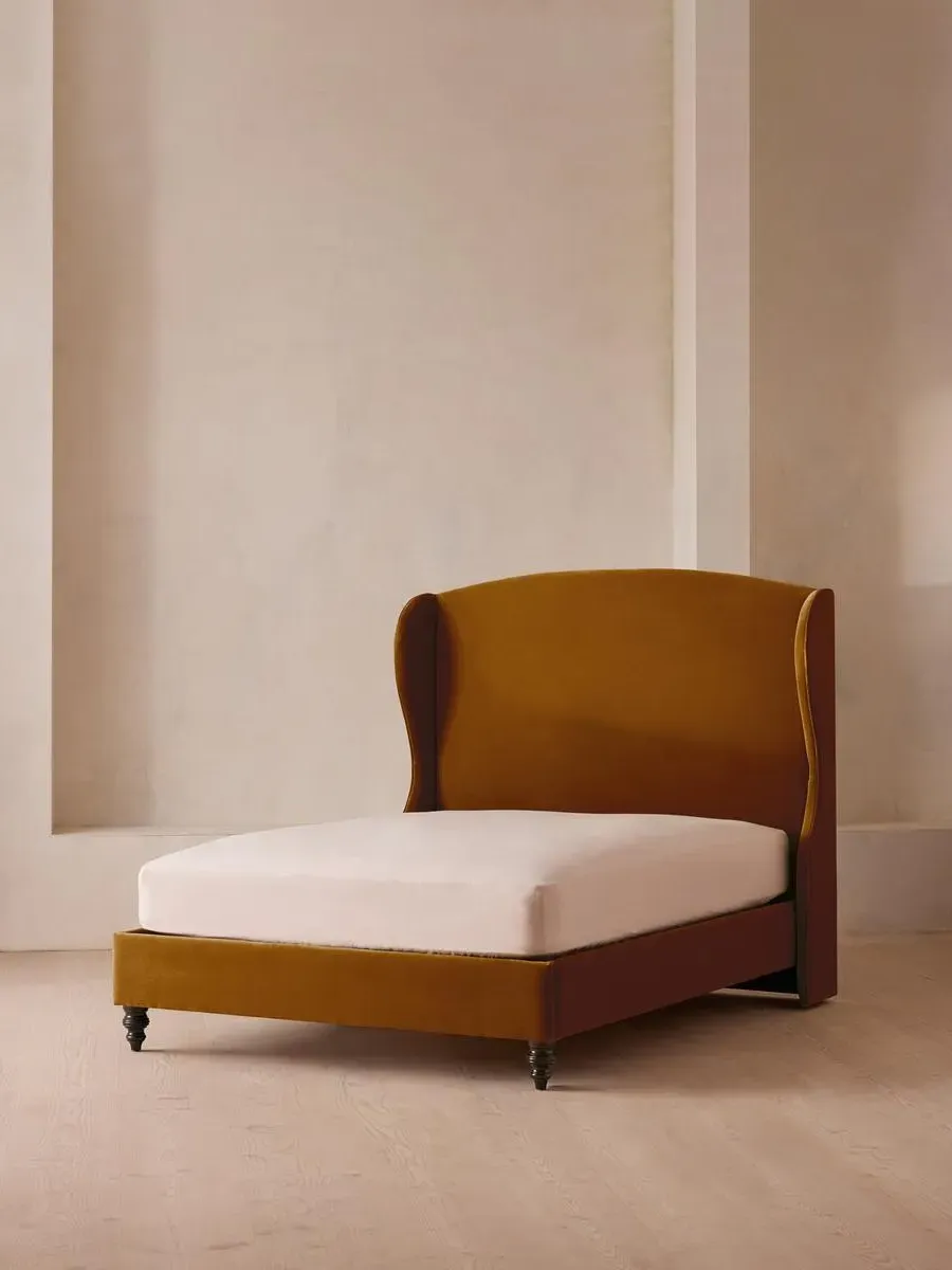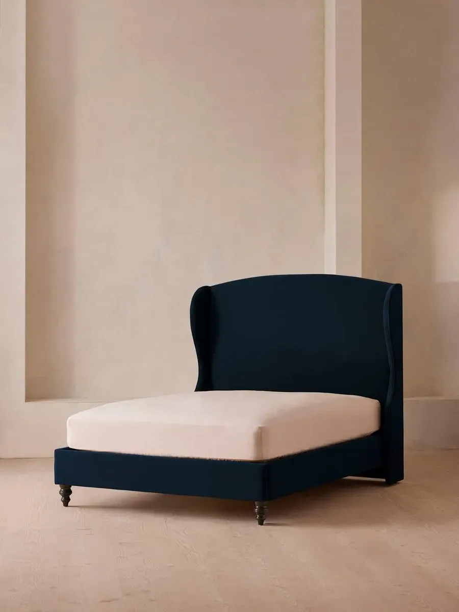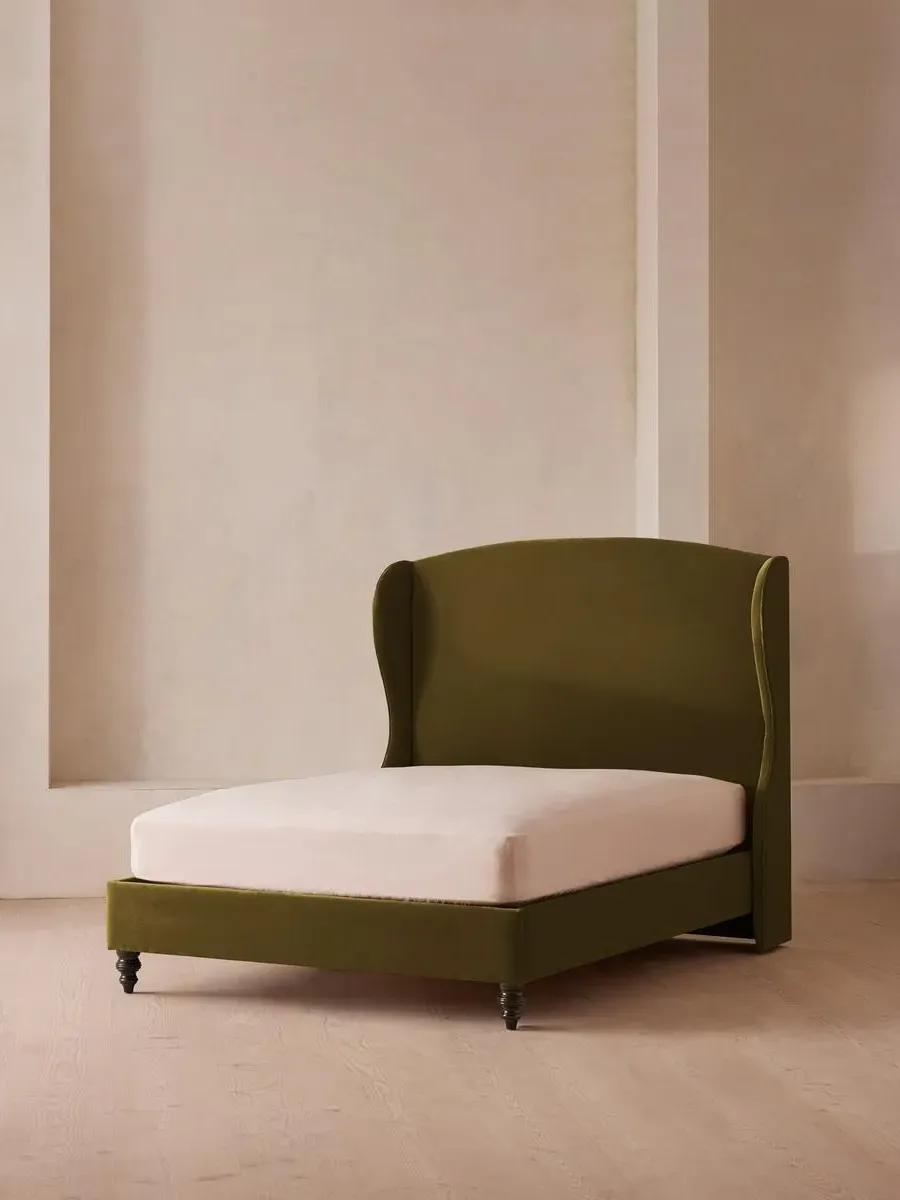 The bed features an oversized winged headboard that creates a cocooning effect for restful sleep. Handcrafted in the UK, it combines rich velvet upholstery with dark turned hardwood feet. The winged design provides enhanced comfort and privacy, while the full upholstery adds softness and warmth.