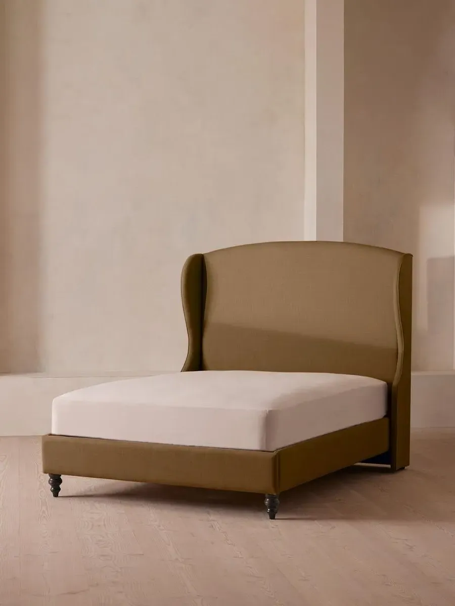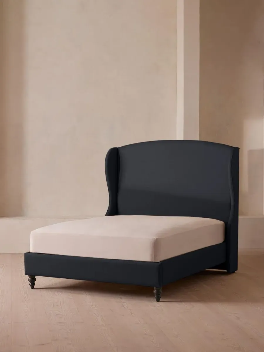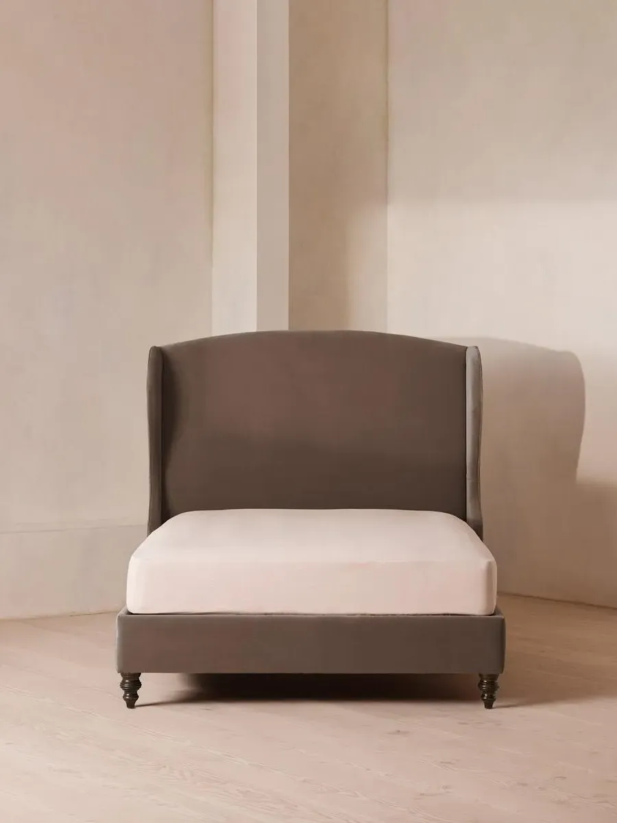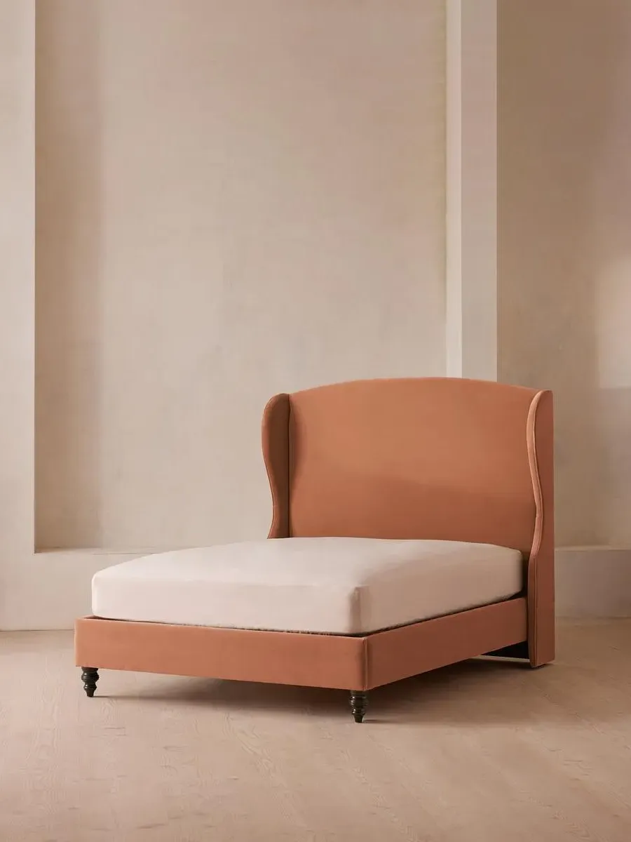 The bed features an oversized winged headboard that creates a cocooning effect for restful sleep. Handcrafted in the UK, it combines rich velvet upholstery with dark turned hardwood feet. The winged design provides enhanced comfort and privacy, while the full upholstery adds softness and warmth.