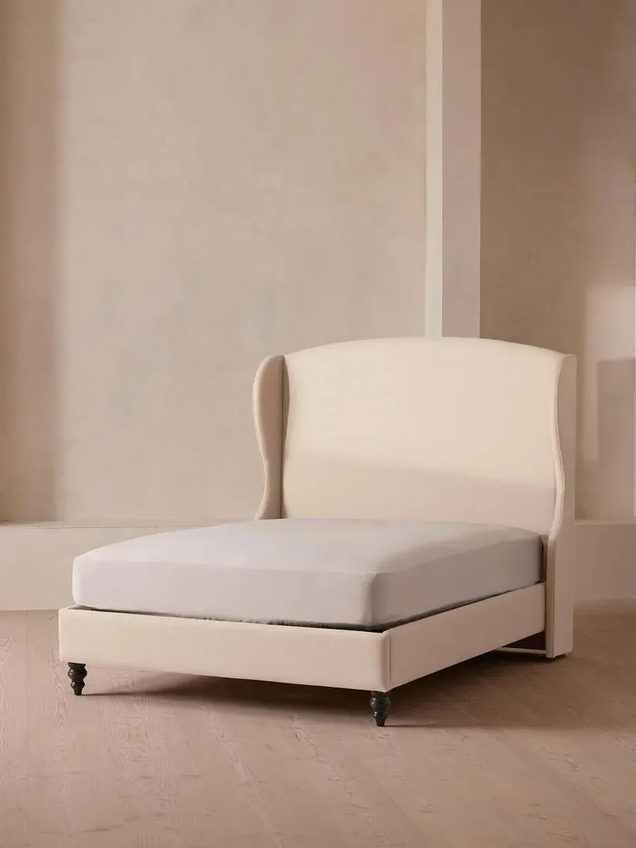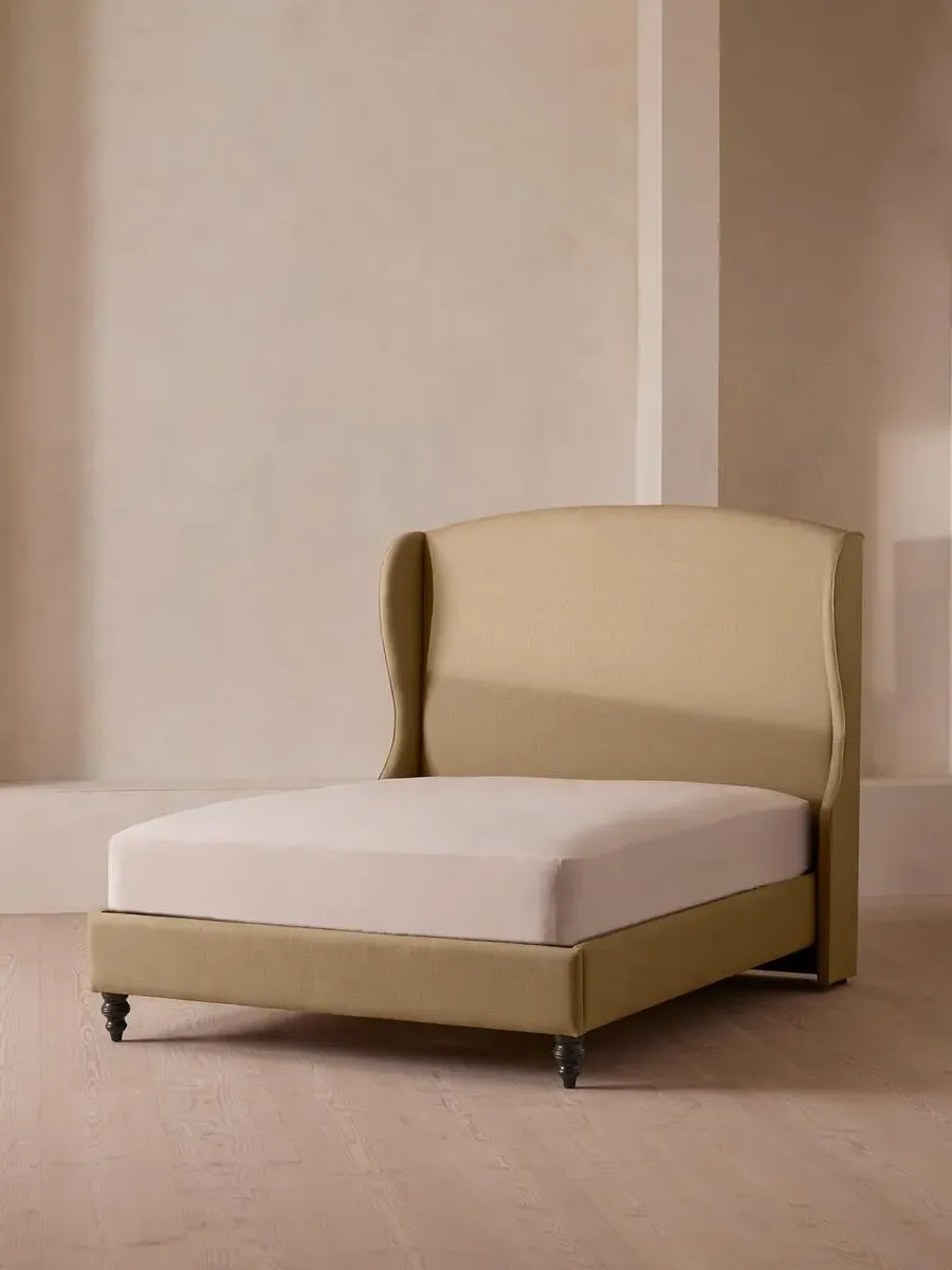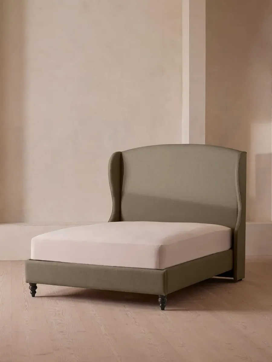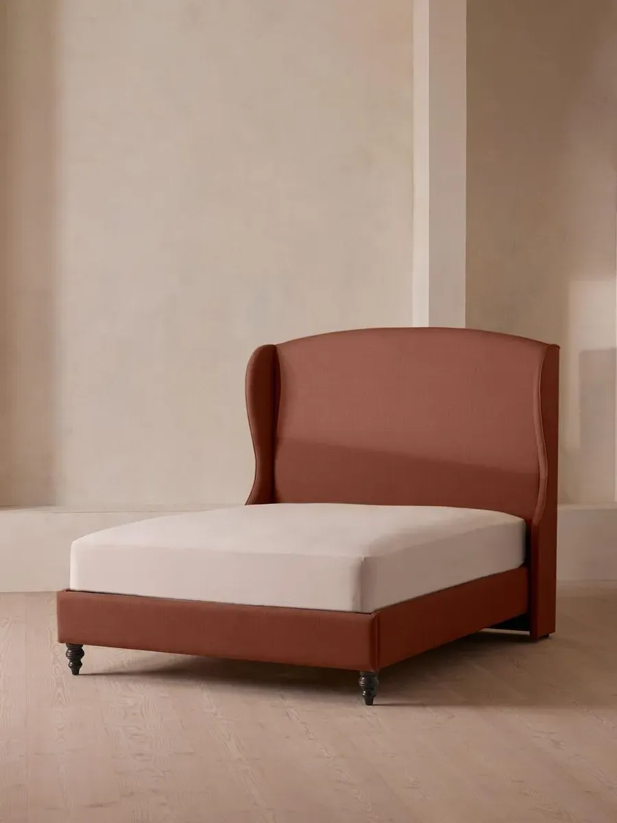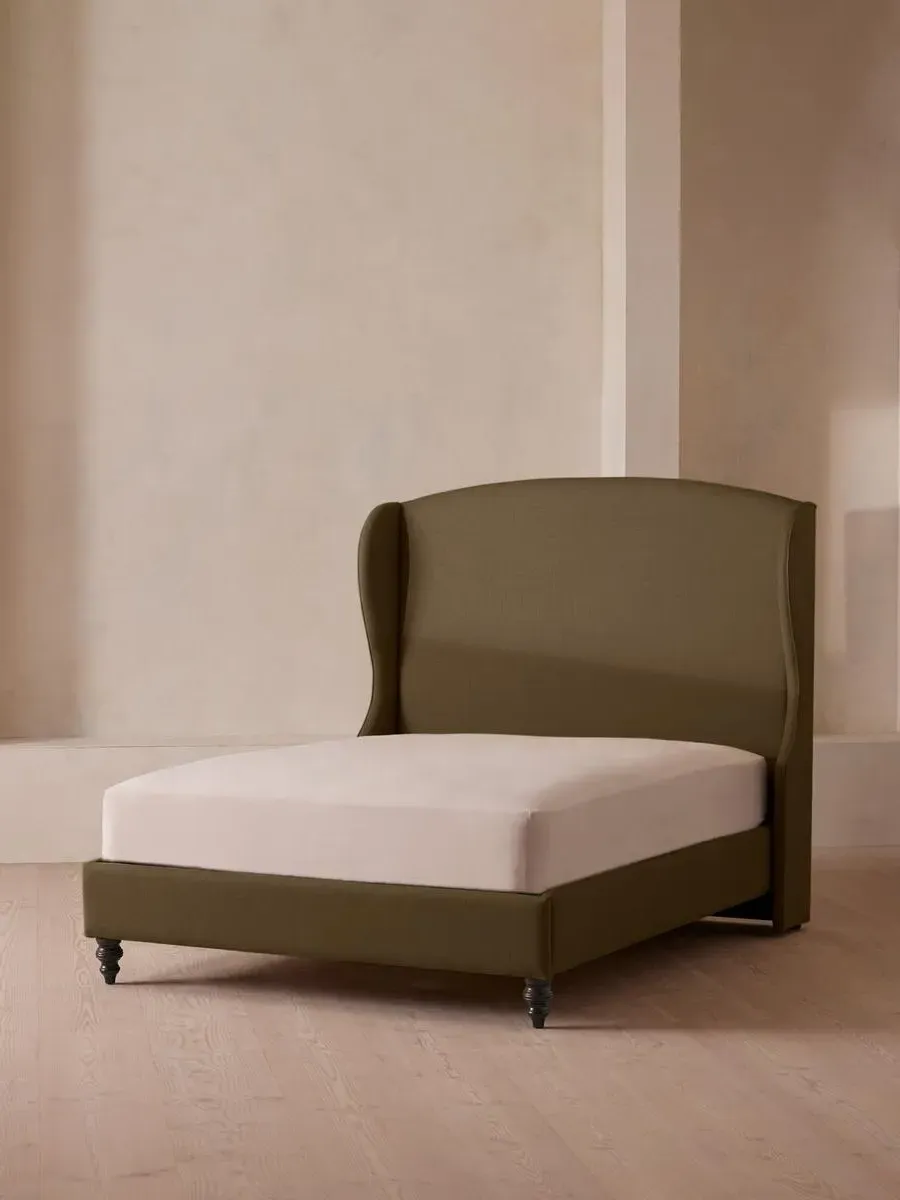 The bed features an oversized winged headboard that creates a cocooning effect for restful sleep. Handcrafted in the UK, it combines rich velvet upholstery with dark turned hardwood feet. The winged design provides enhanced comfort and privacy, while the full upholstery adds softness and warmth.