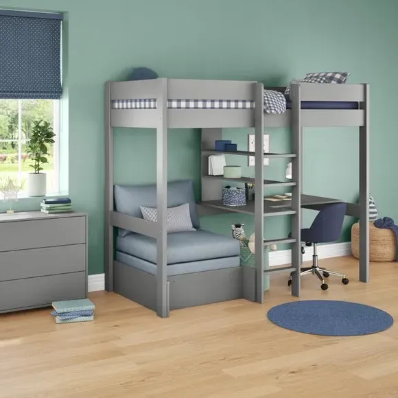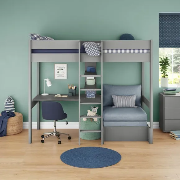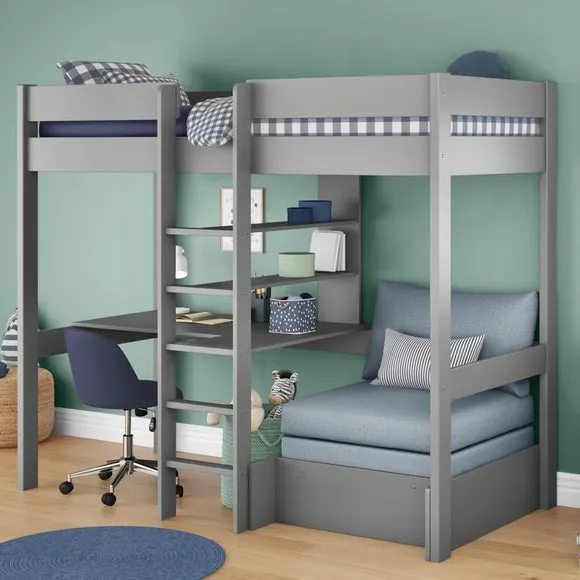 * Painted wooden frame* High foot end* Slatted base* Space saving* Assembled on delivery* Can only be delivered to mainland UK This innovative high sleeper maximizes floor space by raising the sleeping area, creating a cosy nook below that includes a comfortable chair bed, perfect for lounging, reading, or accommodating sleepovers. Designed with functionality in mind, the chair bed easily converts into a sleeping space, ensuring your child always has a comfortable spot for friends to stay over. The included cushion set adds extra comfort, making the chair bed an inviting place to relax during the day.*Select the relevant options to purchase mattresses to fit this bed. You can choose between foam or pocket sprung mattresses.