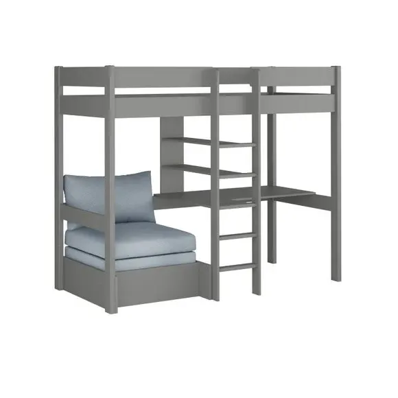 The high sleeper bed maximizes floor space with its raised sleeping area and integrated chair bed below. Its painted wooden frame features a high foot end and slatted base for support, while the convertible chair bed provides additional sleeping space when needed. The included cushion set adds comfort for lounging, and the space-saving design suits compact rooms efficiently.