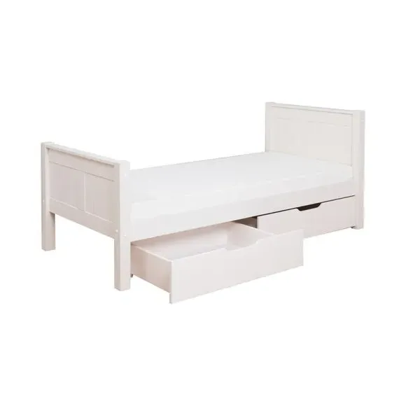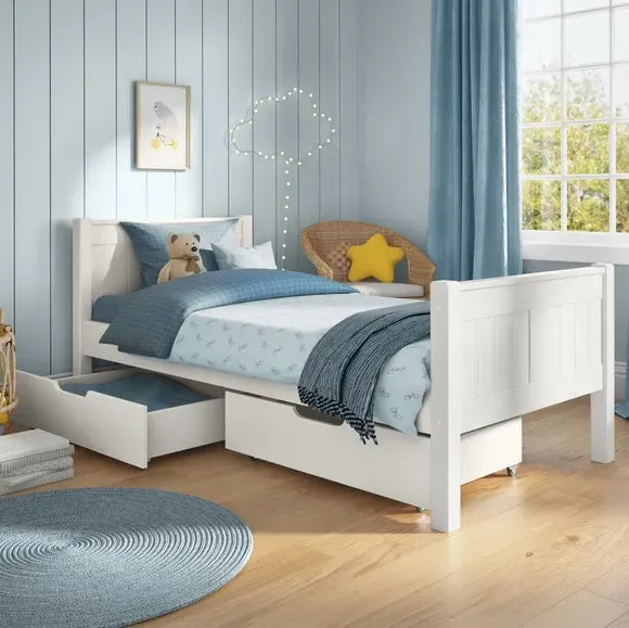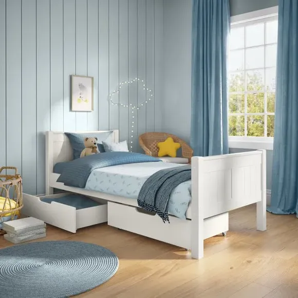 * Pine frame* High foot end* Slatted base* Assembled on delivery* Can only be delivered to mainland UK Featuring beautiful tongue and groove details on the headboard and footboard, this single bed is suitable for all ages. Crafted from solid pine, it offers a sturdy and durable build designed to last. The included pair of underbed drawers provides valuable storage space, perfect for linens, clothing, or toys, helping keep the room neat and organised.*Select the relevant options to purchase mattresses to fit this bed. You can choose between foam or pocket sprung mattresses.