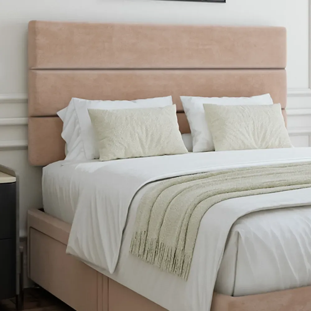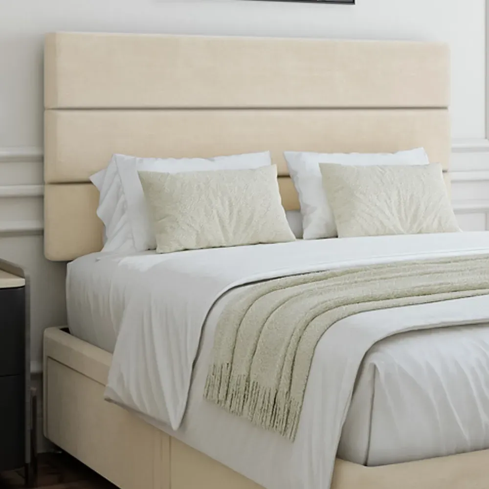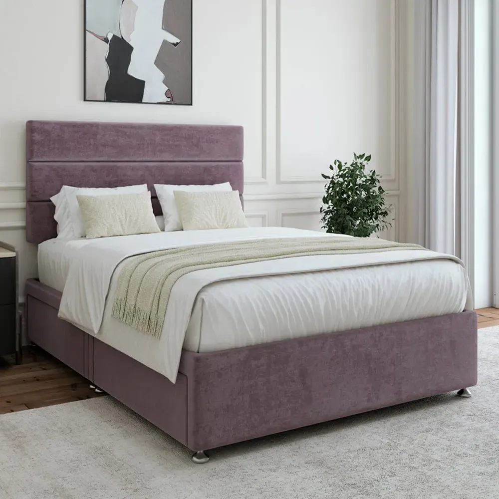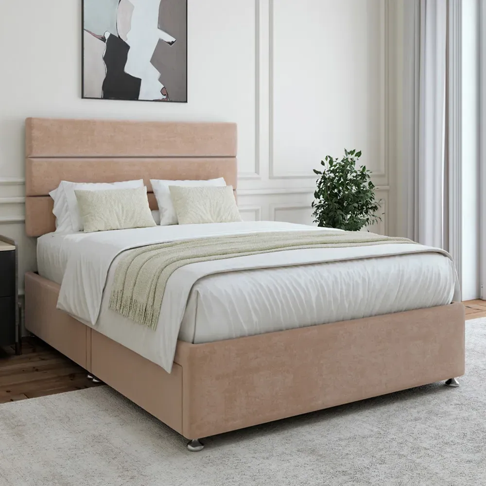 The divan base offers solid platform support with its firm foundation design, featuring the Milan headboard for added comfort. Its universal construction allows flexible placement of the headboard and storage on any side, while the chrome fittings and gliders add durability. The Naples velvet finish ensures lasting quality and provides a comfortable sleeping foundation.