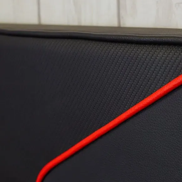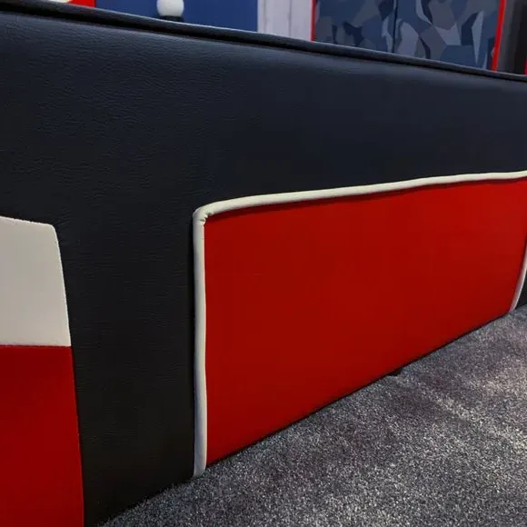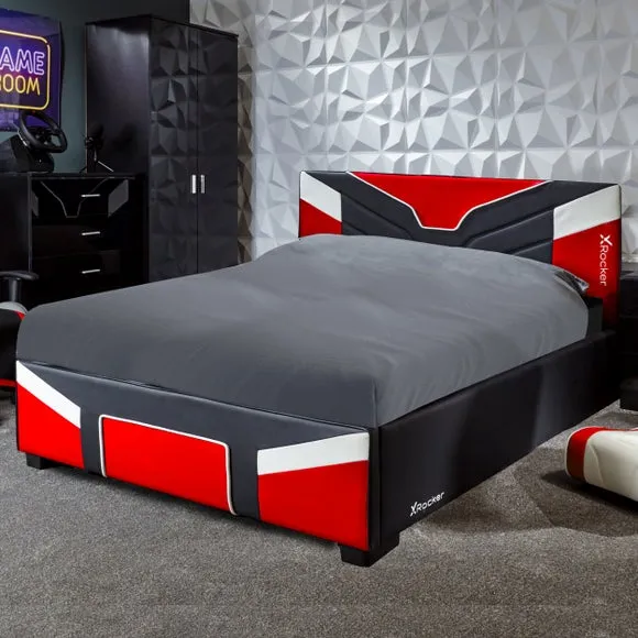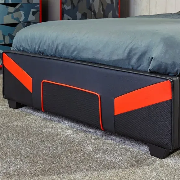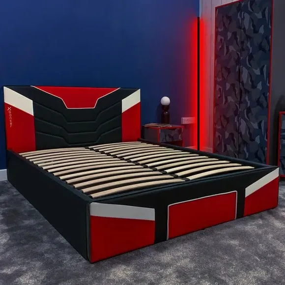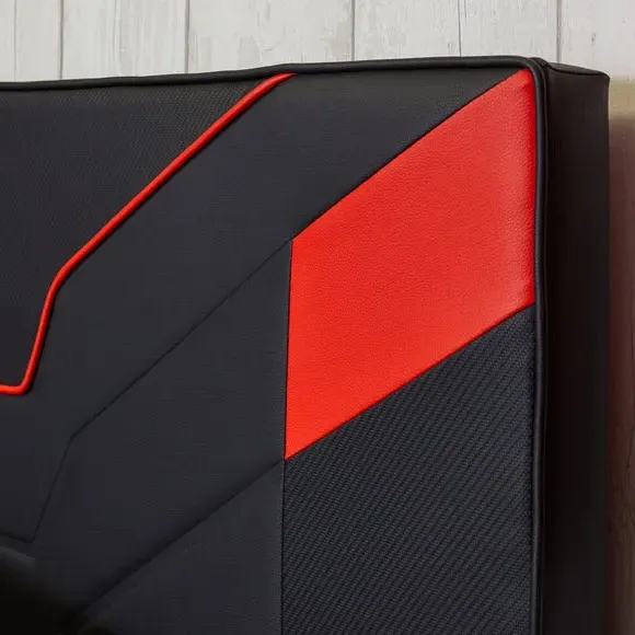 * Metal Gaming Bed* Faux Leather Upholstery This piece is a revolutionary gaming bedstead designed for the dedicated gamer's lifestyle. Arriving conveniently in a flat-packed carton, this MKII version boasts a space-saving build, featuring a striking red and black PU finish with deboss patterning, drawing inspiration from the adrenaline-fueled world of e Sports. With sturdy wooden bed slats, it ensures durability and support for gaming, sleep, or leisure activities, bringing the thrill of competitive gameplay right into your bedroom.