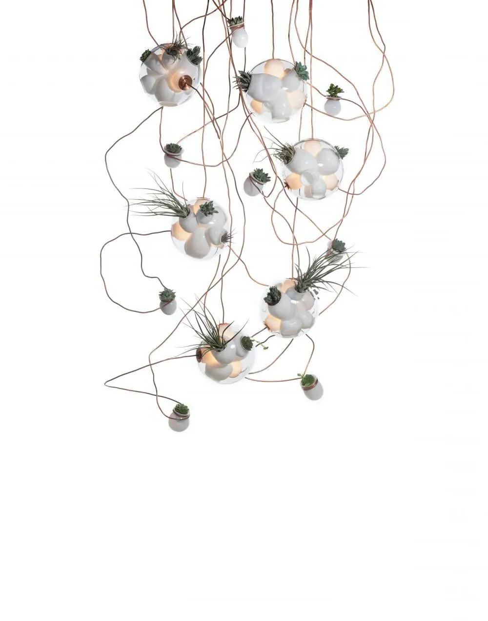The pendant light set features blown glass spheres with interior cavities that create unique visual patterns. Its copper tubing hardwire system allows individual cable installation through the round canopy mounting. The glass cavities accommodate small plants like succulents and air plants, while the 10W Xenon bulbs provide warm illumination. The fixed-length cables connect to a ceiling-mounted canopy for secure installation.