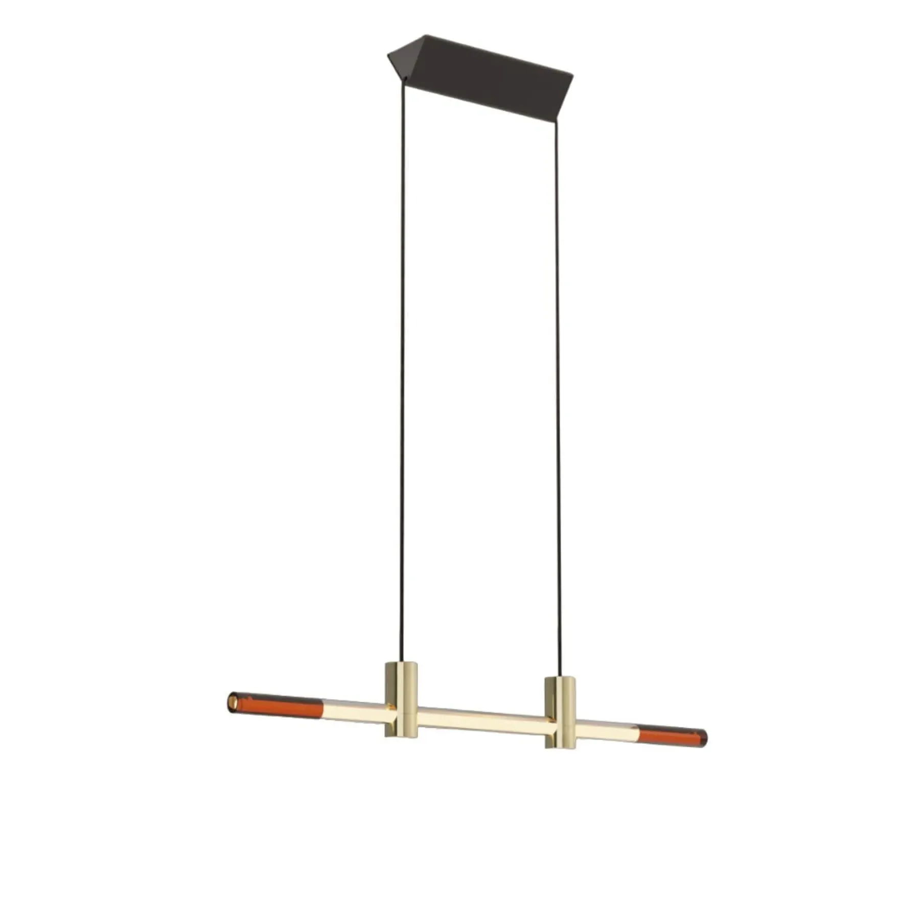 The Ra Line Pendant Light features a distinctive borosilicate glass tube that pierces through its supports, creating a striking interplay of contrasts. Its hand-bent glass encases LED tubes with adjustable colour temperature from 2700k to 4000k, while delivering up to 1900 lumens of warm, inviting light. The clear glass construction with gold accents adds visual depth, and the medium size suits various ceiling heights.