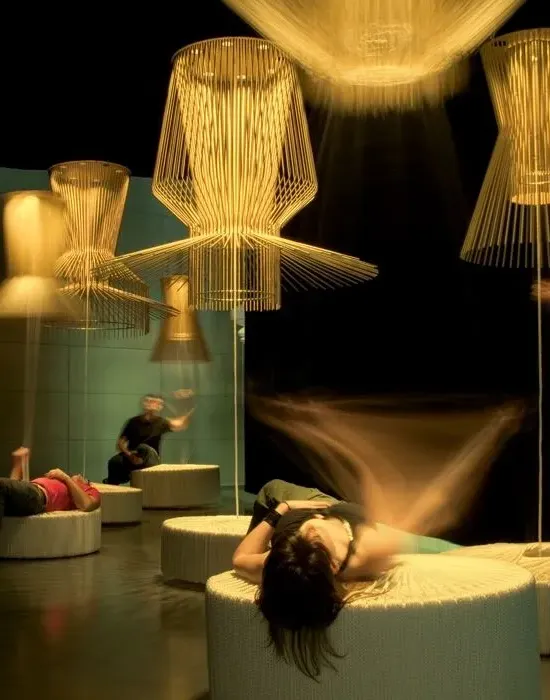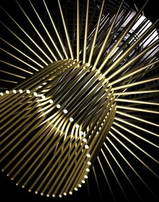 The Allegro pendant light offers elegant design with its sculpted lacquered aluminium construction. Its intricate shade provides effective illumination while softening the light source's glow for balanced ambient lighting. Featuring oscillation capability, the aluminium element vibrates and emits a soft sound that adds musicality to any space. The weightless style and detailed craftsmanship make this pendant suitable for various interior settings.