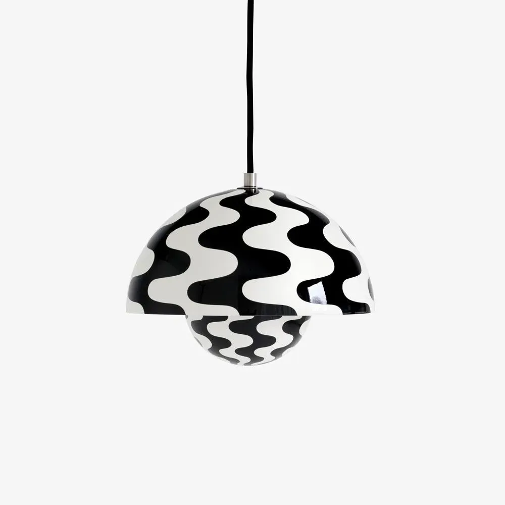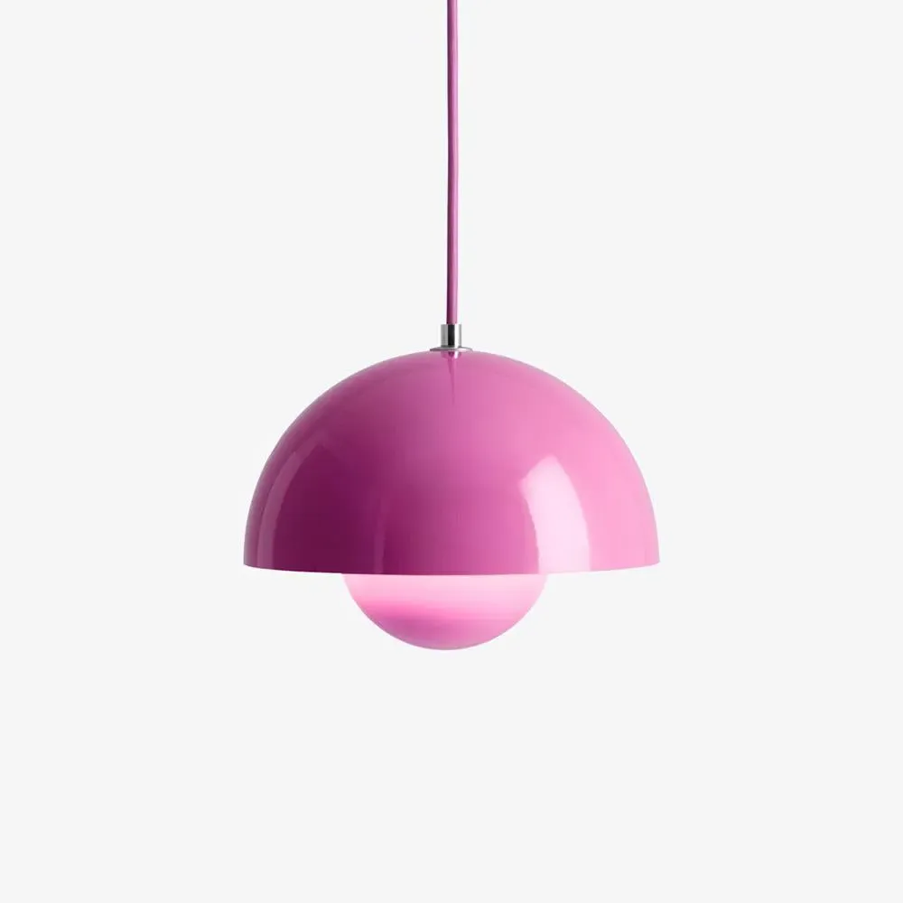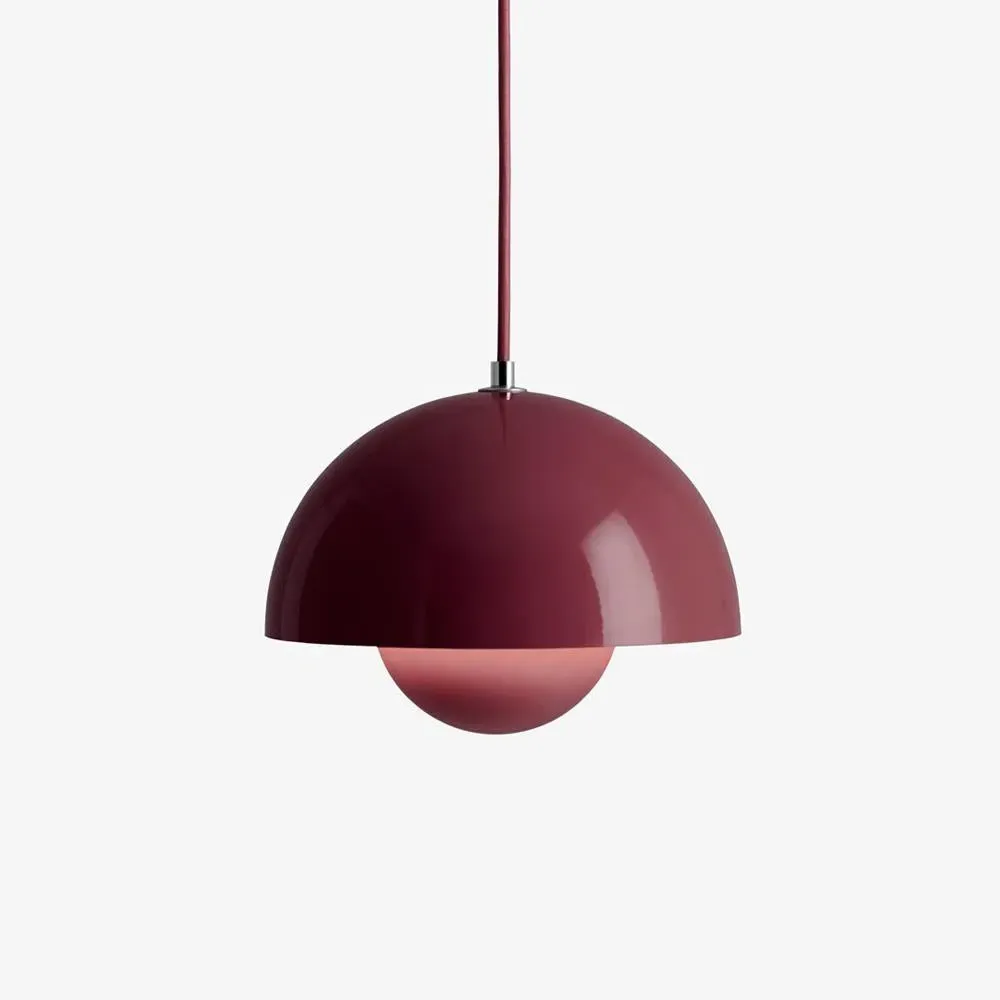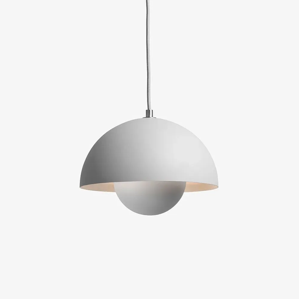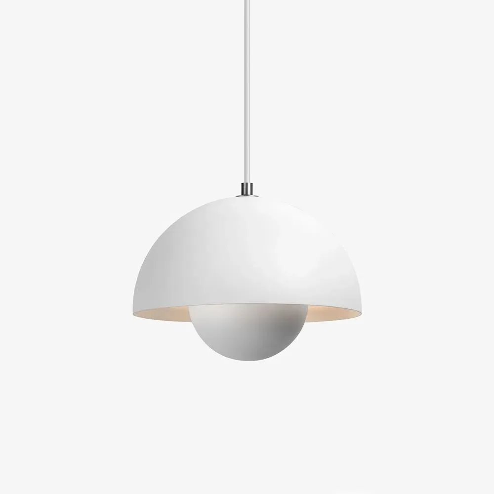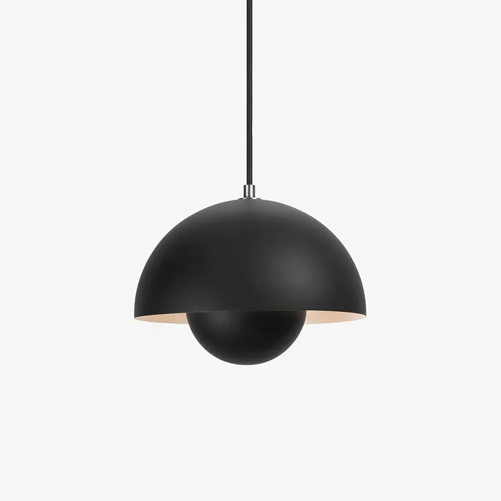 The VP1 Flowerpot Pendant Light offers iconic design with its two semicircular spheres facing each other, creating a distinctive silhouette reminiscent of a blooming flower. Its geometric form conceals the light source while reflecting and diffusing warm light throughout the space. The pendant features Verner Panton's 1969 design that combines functionality with visual appeal, and the dual hemisphere construction provides comfortable ambient lighting.