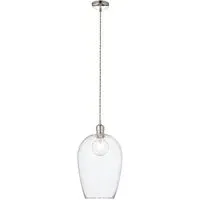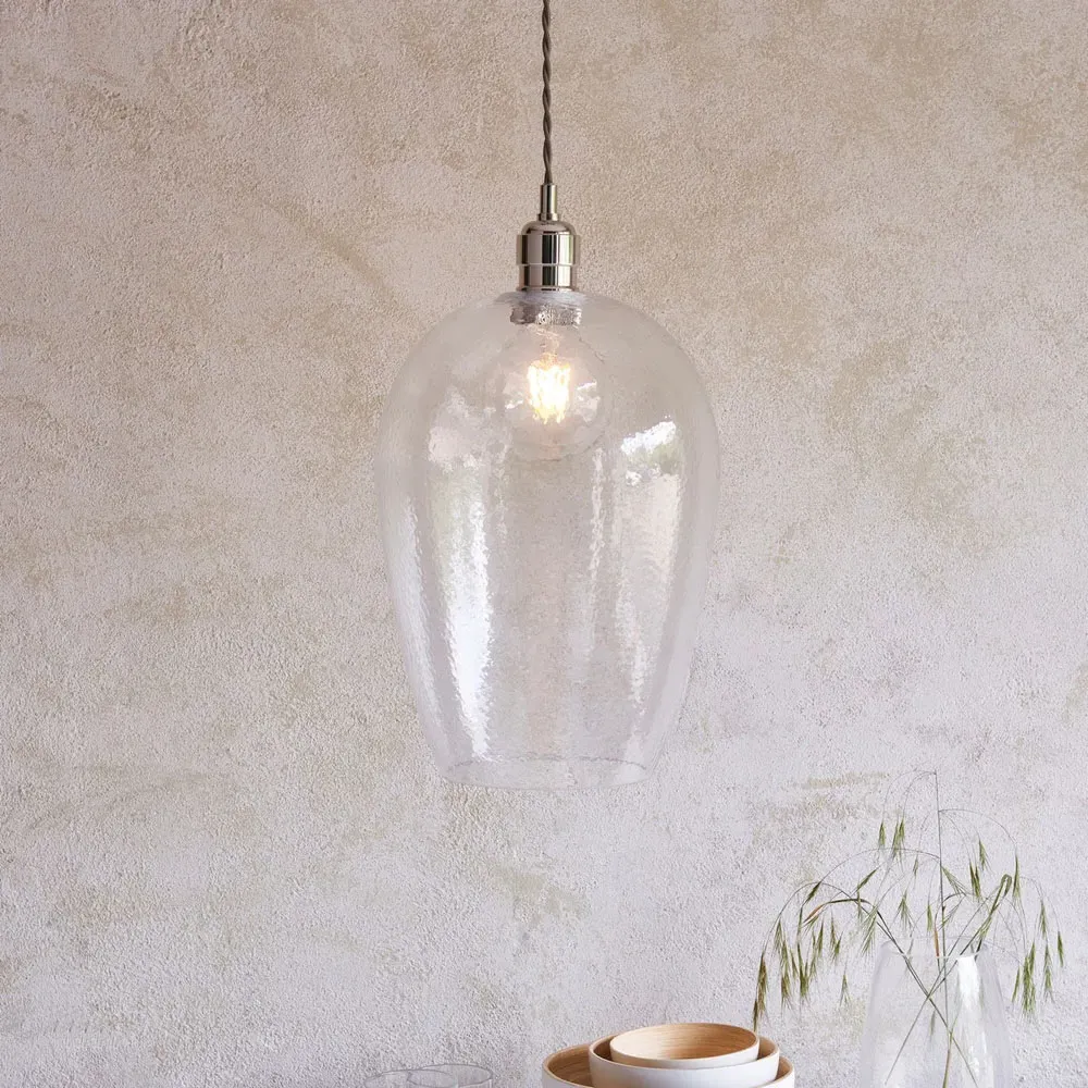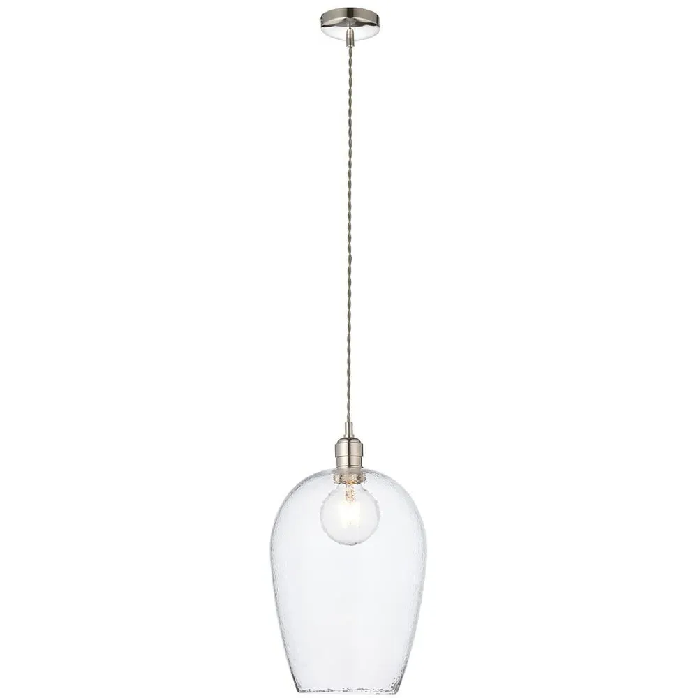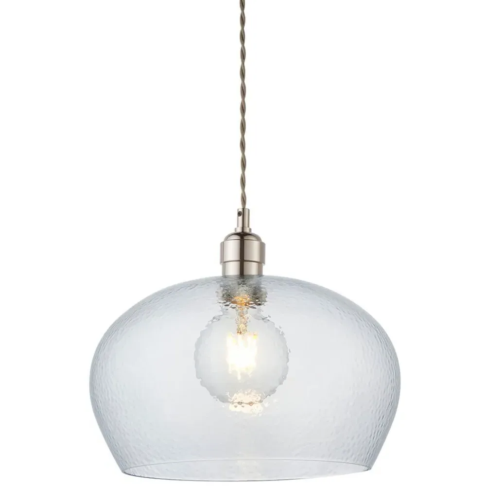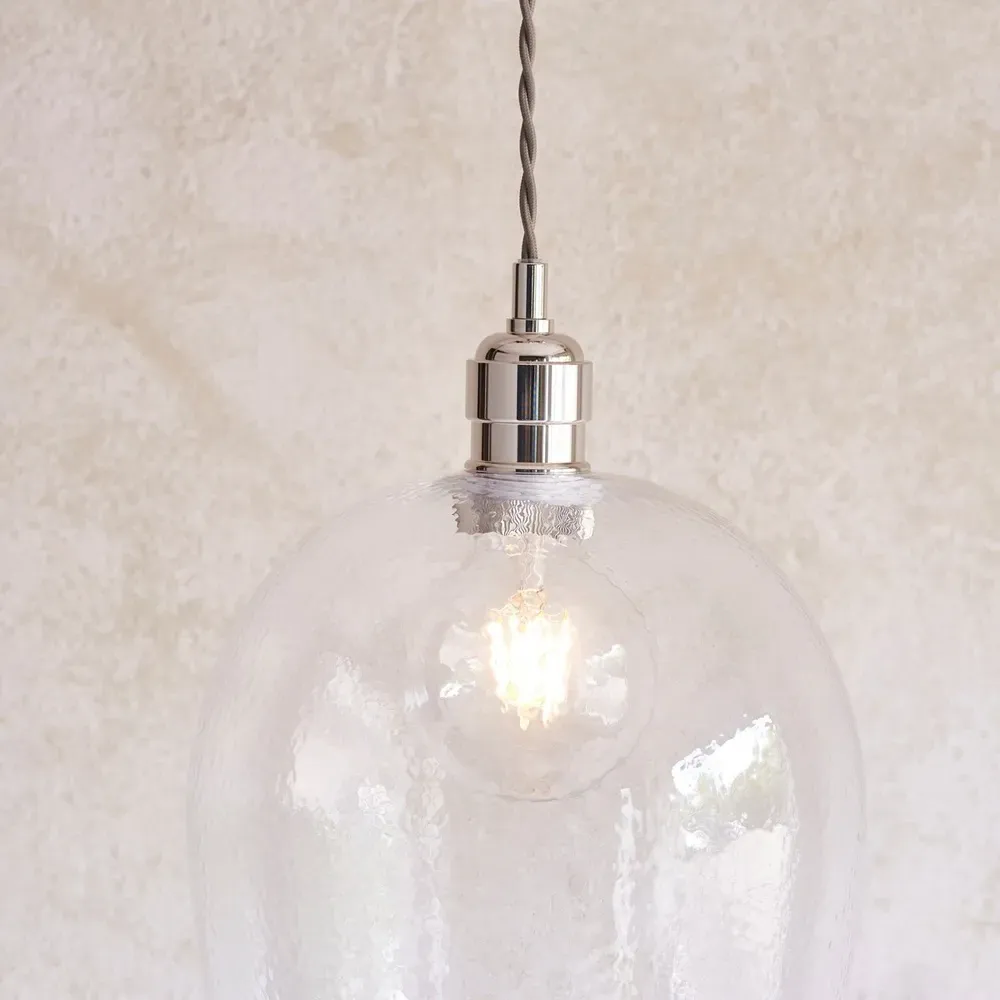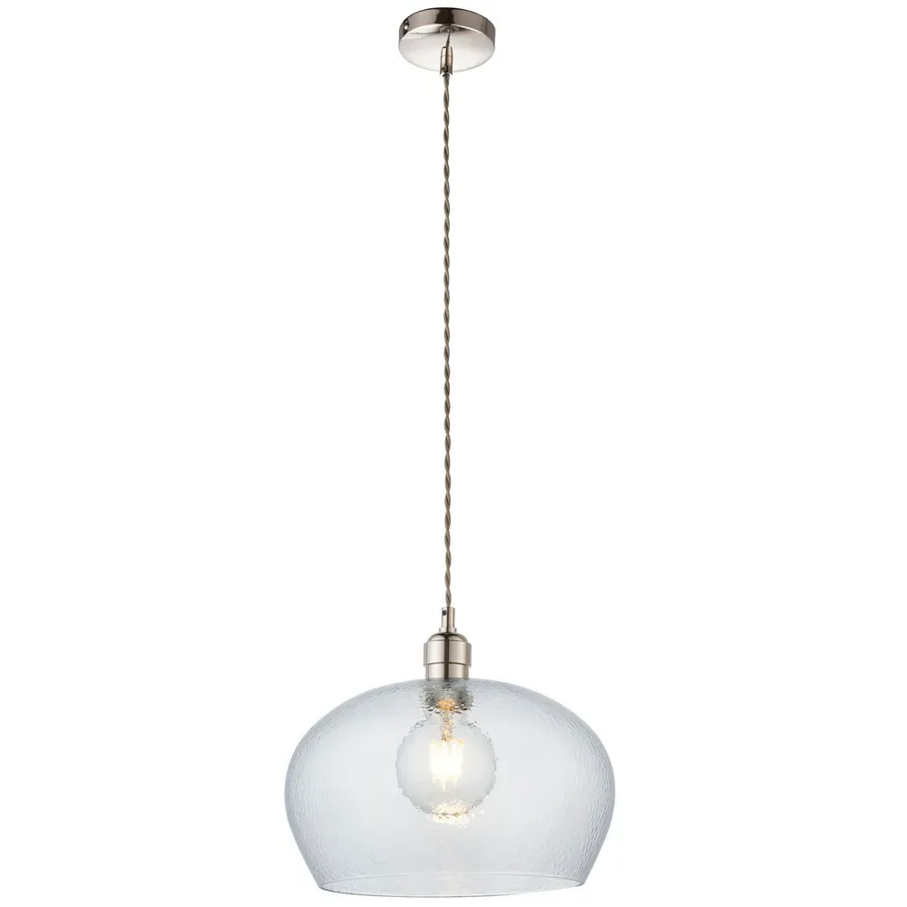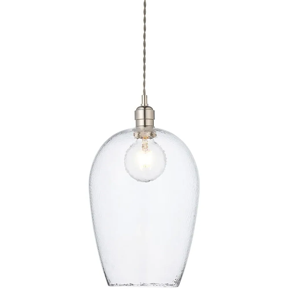 The Livorno Dome Pendant Ceiling Light features high-quality hammered effect clear blown glass with polished nickel metalwork. Its height-adjustable 1.2-metre chain with twisted grey fabric cable provides installation flexibility, while the dimmable function allows for customized lighting levels. The twin filament lamps create distinctive illumination, and the hammered glass dome adds textural interest to any space.