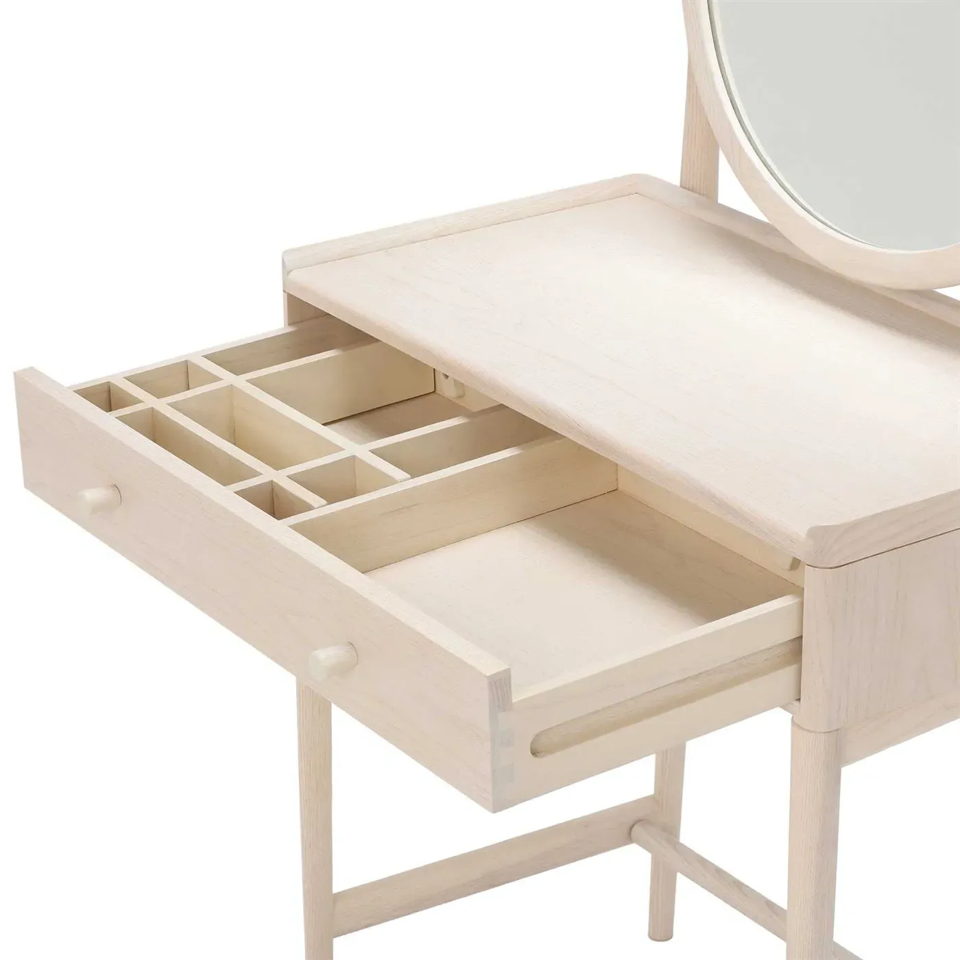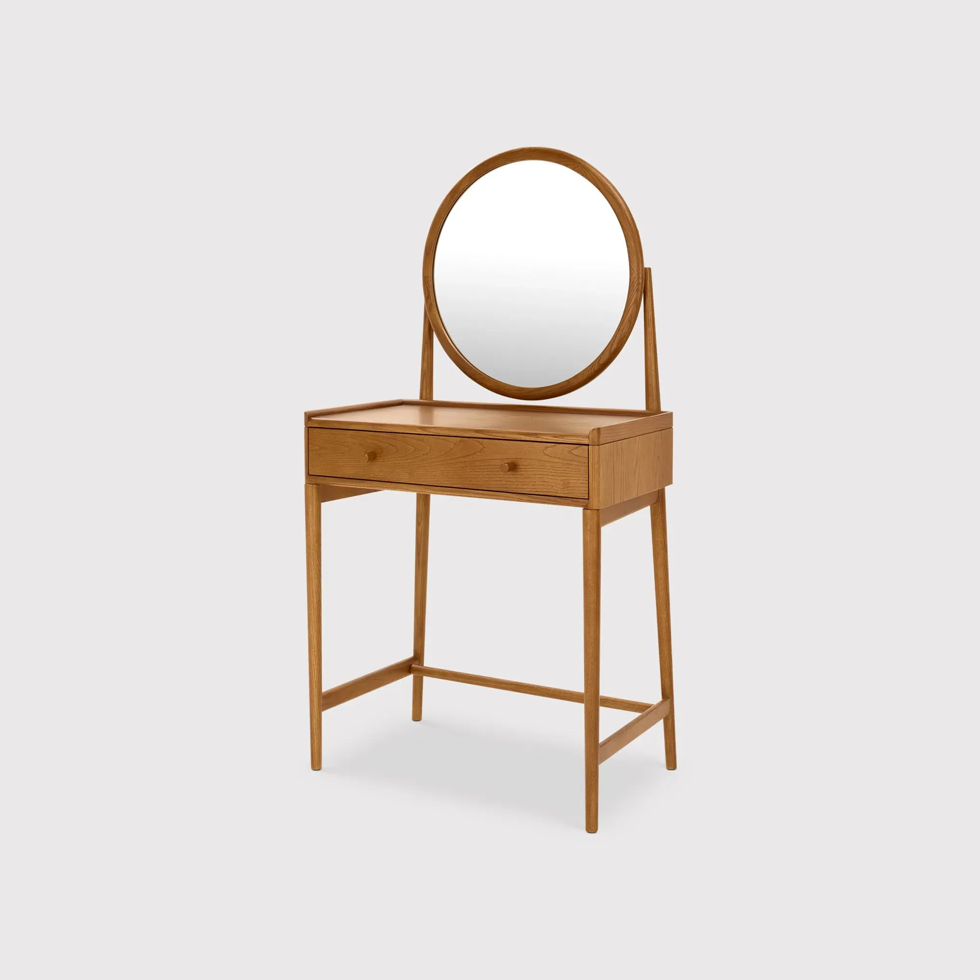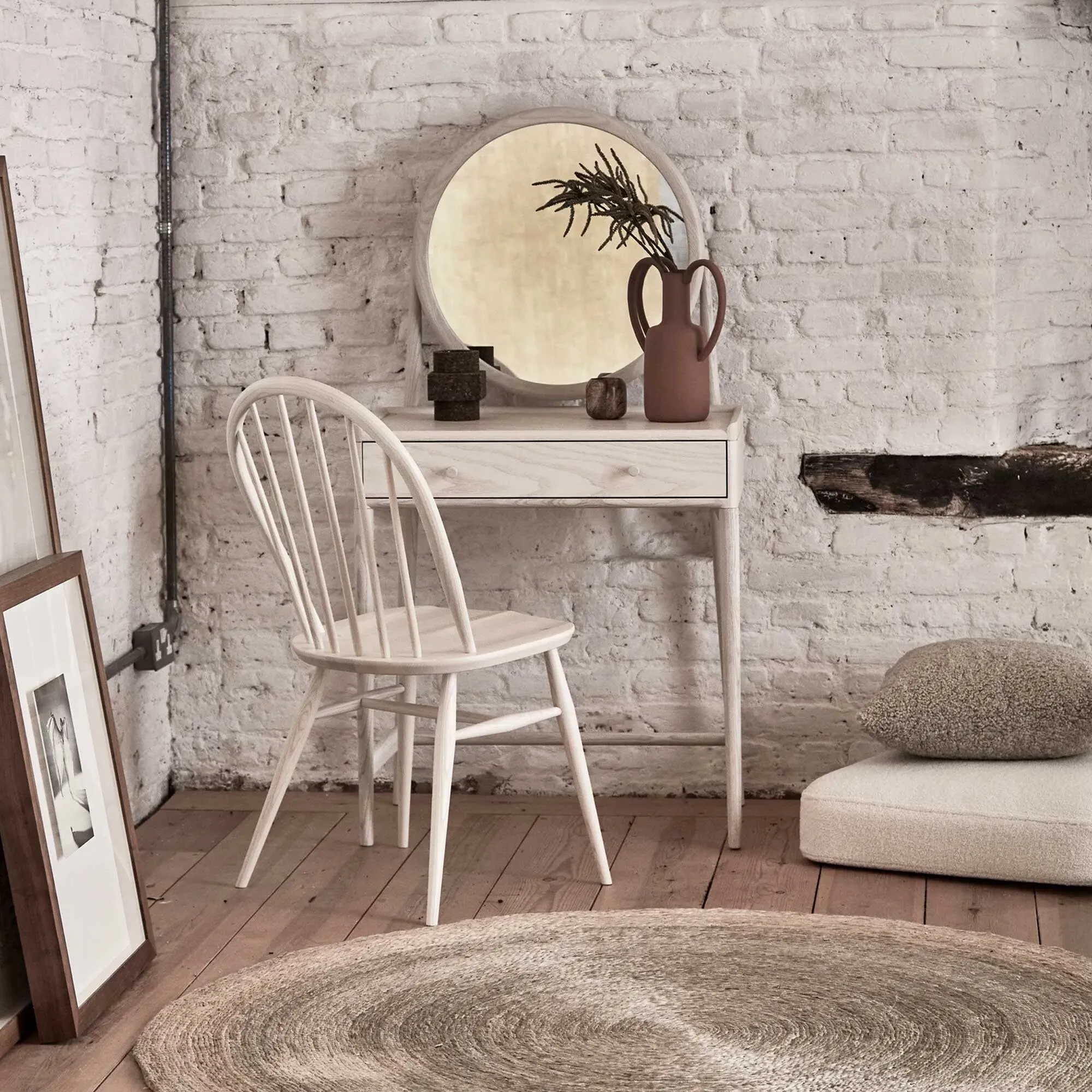 The Ercol Salina Dressing Table Stool features solid ash construction with ash veneers for natural strength and refined finish. Its compact design provides comfortable seating while maintaining the wood's inherent durability. The neutral wood tone coordinates with the matching dressing table, creating a cohesive bedroom ensemble.