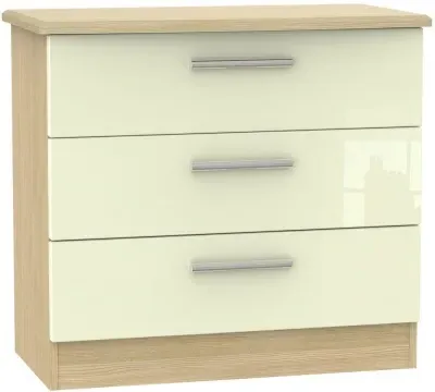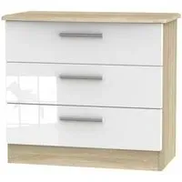 The Knightsbridge chest offers quality UK craftsmanship with its fully assembled construction and scratch-resistant vinyl finish. Its three drawers feature linen-effect interiors and high-quality runners, while the black gloss fronts complement the light oak carcase. The durable construction ensures long-lasting performance, and the ready-assembled delivery provides immediate convenience.