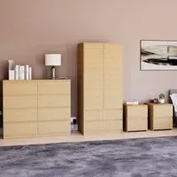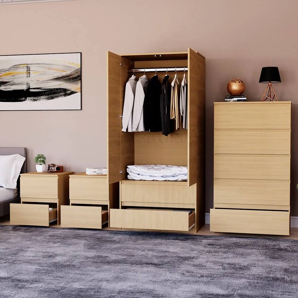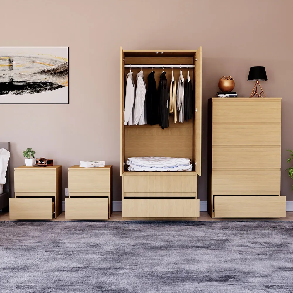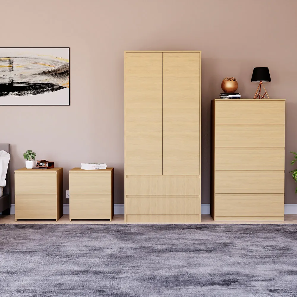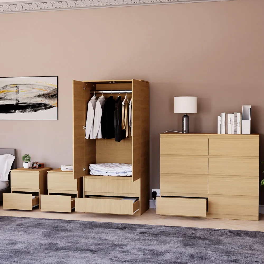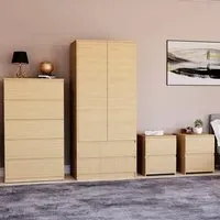 The bedroom furniture set offers coordinated storage with its matching wardrobe and drawer chests, featuring clean lines and a warm pine finish. The four-piece collection provides comprehensive organisation with large bedside chests and a 2-door wardrobe, while the 3-drawer chest adds extra storage capacity. Its thoughtful design suits various bedroom layouts, and the pine construction ensures durability with timeless appeal.