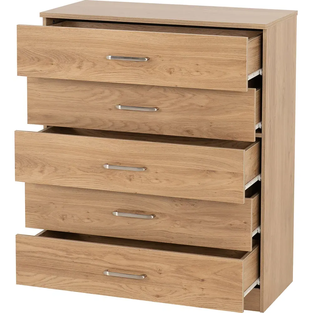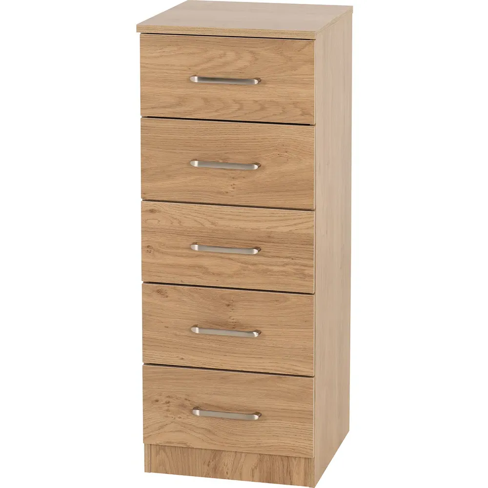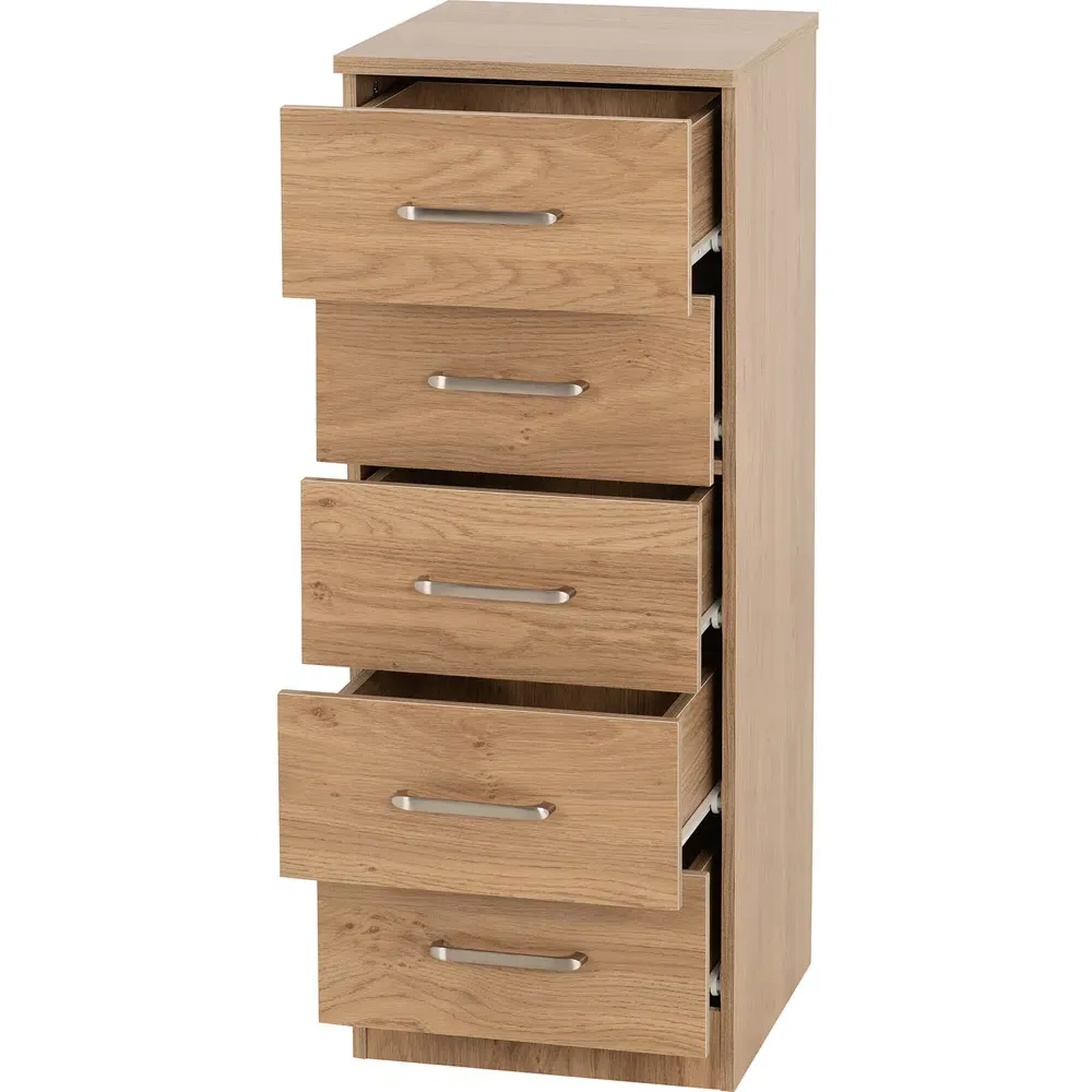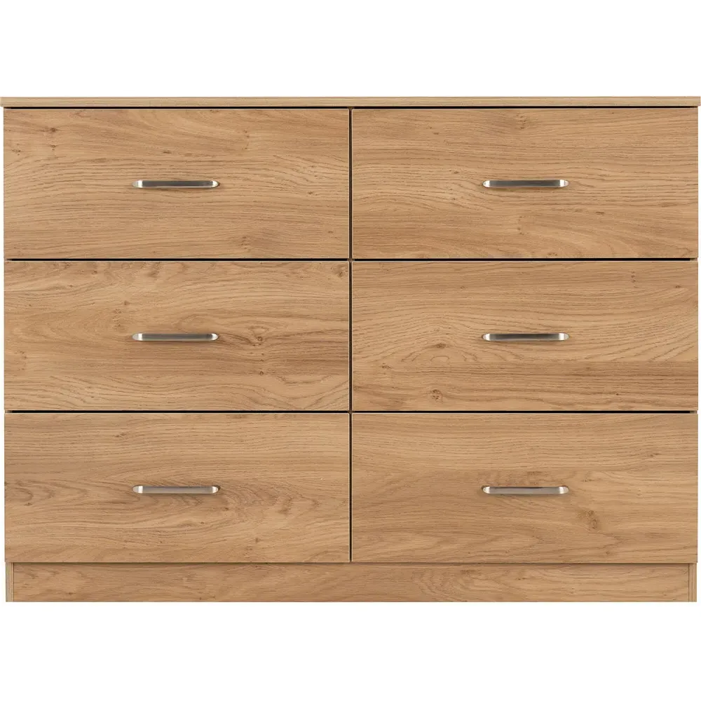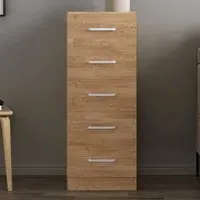 The Dakota storage chest offers practical organization with its four deep drawers, featuring sleek metal handles and sturdy construction. Its oak effect finish provides timeless appeal, while the spacious drawers help keep clothing and accessories neatly organized. The versatile design suits various décor styles, and the durable build ensures lasting reliability for everyday use.