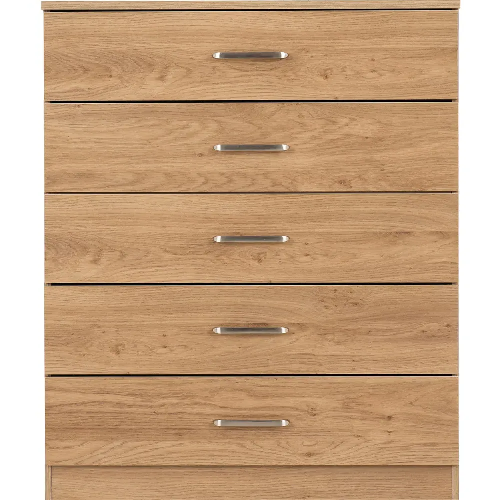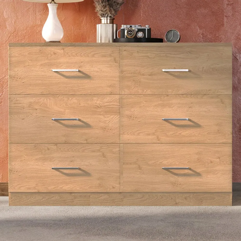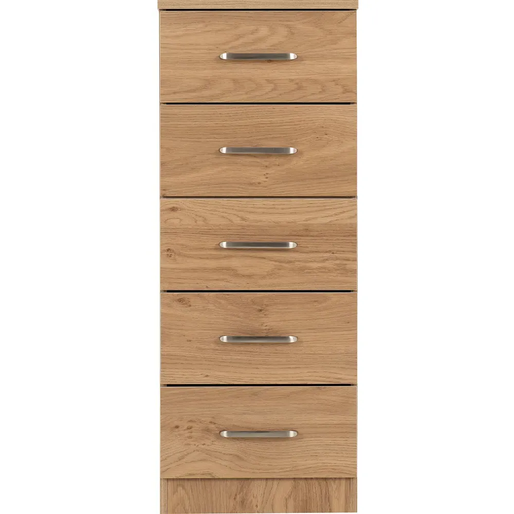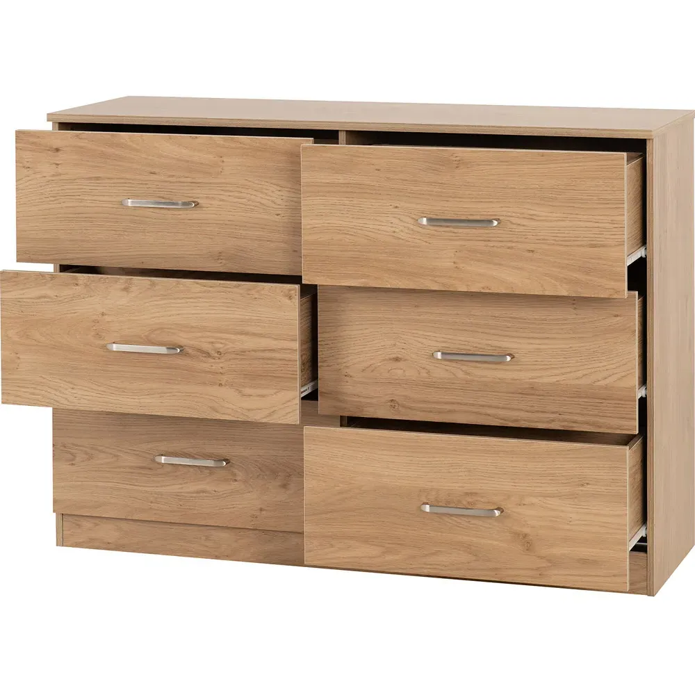 The Dakota storage chest offers practical organization with its four deep drawers, featuring sleek metal handles and sturdy construction. Its oak effect finish provides timeless appeal, while the spacious drawers help keep clothing and accessories neatly organized. The versatile design suits various décor styles, and the durable build ensures lasting reliability for everyday use.