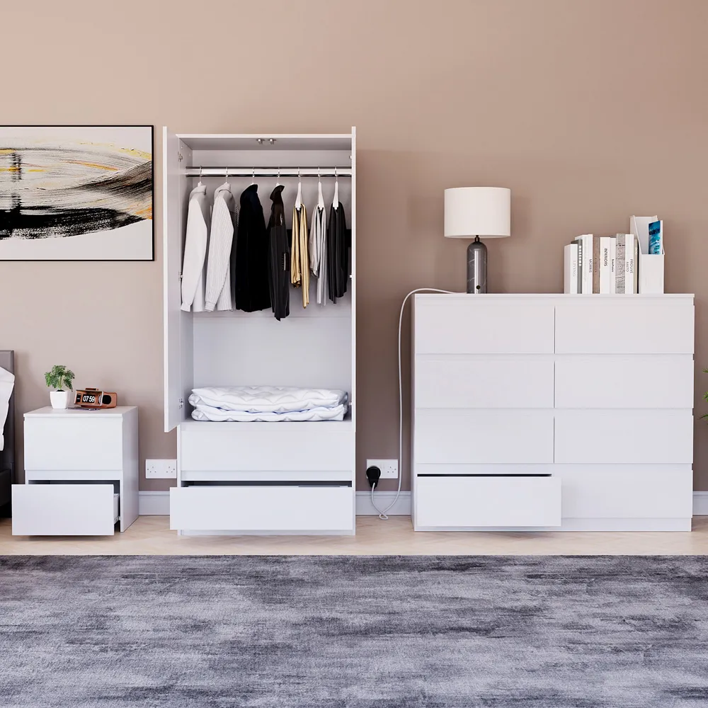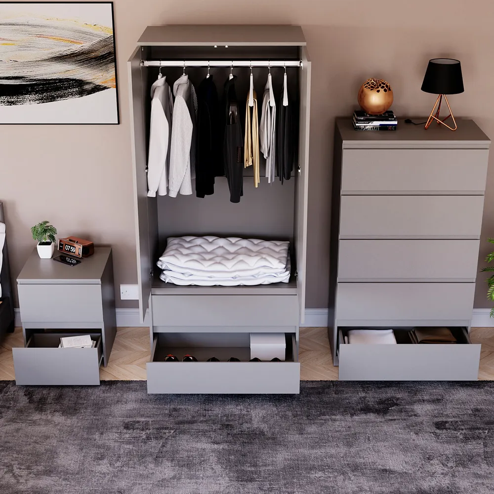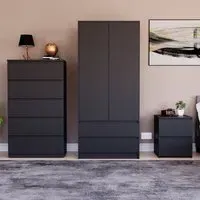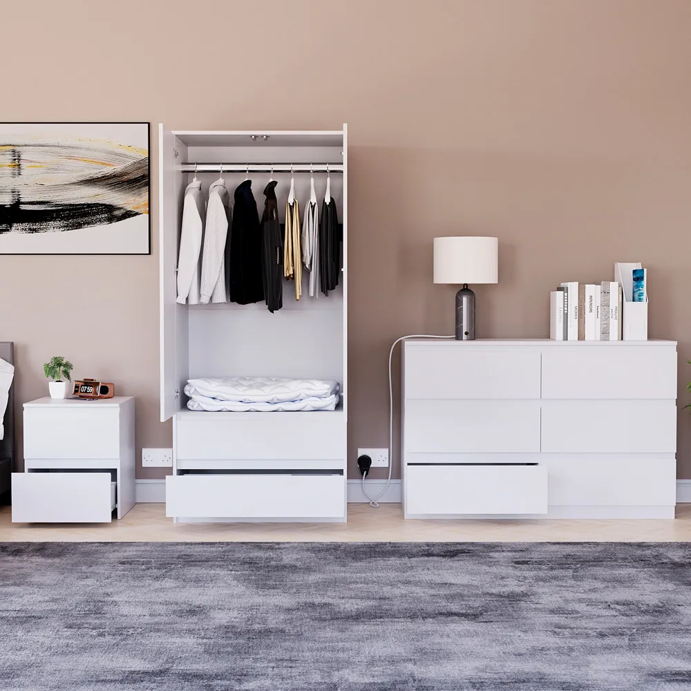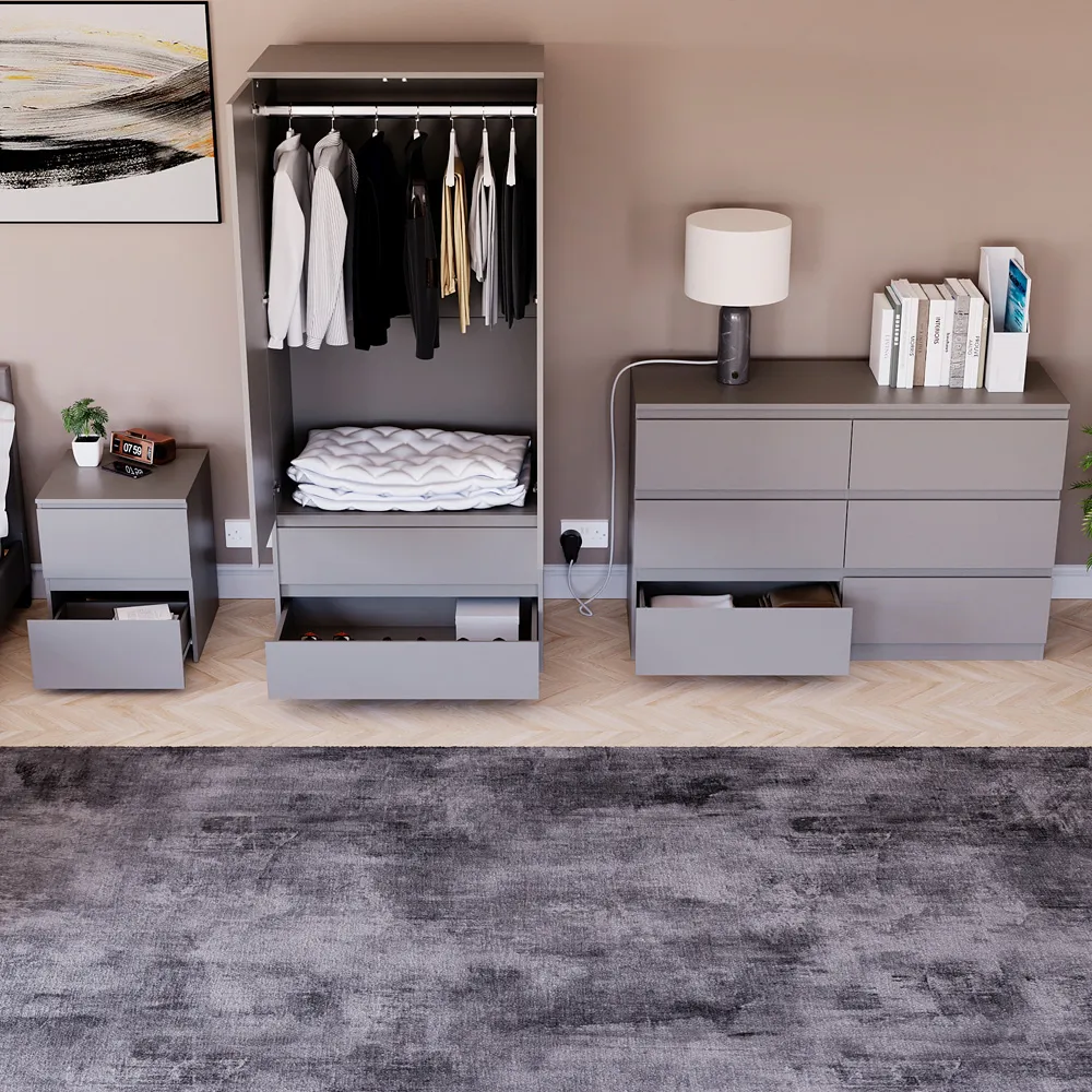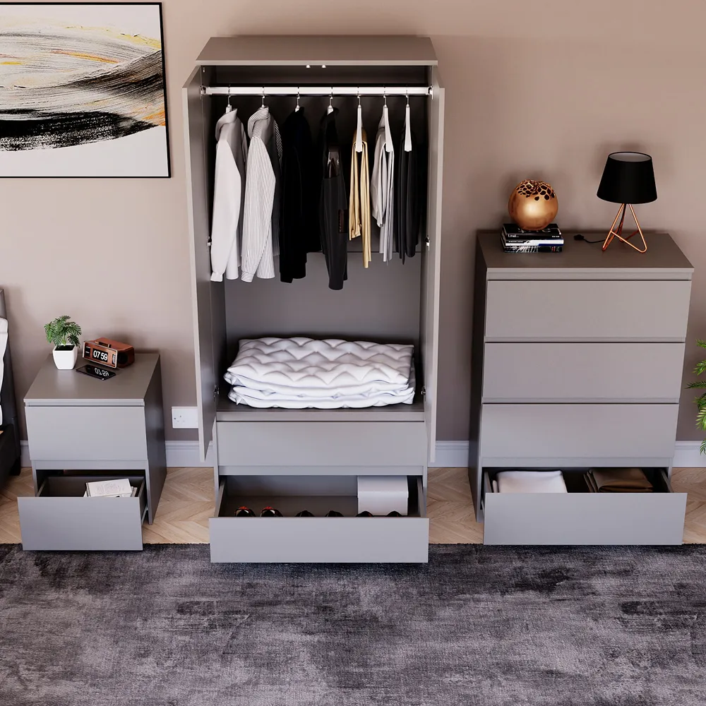 Transform your bedroom into a contemporary sanctuary with the Modern Denver Bedroom Furniture Set. Crafted with clean lines, premium finishes, and smart storage solutions, this collection is designed for both elegance and everyday living. The set includes a chest of three drawers, a wardrobe and a bedside table. Each piece effortlessly balances form and function, creating a cohesive look that keeps your space organised, modern, and inviting. Whether you’re updating a master suite or styling a guest room, the Modern Denver set brings timeless style and comfort to your home. Dimensions: Bedside table: H48 x W39.5 x D: 39.5cm, chest of drawers: H77.5 x W70 x D40cm and wardrobe: H170 x W76 x D53cm.