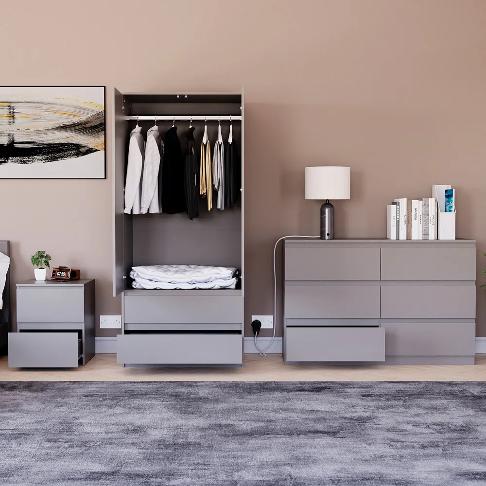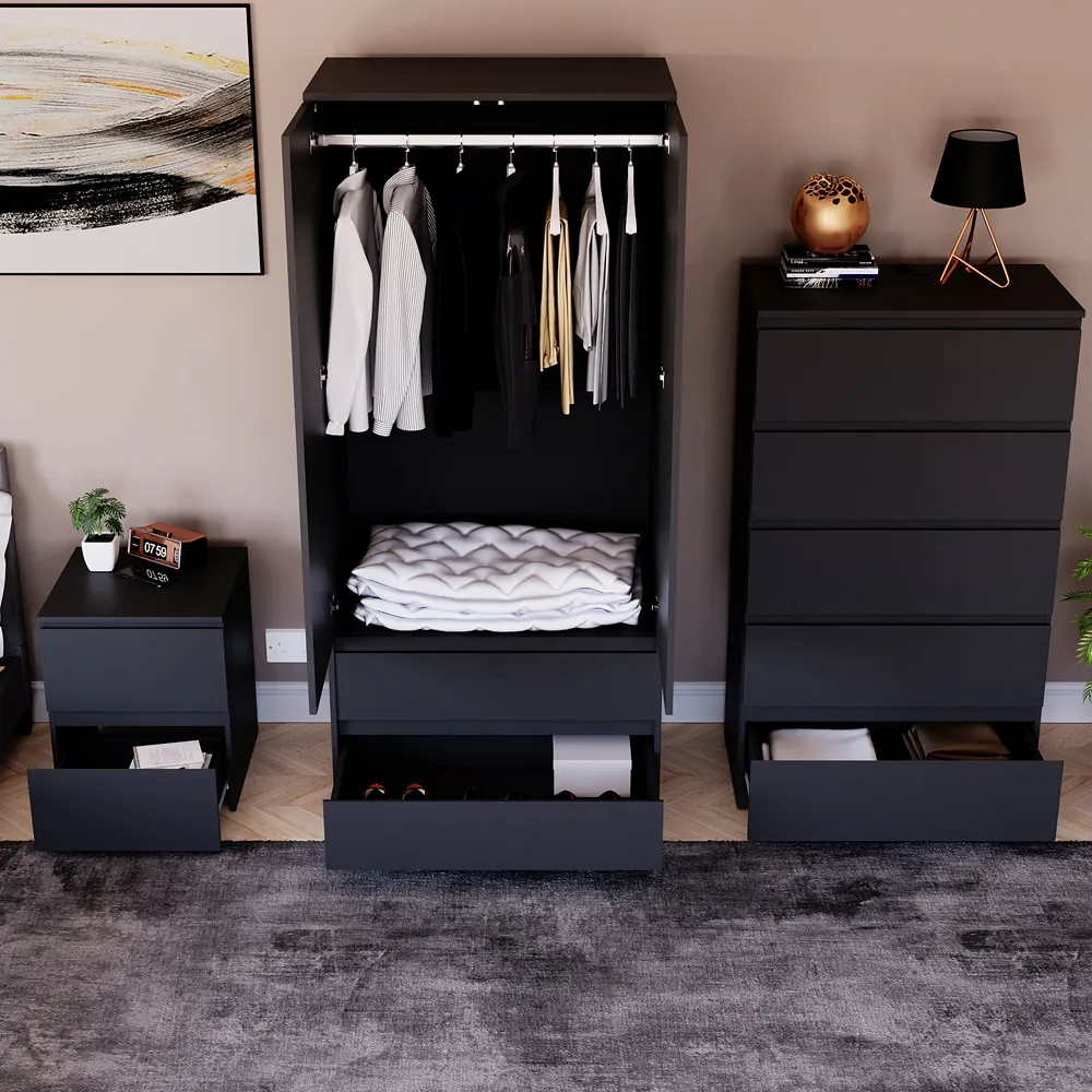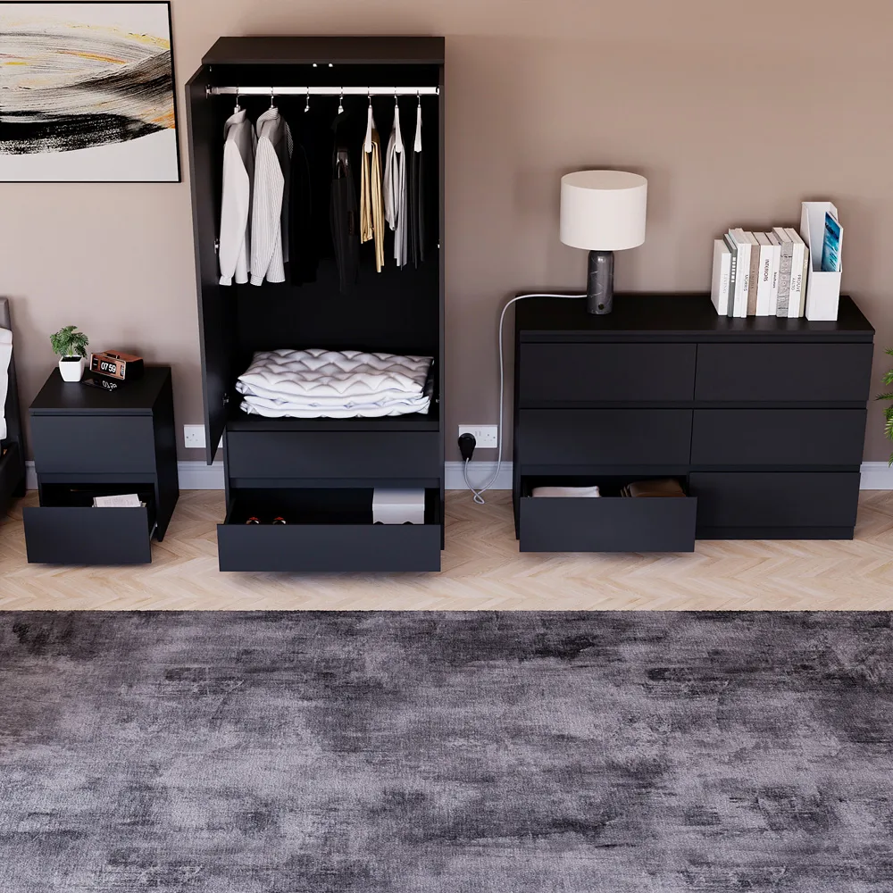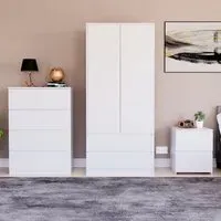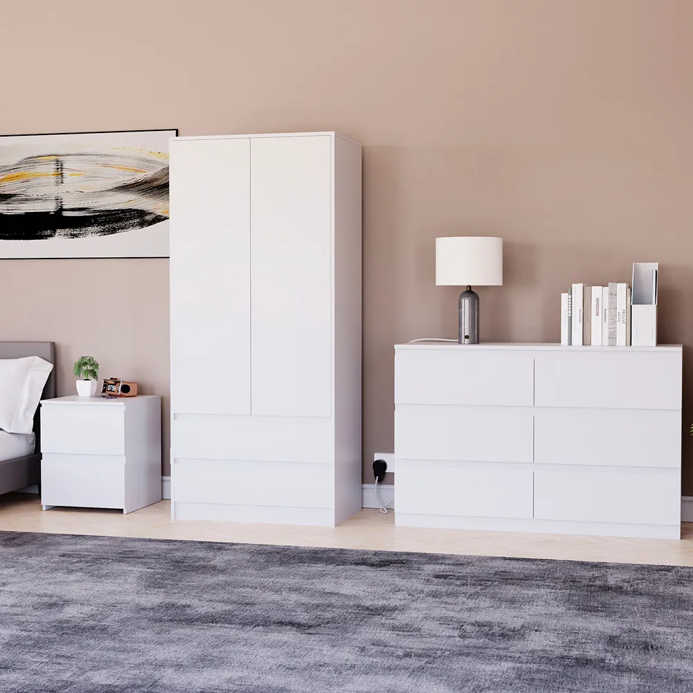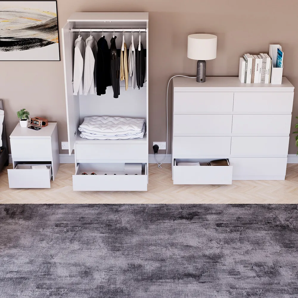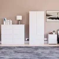 Transform your bedroom into a contemporary sanctuary with the Modern Denver Bedroom Furniture Set. Crafted with clean lines, premium finishes, and smart storage solutions, this collection is designed for both elegance and everyday living. The set includes a chest of three drawers, a wardrobe and a bedside table. Each piece effortlessly balances form and function, creating a cohesive look that keeps your space organised, modern, and inviting. Whether you’re updating a master suite or styling a guest room, the Modern Denver set brings timeless style and comfort to your home. Dimensions: Bedside table: H48 x W39.5 x D: 39.5cm, chest of drawers: H77.5 x W70 x D40cm and wardrobe: H170 x W76 x D53cm.
