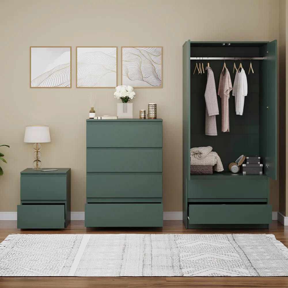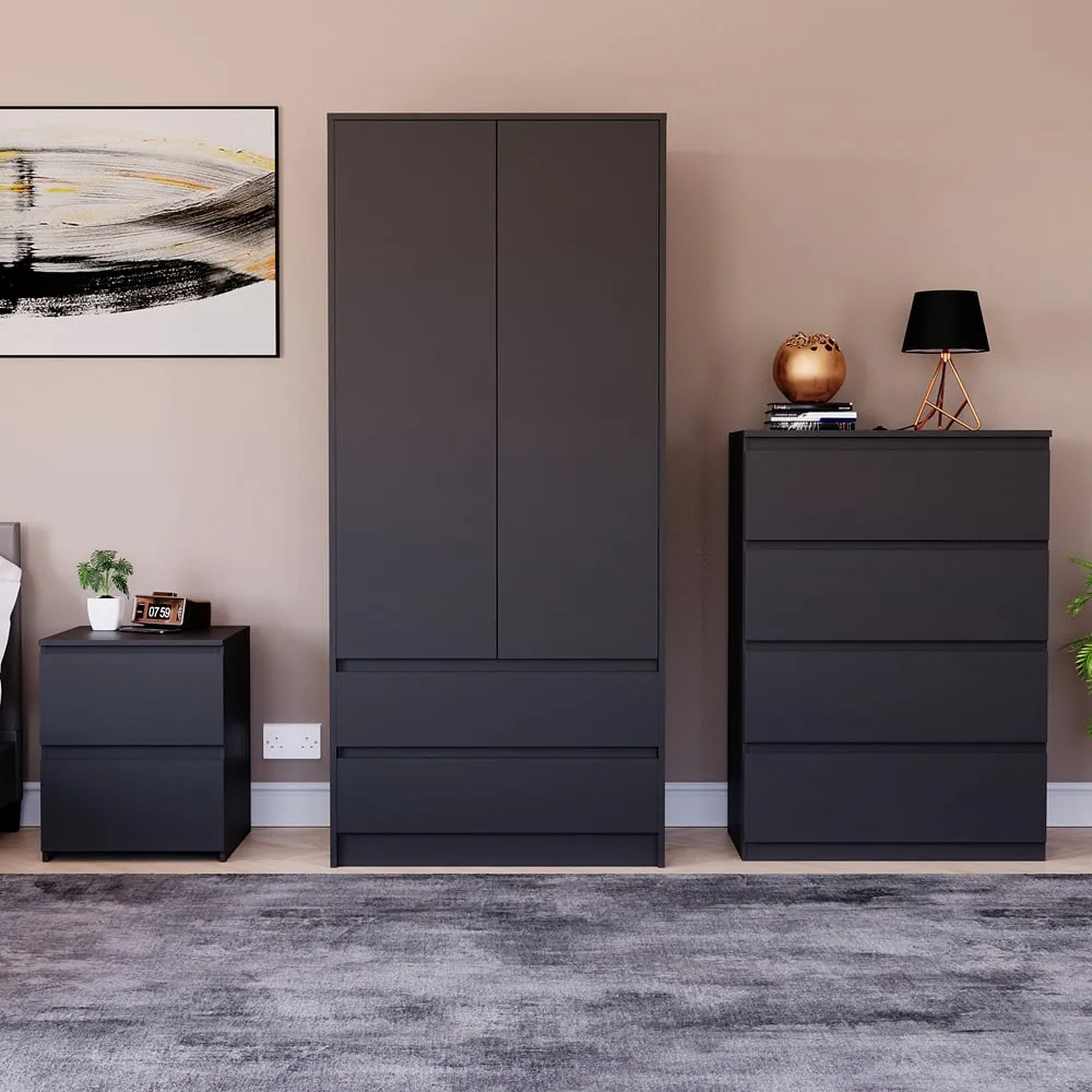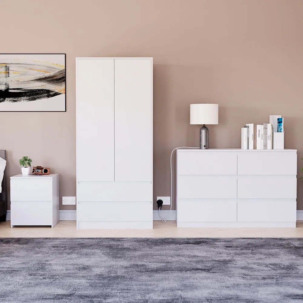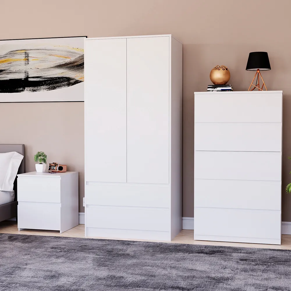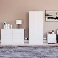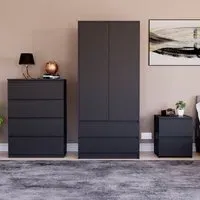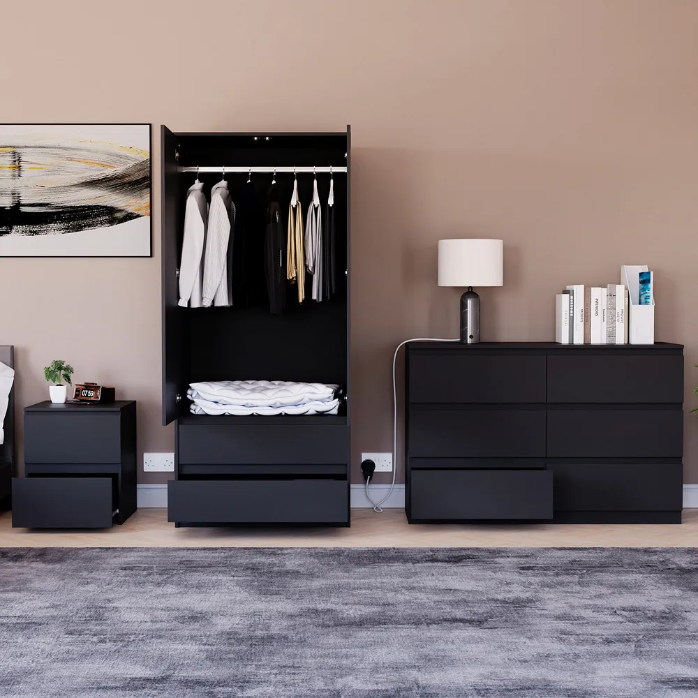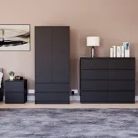 Transform your bedroom into a contemporary sanctuary with the Modern Denver Bedroom Furniture Set. Crafted with clean lines, premium finishes, and smart storage solutions, this collection is designed for both elegance and everyday living. The set includes a chest of three drawers, a wardrobe and a bedside table. Each piece effortlessly balances form and function, creating a cohesive look that keeps your space organised, modern, and inviting. Whether you’re updating a master suite or styling a guest room, the Modern Denver set brings timeless style and comfort to your home. Dimensions: Bedside table: H48 x W39.5 x D: 39.5cm, chest of drawers: H77.5 x W70 x D40cm and wardrobe: H170 x W76 x D53cm.