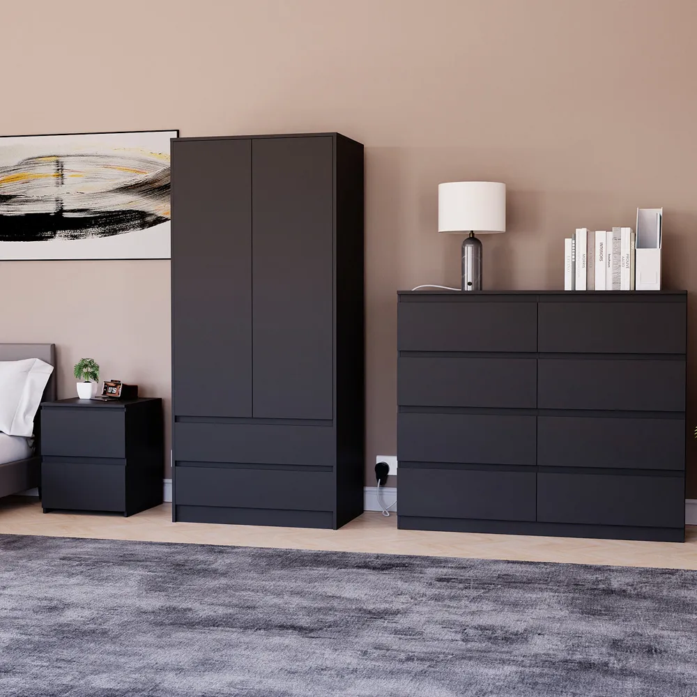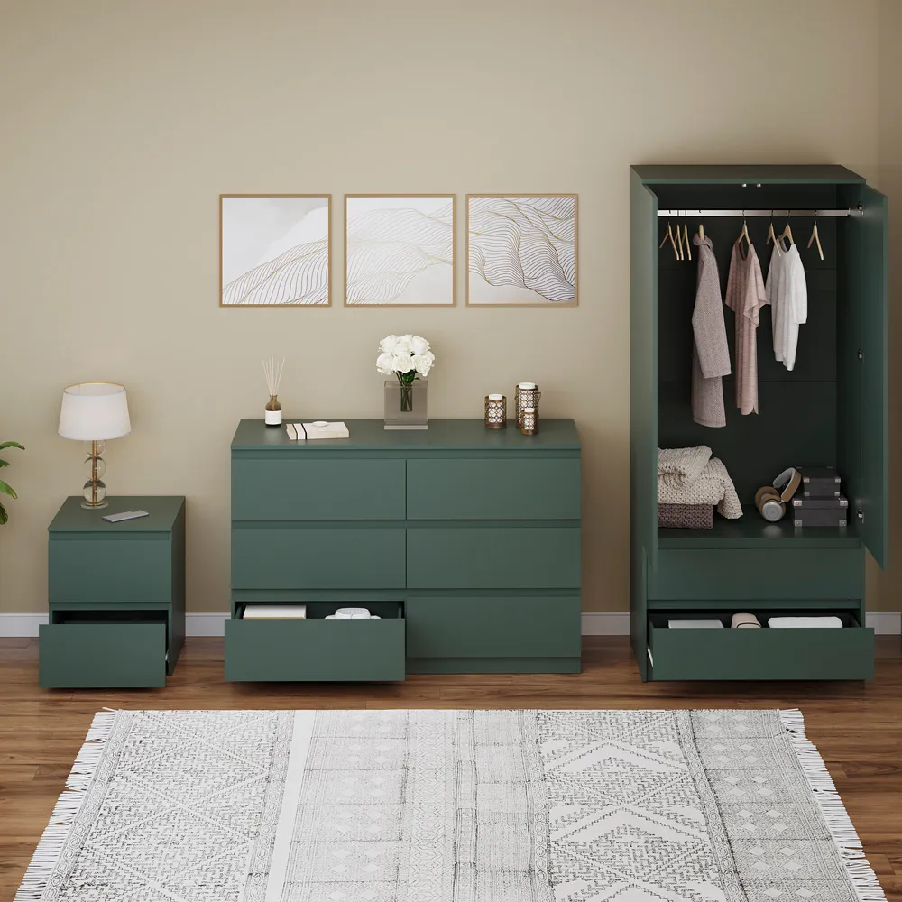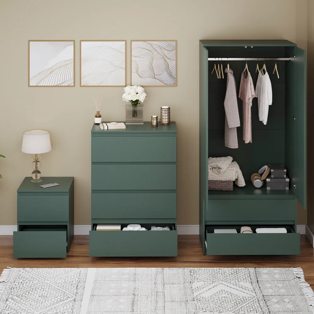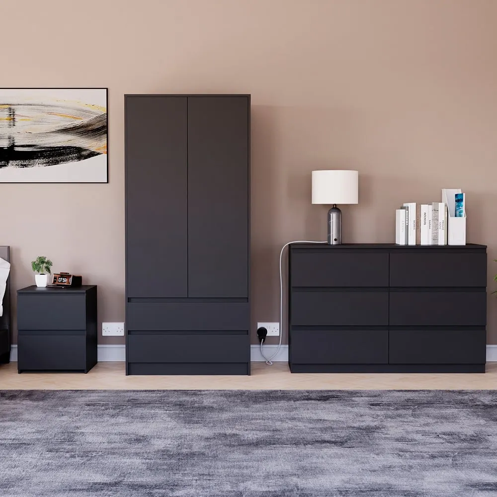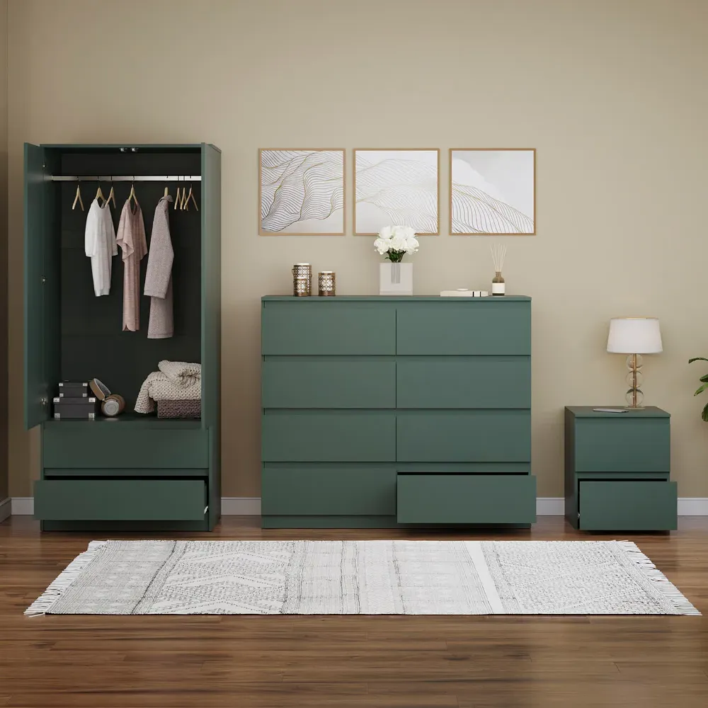 Transform your bedroom into a contemporary sanctuary with the Modern Denver Bedroom Furniture Set. Crafted with clean lines, premium finishes, and smart storage solutions, this collection is designed for both elegance and everyday living. The set includes a chest of three drawers, a wardrobe and a bedside table. Each piece effortlessly balances form and function, creating a cohesive look that keeps your space organised, modern, and inviting. Whether you’re updating a master suite or styling a guest room, the Modern Denver set brings timeless style and comfort to your home. Dimensions: Bedside table: H48 x W39.5 x D: 39.5cm, chest of drawers: H77.5 x W70 x D40cm and wardrobe: H170 x W76 x D53cm.