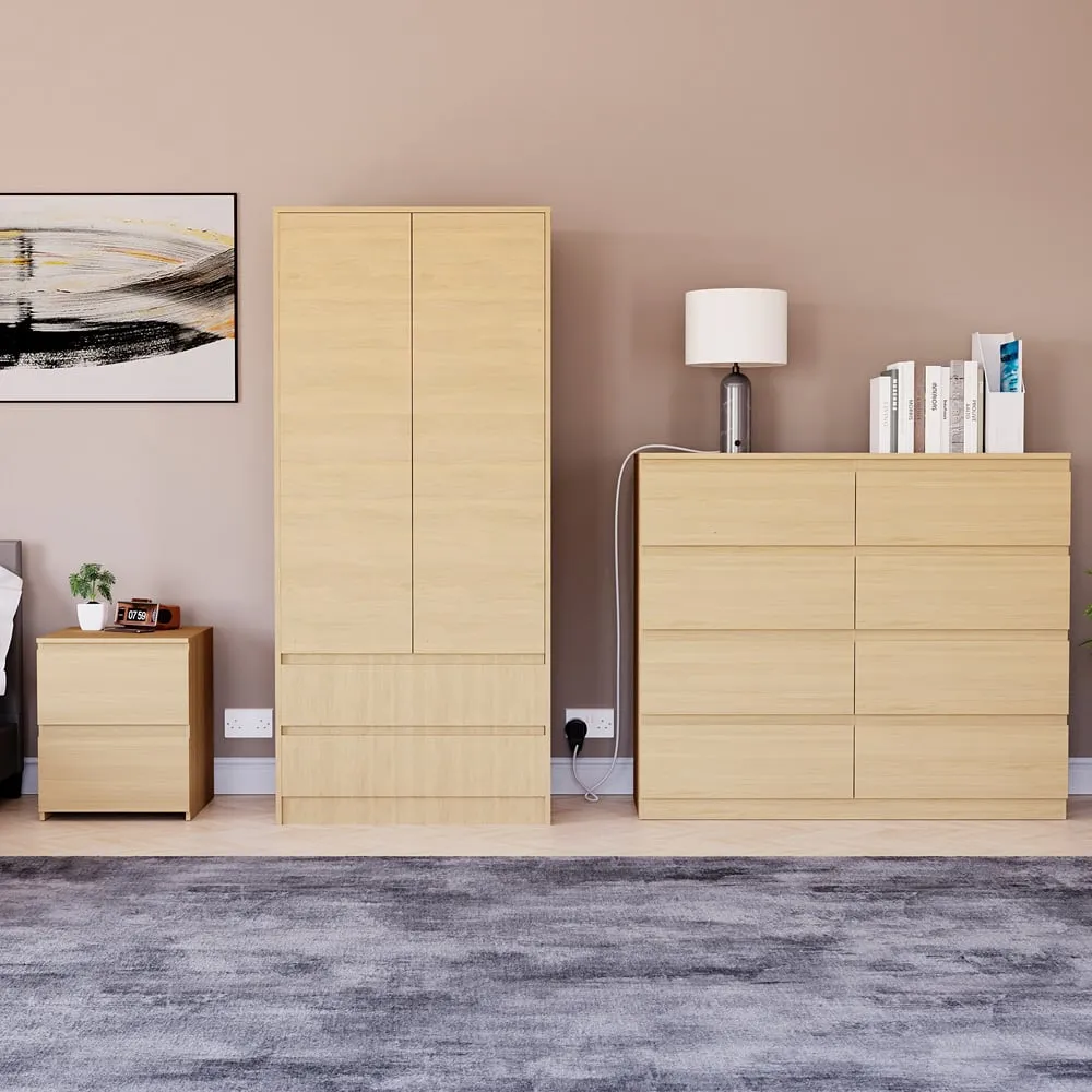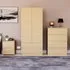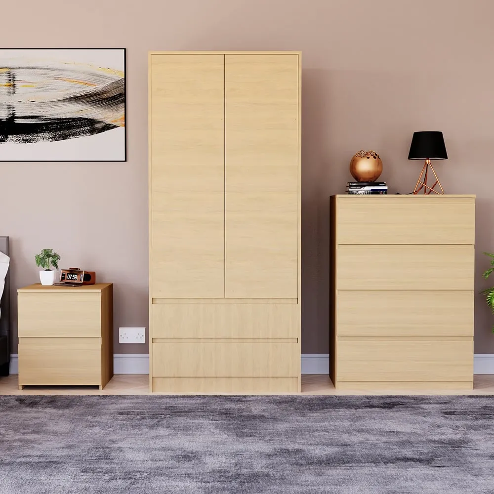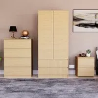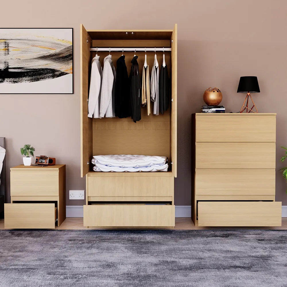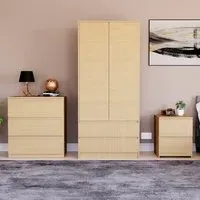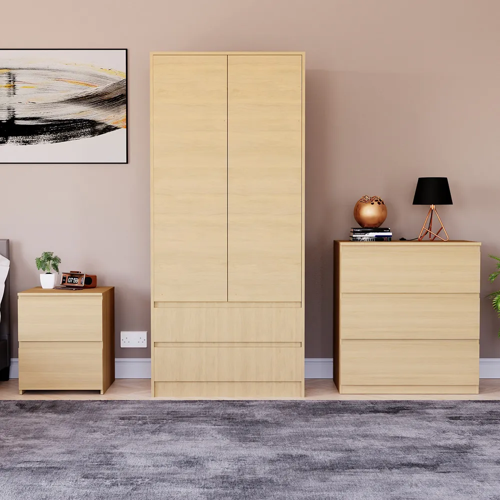 The Denver Bedroom Furniture Set offers coordinated storage with its three-piece collection, featuring clean lines and smart organization solutions. The set includes a three-drawer chest, wardrobe, and bedside table that work together to create a cohesive look. Each piece provides dedicated storage space while maintaining consistent styling throughout your bedroom. The sturdy construction ensures reliable daily use across all components. Bedside table: W39.5 x D39.5 x H48 cm, chest of drawers: W70 x D40 x H77.5 cm, wardrobe: W76 x D53 x H170 cm.