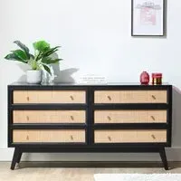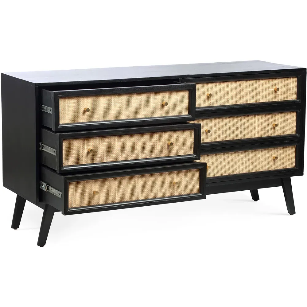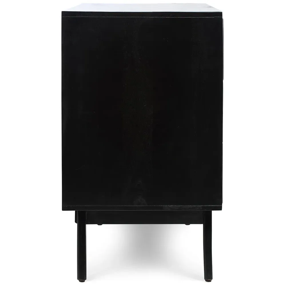 Make a classic addition to your bedroom with the Desser Venice Bedside Table. This compact black bedside table has a high-quality functional design, and it is crafted using solid mango wood with natural rattan front panels. Featuring two drawers with decent storage space for your essentials, it has a classic pattern suitable for most bedrooms. This durable bedside table finished with tapered hardwood feet is perfect for all types of interiors due to its subtle, traditional look. Drawer size: 15 x 45 x 36cm.
