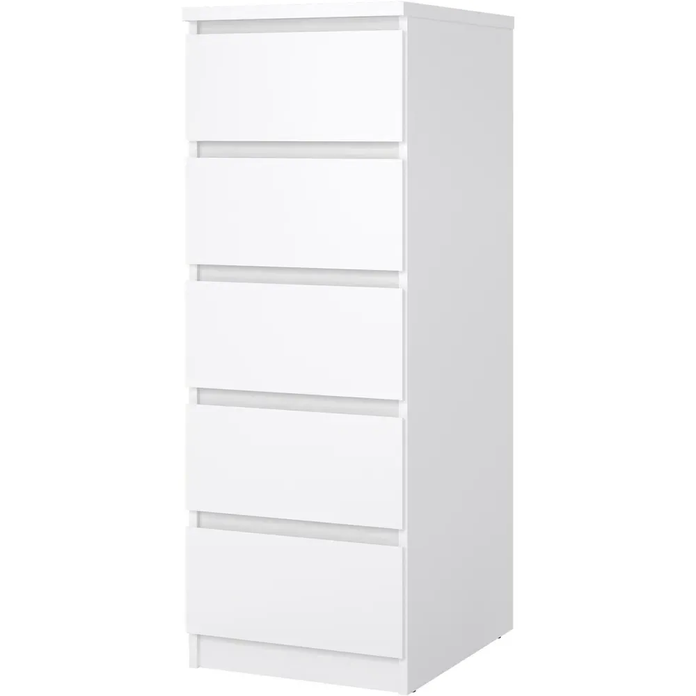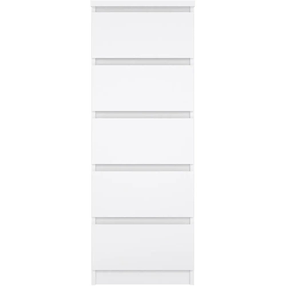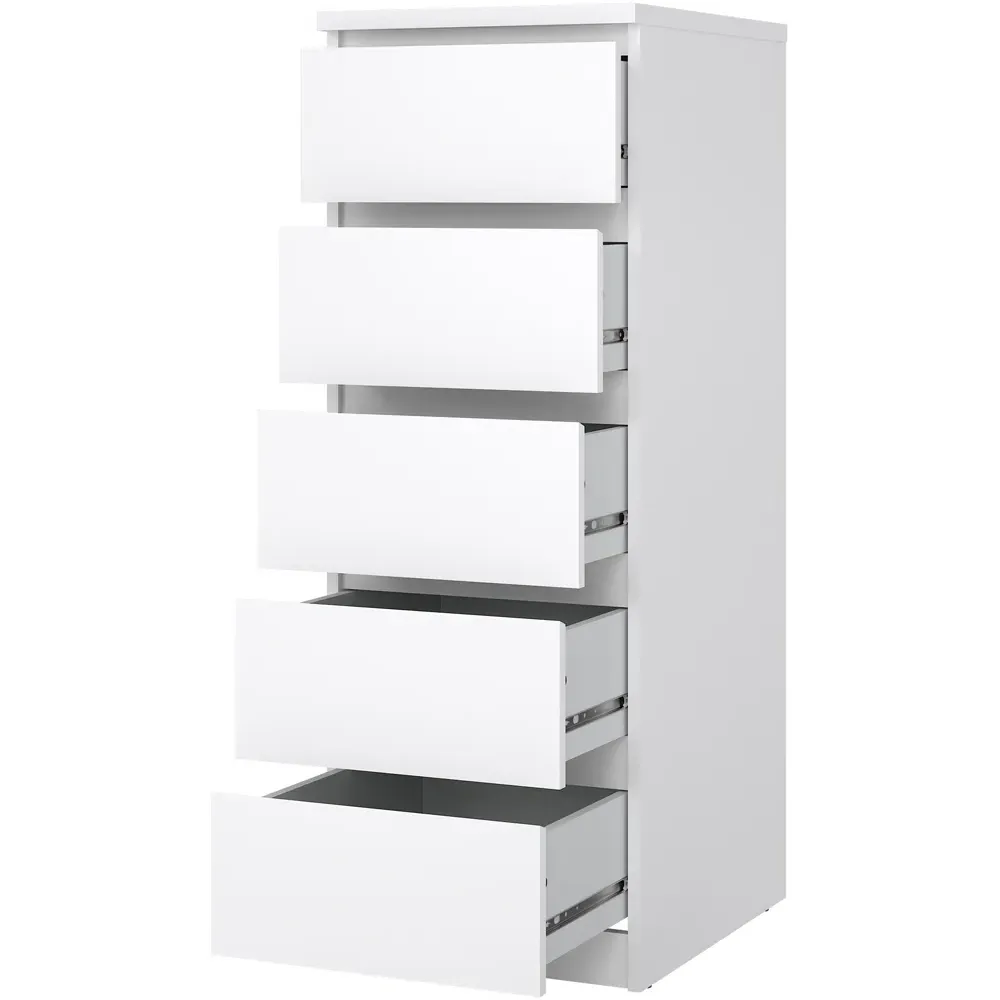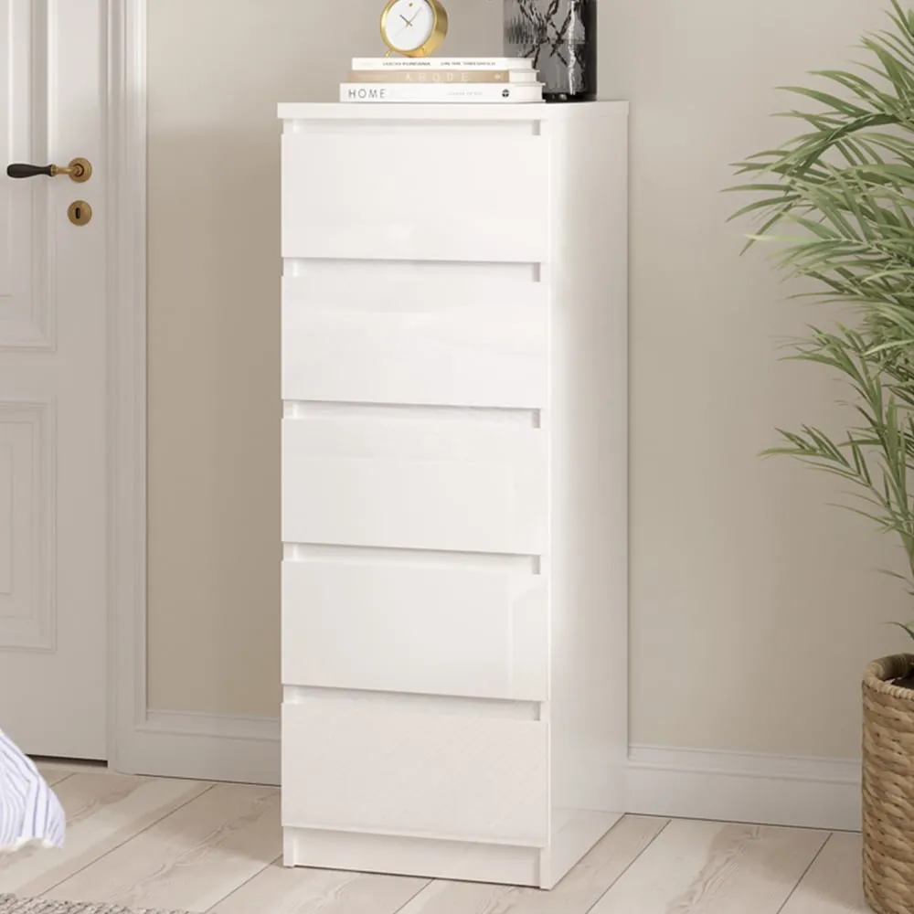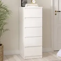 Upgrade your living space with this Florence Five-Drawer White Narrow Chest of Drawer. This chest has a modern handle-less design that can go with any home décor. It features five drawers, offering plenty of storage space to organise your living space. With easy-gliding runners for drawers, this chest is easily accessible. It also has wrapped edges for a clean, streamlined look. Made from high-quality laminated board, it is resistant to damage, scratches, moisture, and high temperatures.