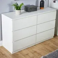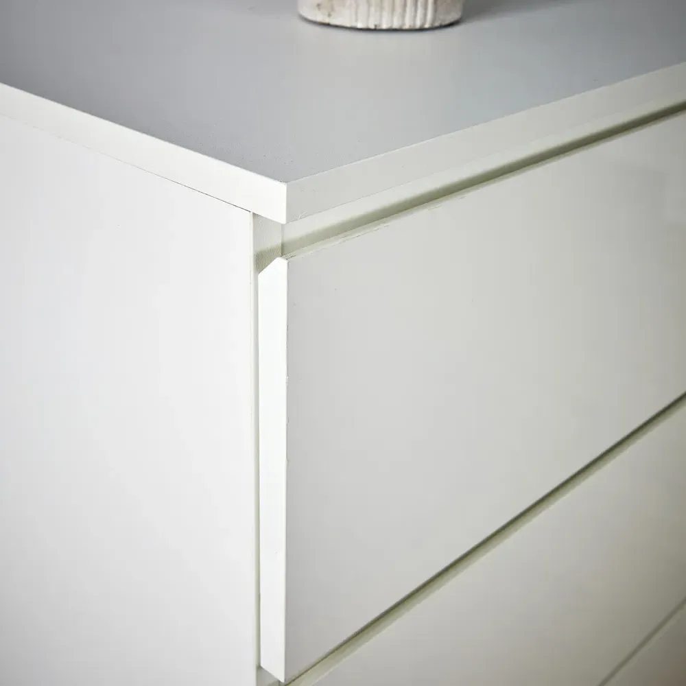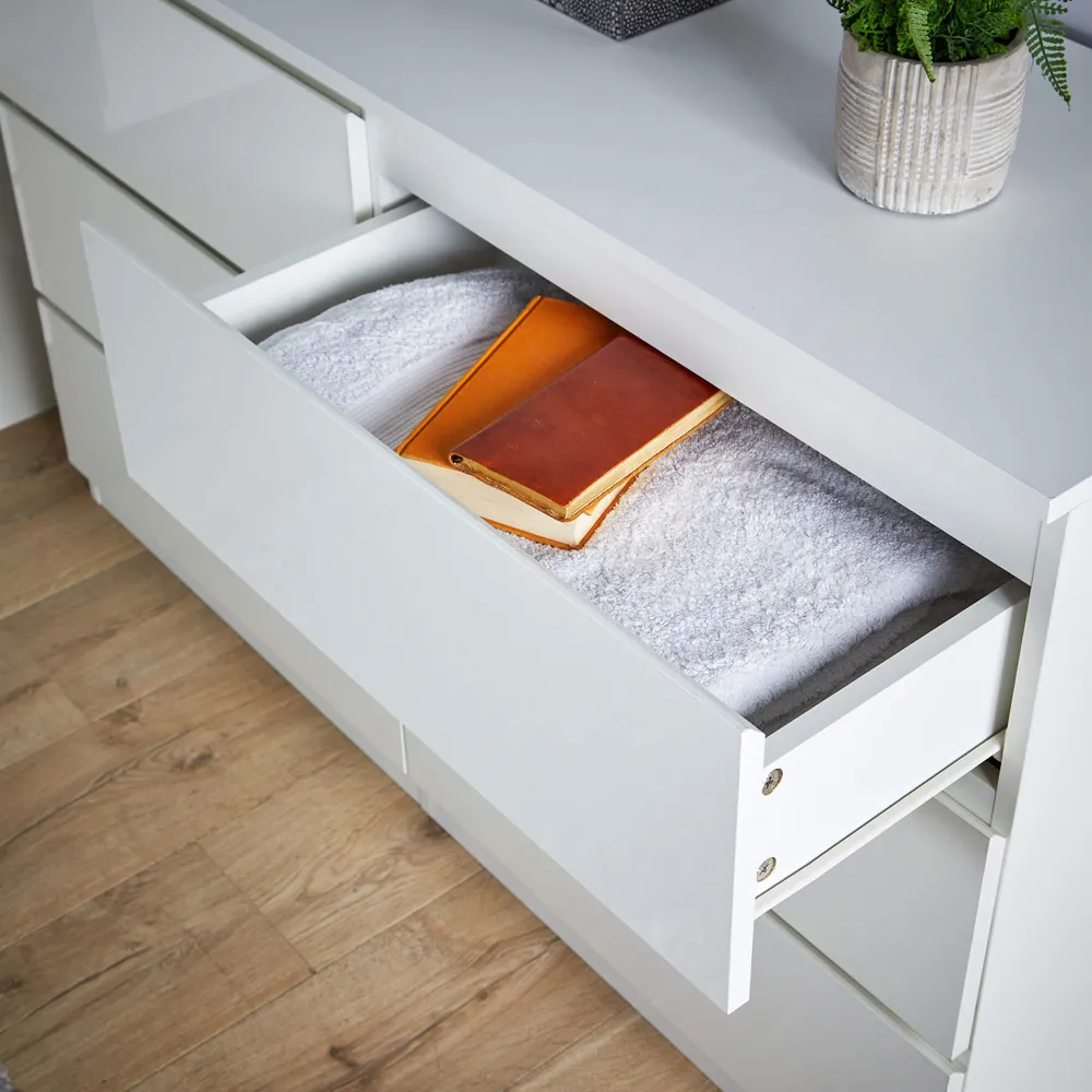 The Lugano chest provides ample storage with its four spacious drawers, accented by high gloss UV drawer fronts. Its hidden handles create a clean appearance, while the robust MDF and particle board blend adds durability. The compact footprint suits various spaces, and the flat-packed format ensures easy assembly at home.