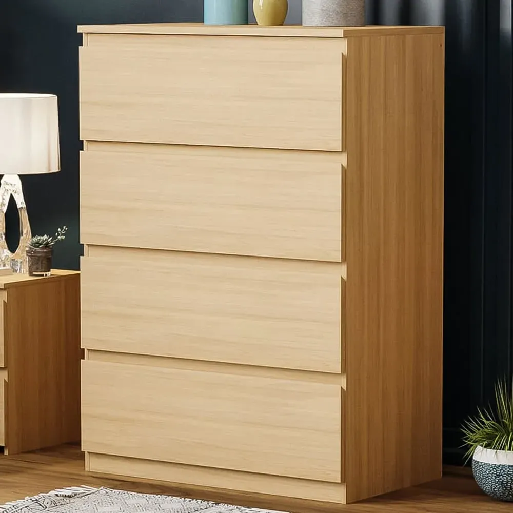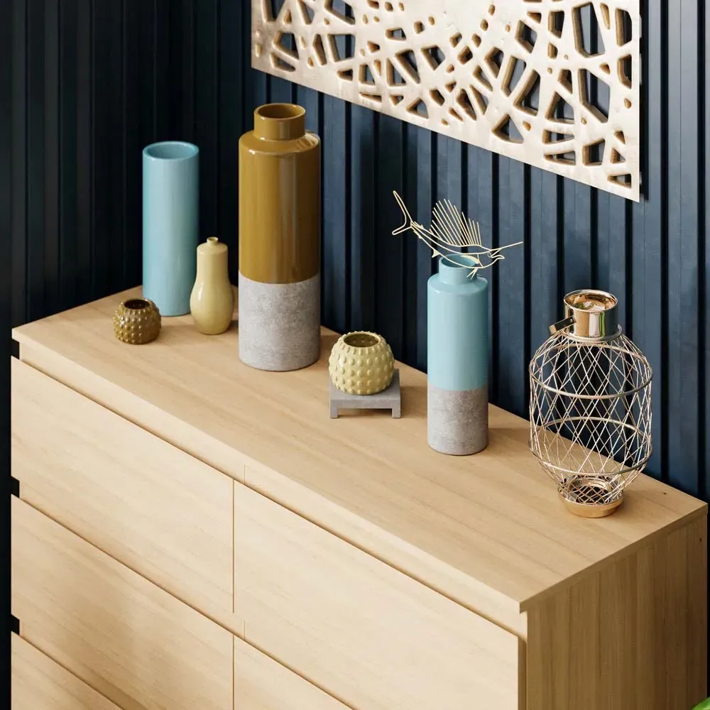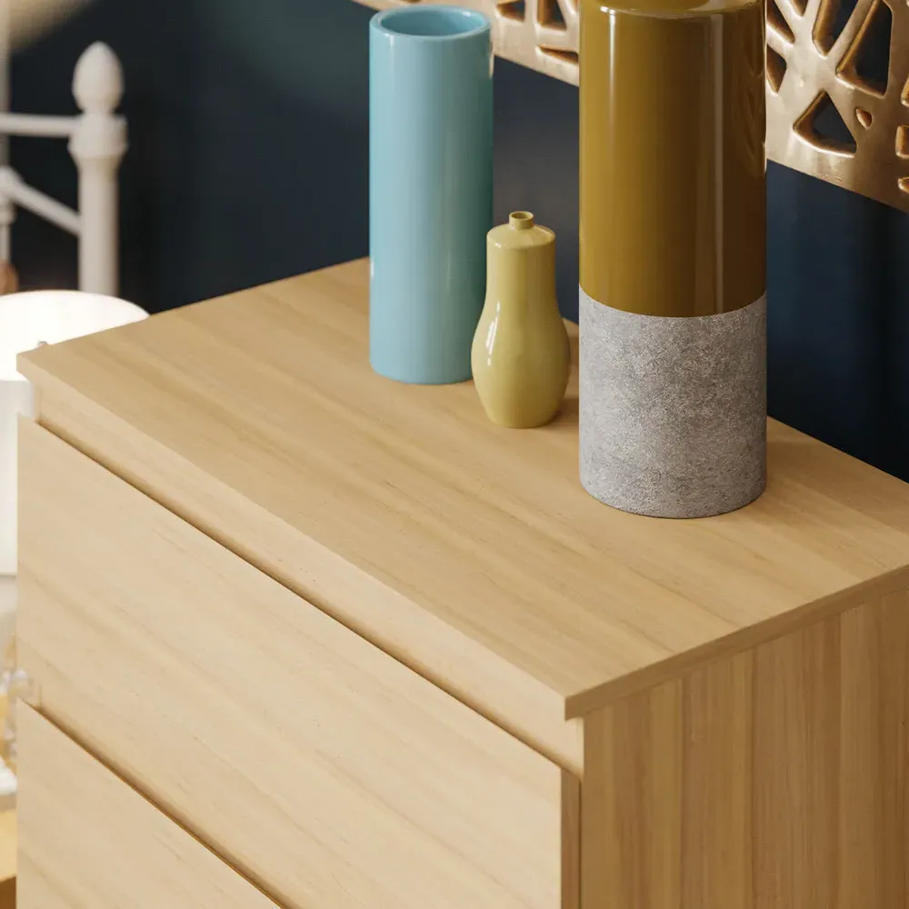 The Denver chest of drawers features three spacious drawers with solid pine construction for durability. Its handle-free design enables smooth gliding operation, while the compact size makes it suitable for smaller spaces. The sturdy build supports up to 5kg per drawer, providing reliable storage for essentials.