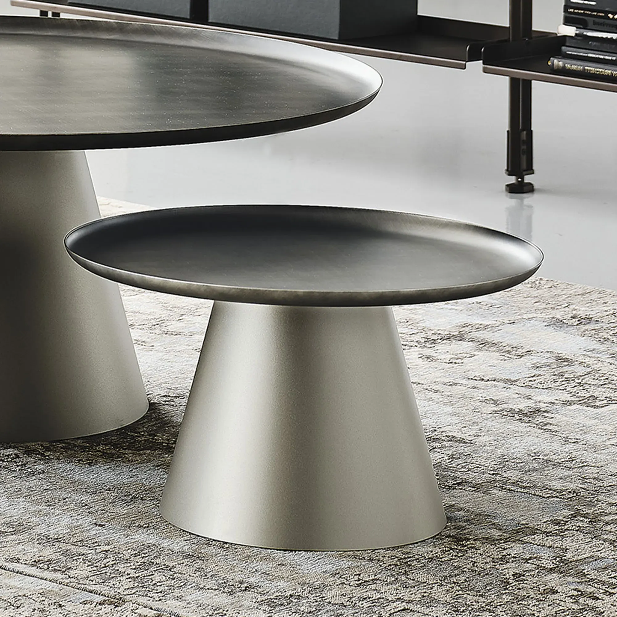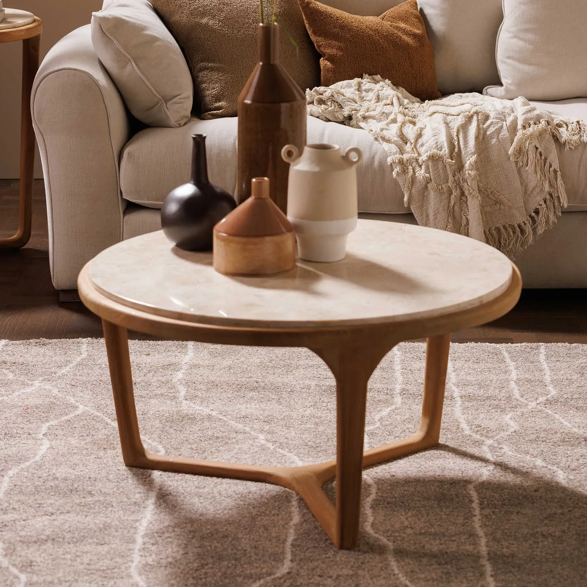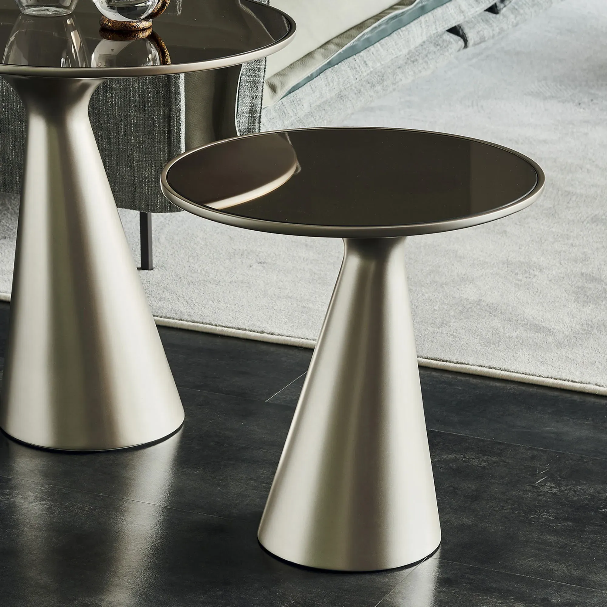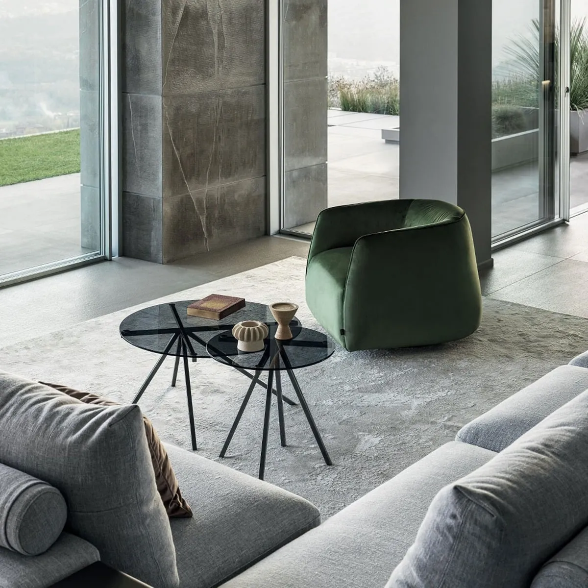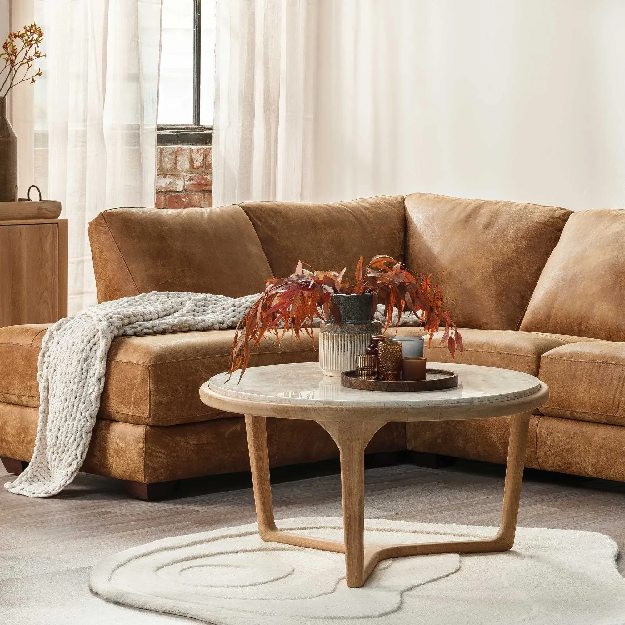 The Medici Coffee Table combines glass construction with warm-toned wood and mild steel elements. Its round surface provides ample entertaining space, while the harmonious blend of materials ensures lasting durability. The green glass top adds a distinctive touch to any living space. W45 x D45 x H47 cm