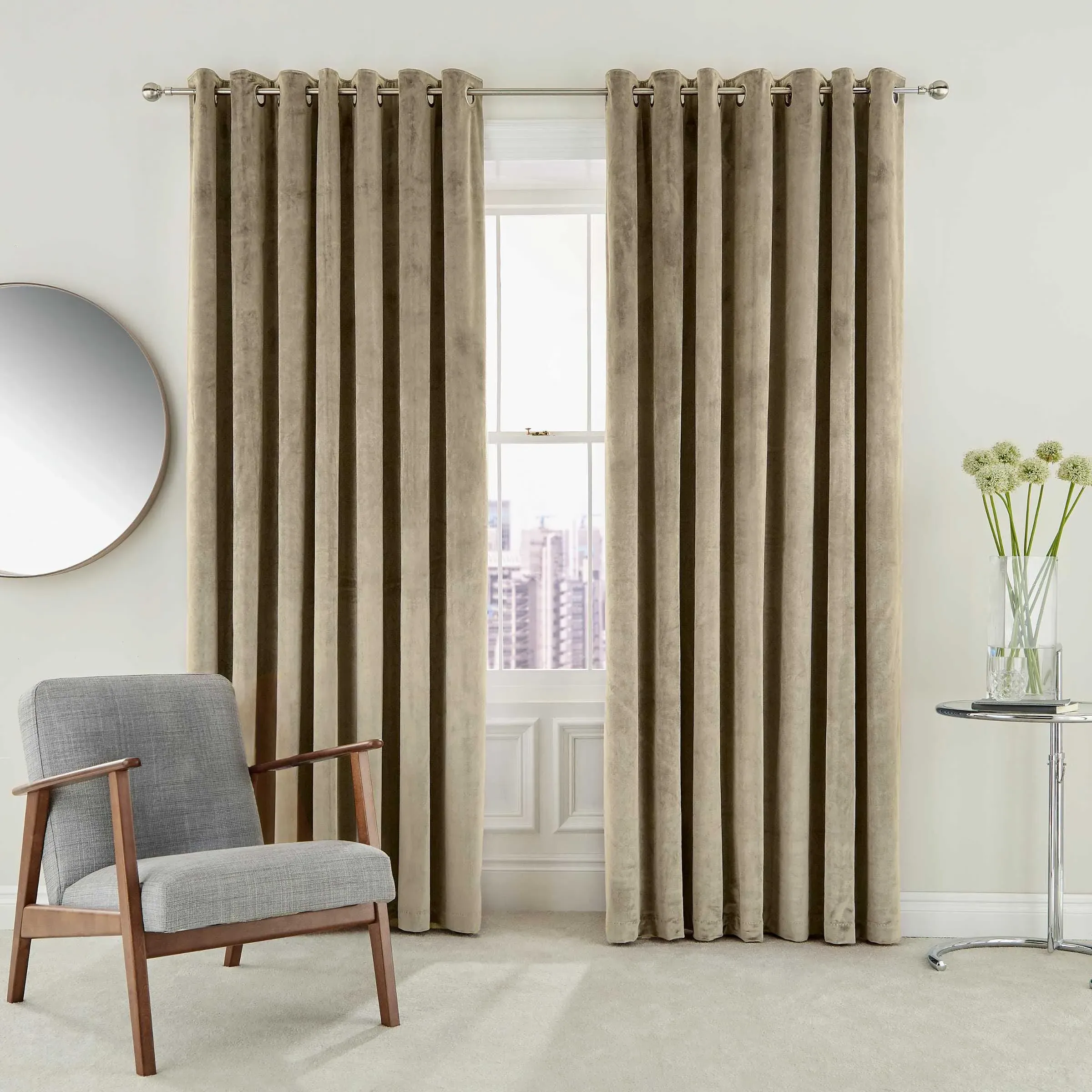 The curtains offer luxurious comfort with their soft velvet construction, featuring matte silver eyelets for contemporary appeal. The full lining provides enhanced privacy and light control, while the sumptuous fabric adds warmth and texture. The eyelet design allows smooth operation and creates elegant folds when drawn.