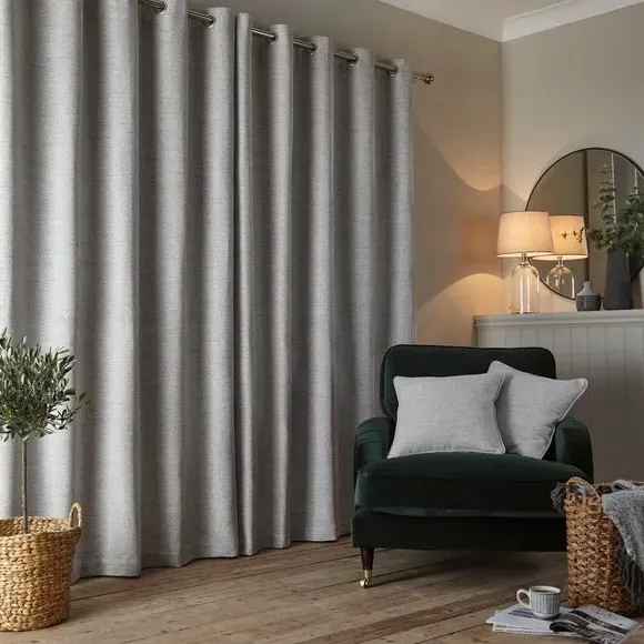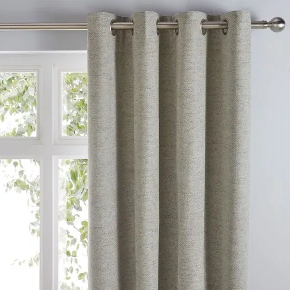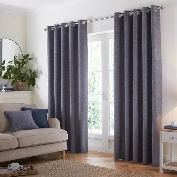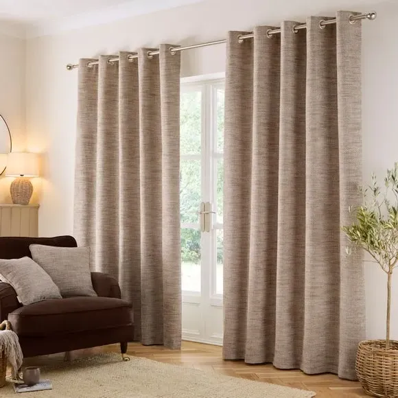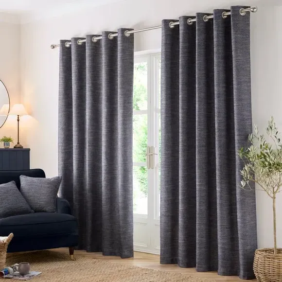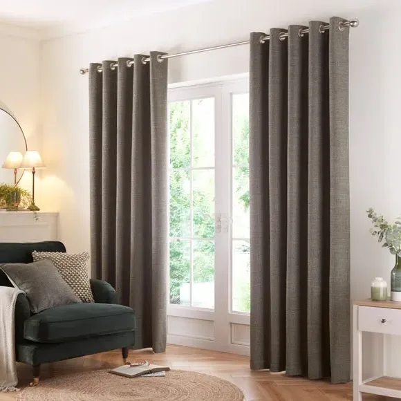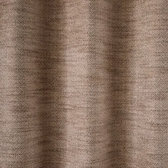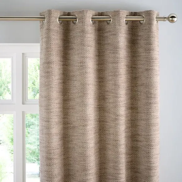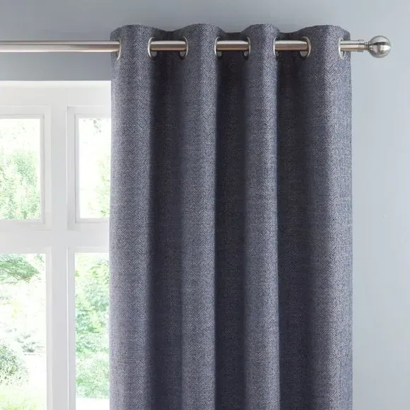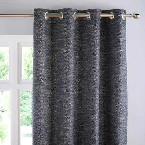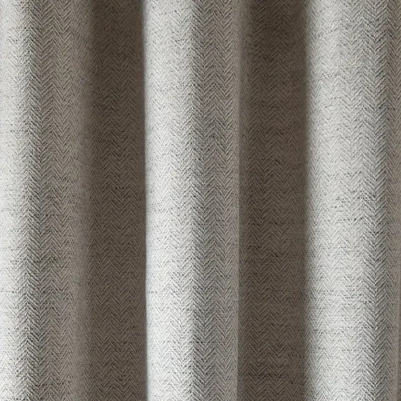 The herringbone eyelet curtains offer timeless texture with their woven pattern design, featuring brushed steel eyelets for smooth pole movement. The polyester lining provides enhanced privacy and insulation, while weighted corners ensure a beautiful hang. Each pair includes two panels with multiple lining options including blackout functionality.