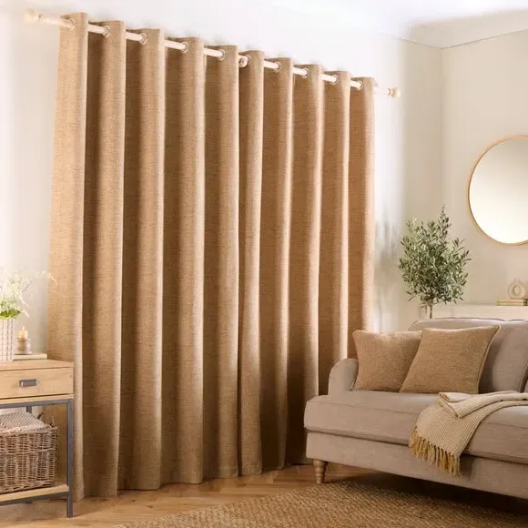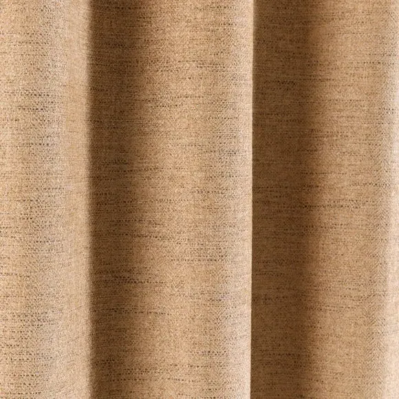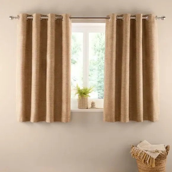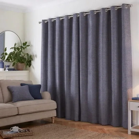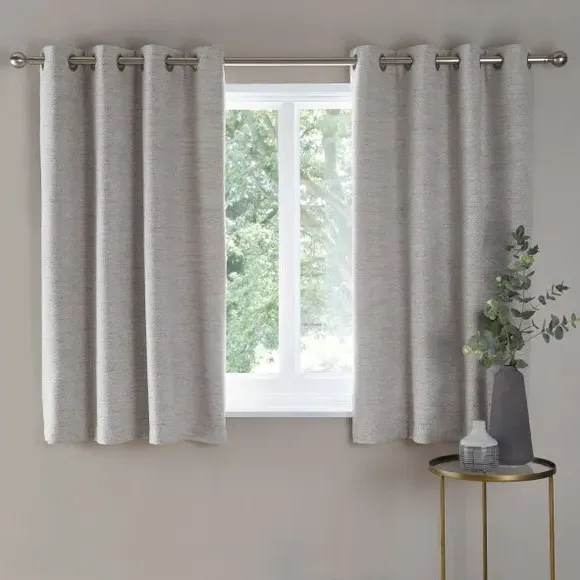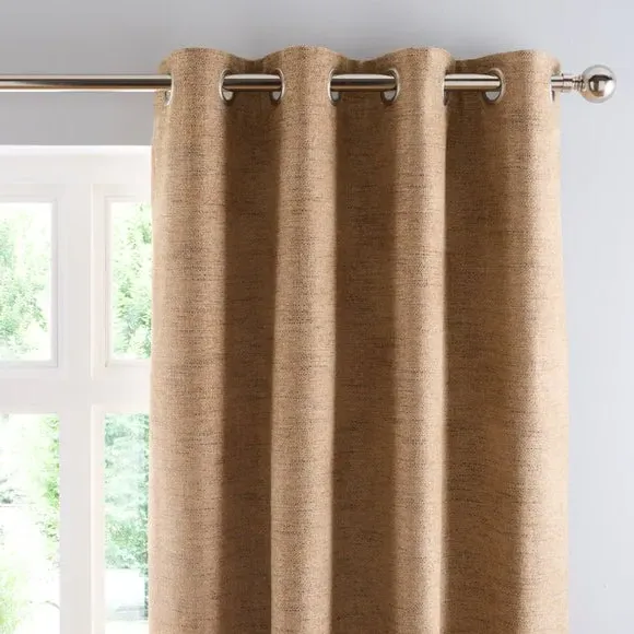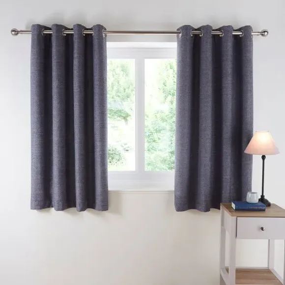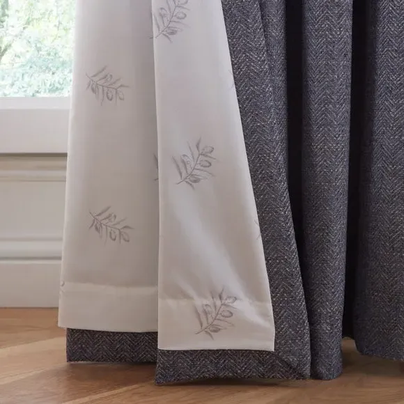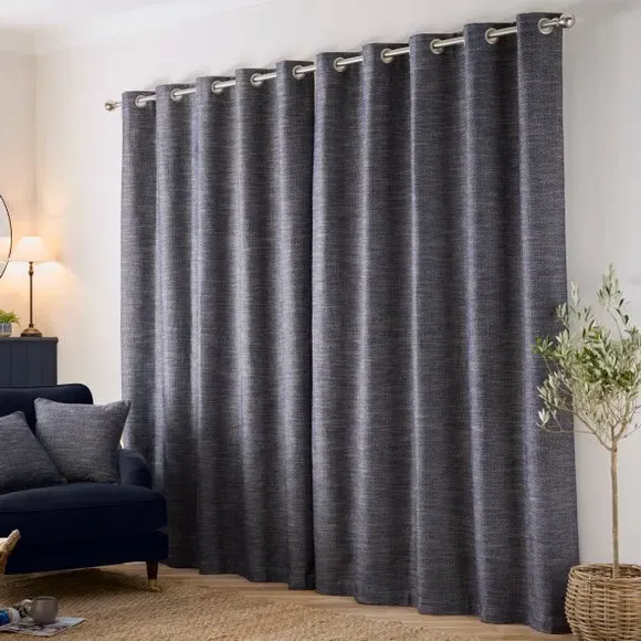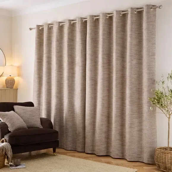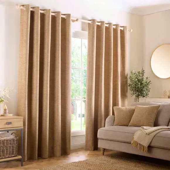 The herringbone eyelet curtains offer timeless texture with their woven pattern design, featuring brushed steel eyelets for smooth pole movement. The polyester lining provides enhanced privacy and insulation, while weighted corners ensure a beautiful hang. Each pair includes two panels with multiple lining options including blackout functionality.