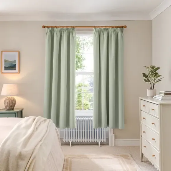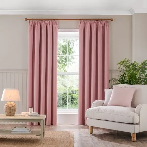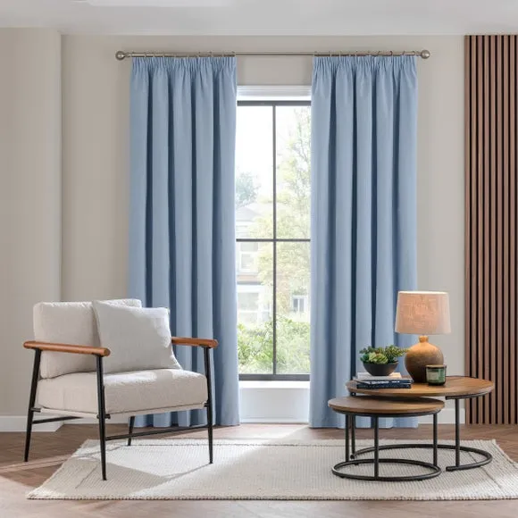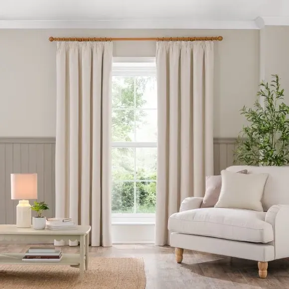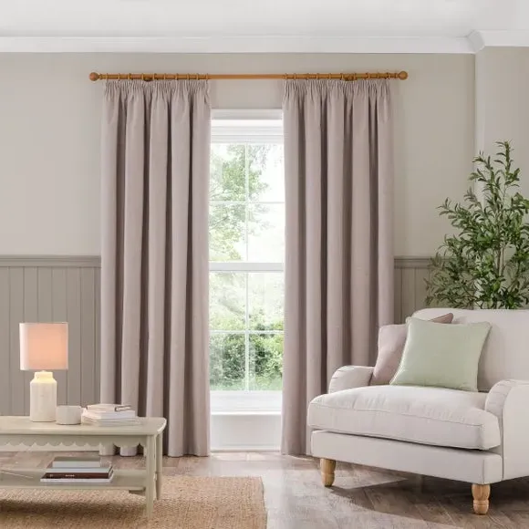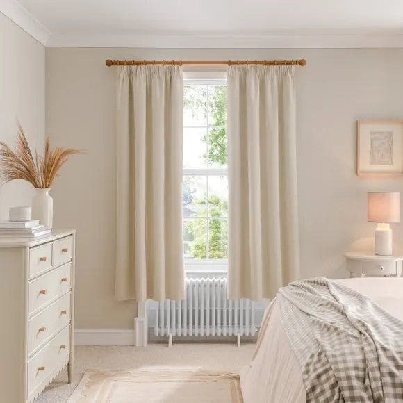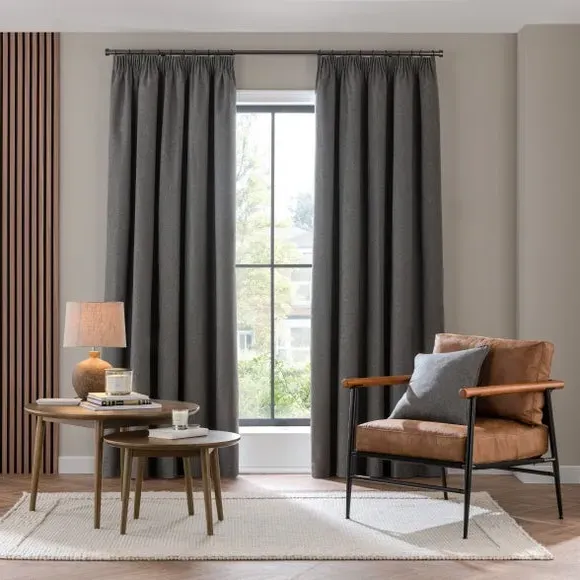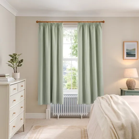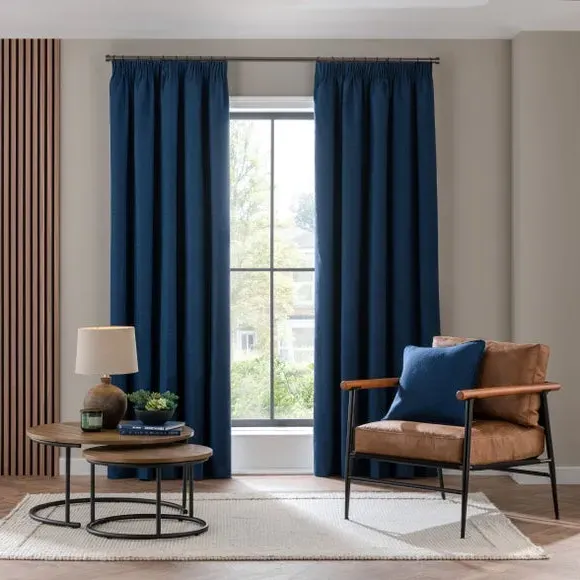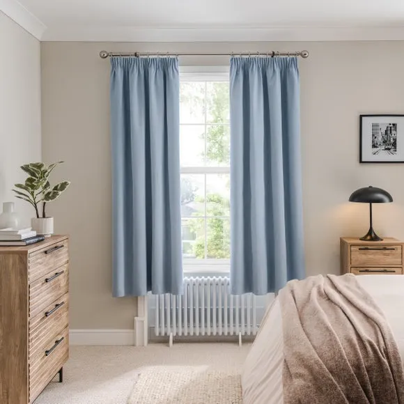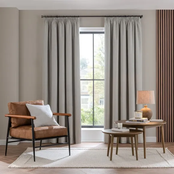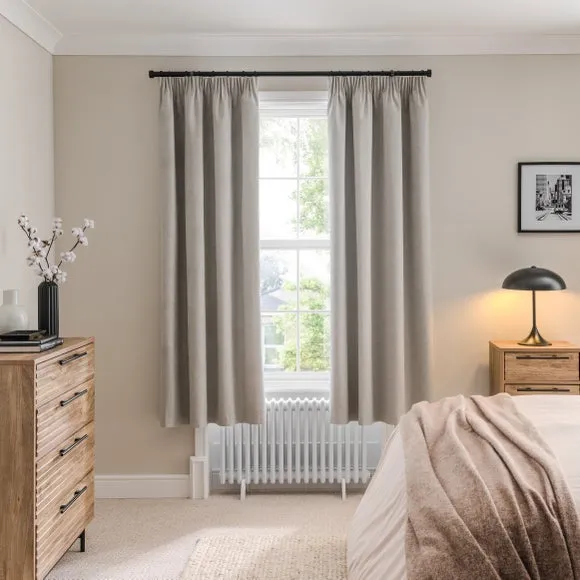 * 1 pair - includes 2x curtain panels* Soft brushed luna fabric* Blackout coating to keep out external light* Thermal properties to help regulate room temperature* Pencil pleat header* Available in a choice of colours and sizes Refresh your home with our stylish Luna blackout curtains, designed with a modern pencil pleat header for a stunning gathered appearance. This pair of curtains are made with high quality materials and feature a brushed effect finish for a soft and luxurious touch. Complete with a blackout coating to stop unwanted light entering your home and with temperature smart properties, the Luna pencil pleat curtains are effective at keeping out draughts in winter and blocking out heat in the summer, perfect for ensuring a good night's sleep everyday. The size of the curtains shown is the size of 1 panel, you will receive 2 panels of this size. Choose the width that is closest to your pole length for full look.