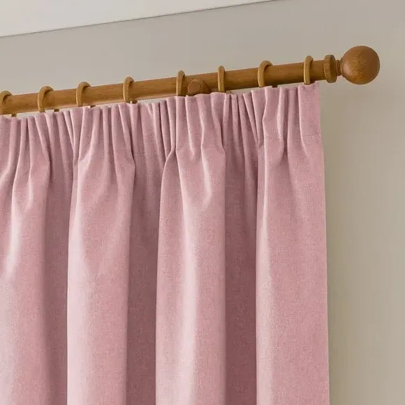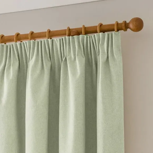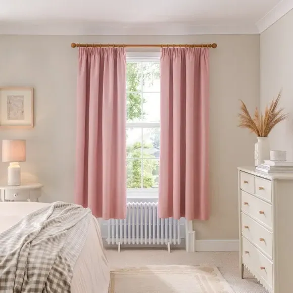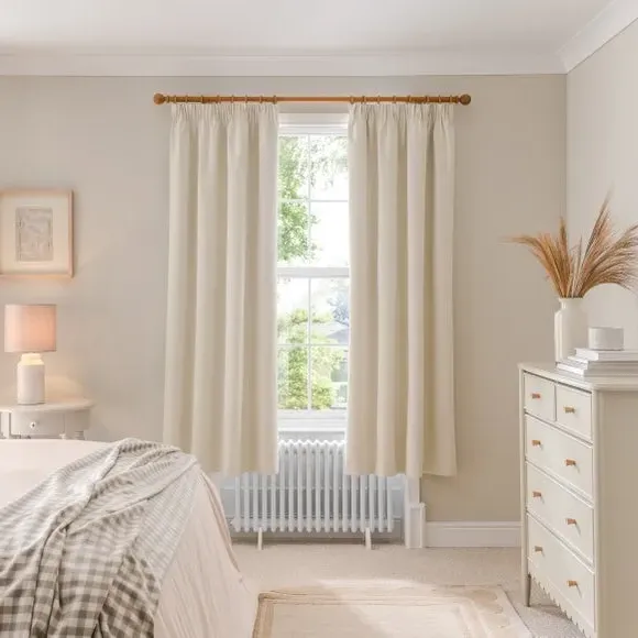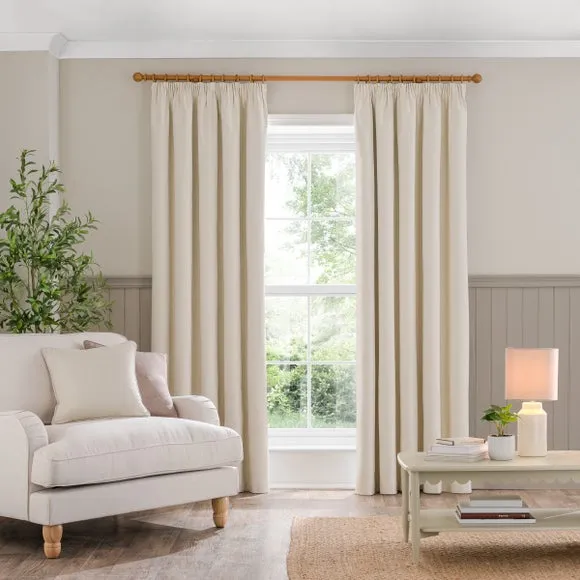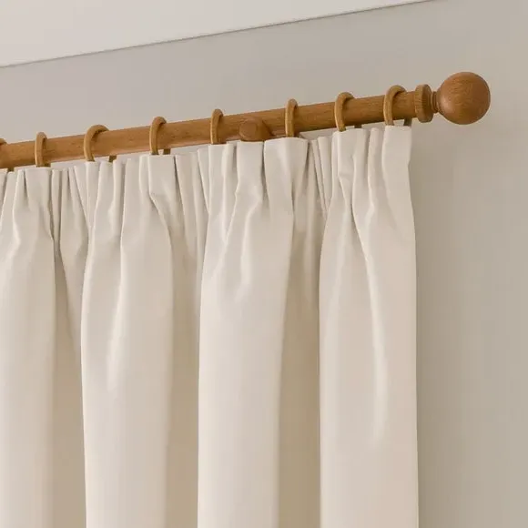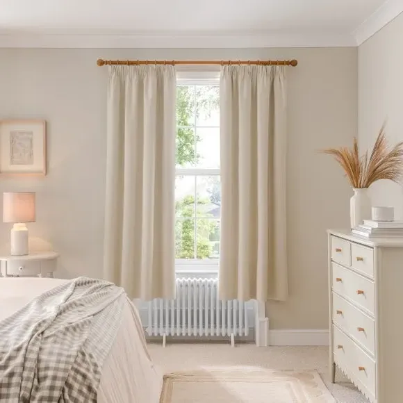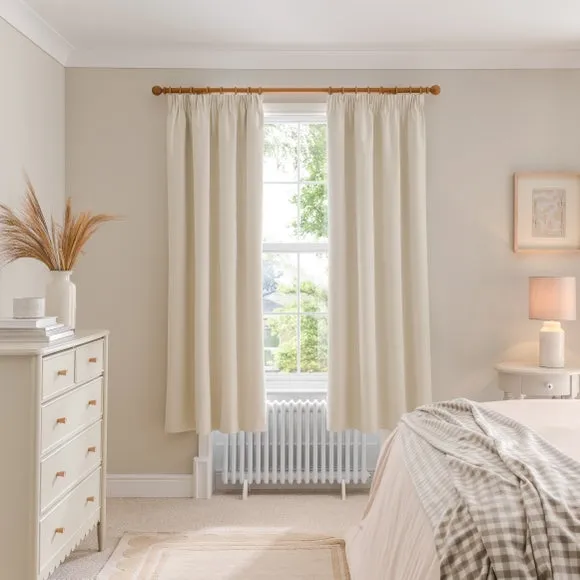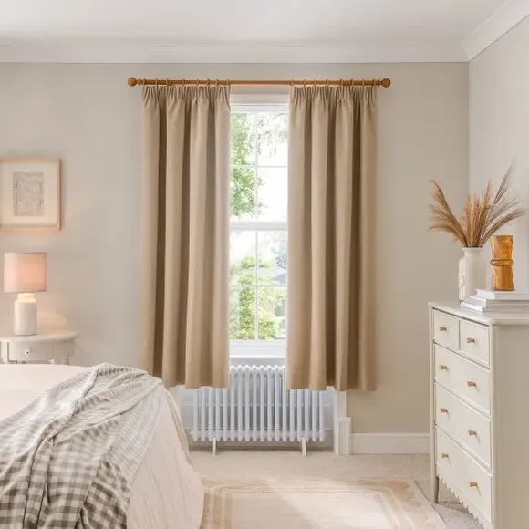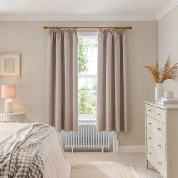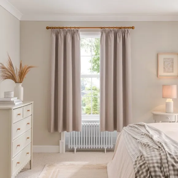 The blackout curtains offer complete light control with their specialized coating, featuring a soft brushed fabric finish. The pencil pleat header creates elegant gathered folds, while the thermal properties help regulate room temperature year-round. Each pair includes two panels with blackout coating that blocks external light and provides insulation against draughts and heat.