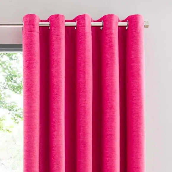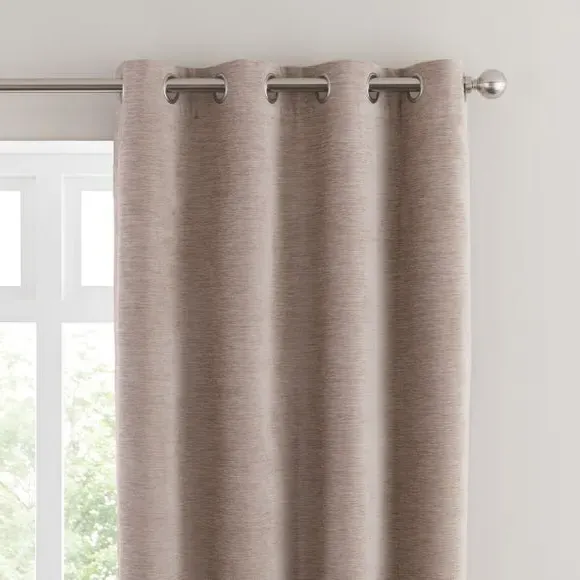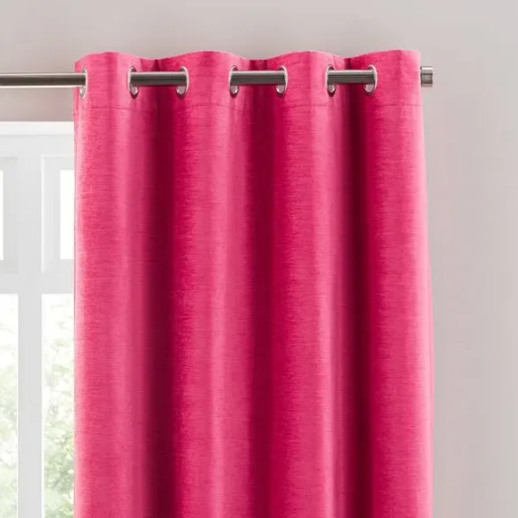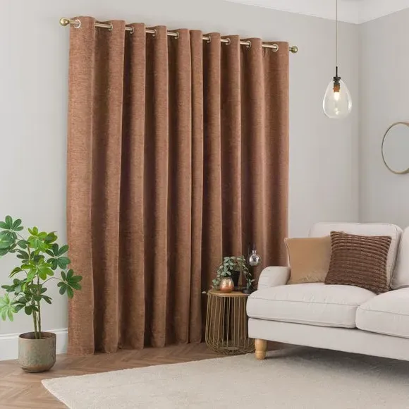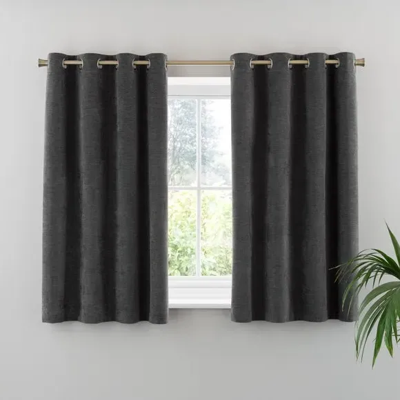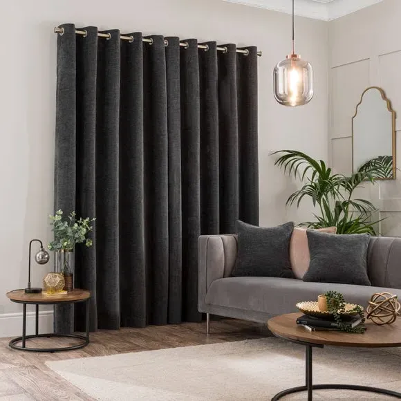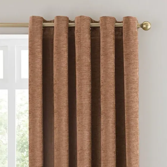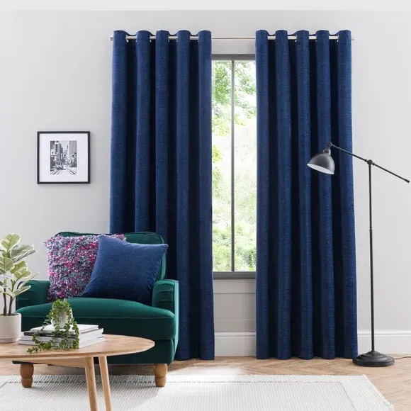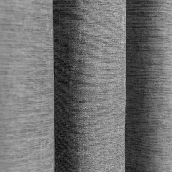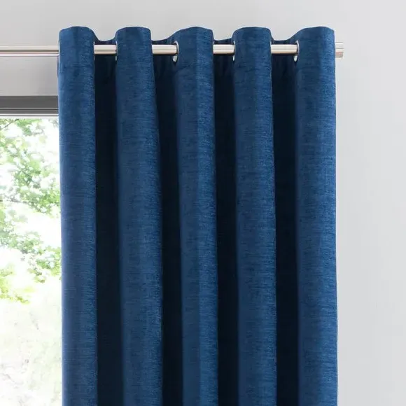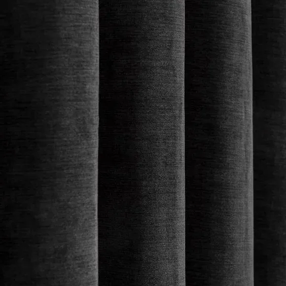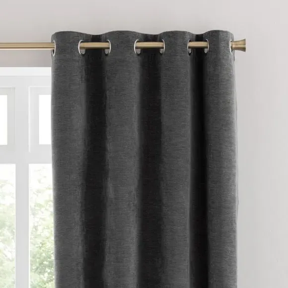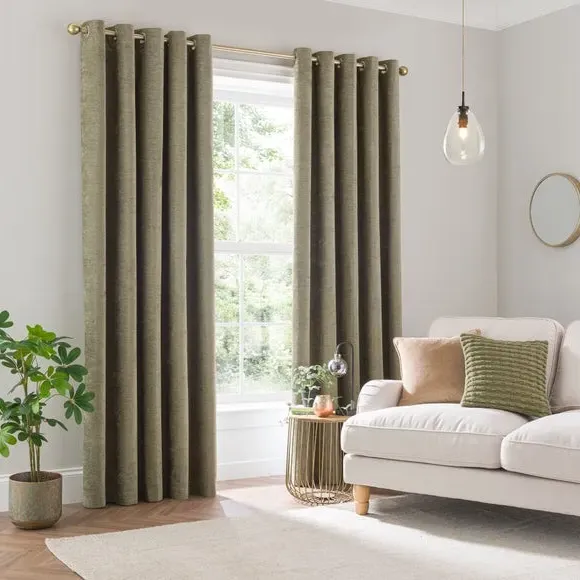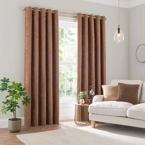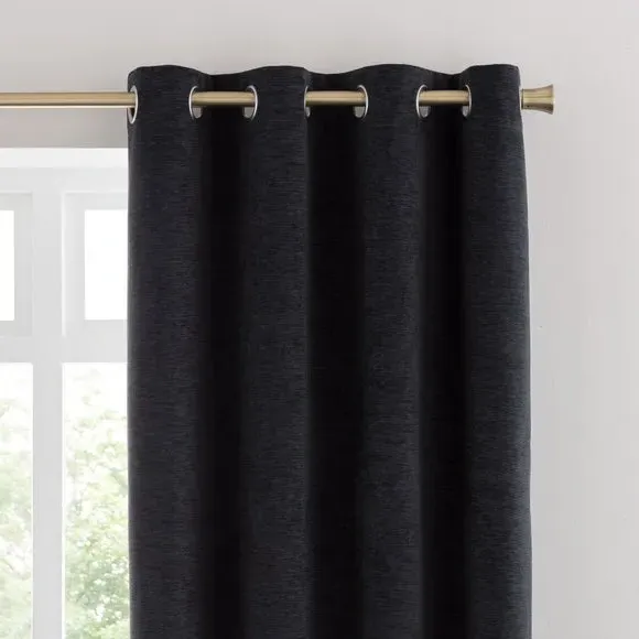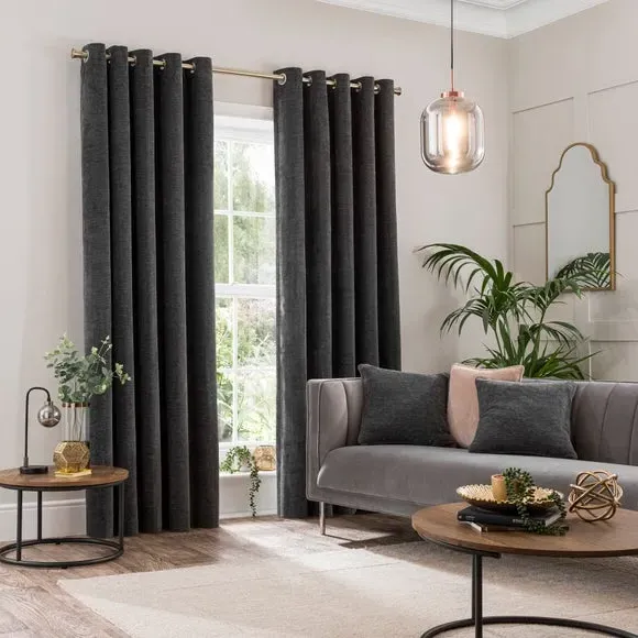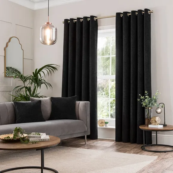* Soft, woven chenille curtain* Blackout finish to keep out external light* Thermal Insulation* Eyelet header* Coordinating cushion available Our Genoa woven chenille curtains add a welcoming touch to your living areas. Made from 100% recycled polyester and crafted with a blackout finish, this pair of curtains is perfect to block out light and to keep draughts away in winter and to block out the heat in summer. With the easy-to-hang eyelet header, you'll have these curtains up and ready in no time.