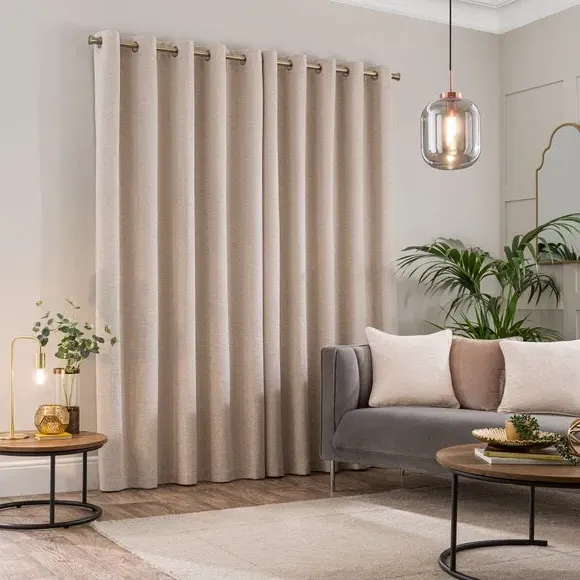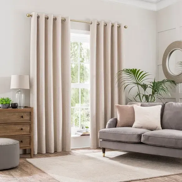 The curtains offer complete light blocking with their blackout finish, crafted from soft woven chenille fabric. The thermal insulation provides year-round comfort, keeping draughts away in winter while blocking heat in summer. Featuring easy-to-hang eyelet headers for quick installation, the recycled polyester construction adds durability and eco-friendly appeal.