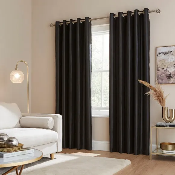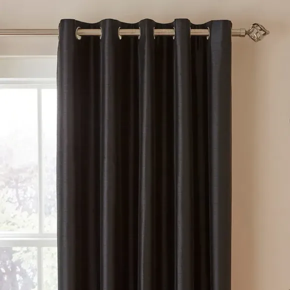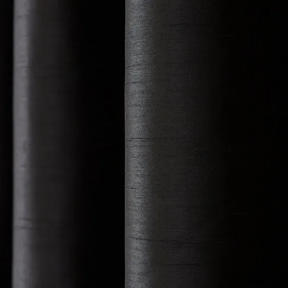 The curtains combine luxury faux silk texture with practical blackout functionality, crafted from sustainable recycled polyester. The blackout lining blocks light effectively while providing privacy, and the eyelet header allows for smooth operation along curtain rods. The faux silk finish adds visual depth and richness, while the durable polyester construction ensures long-lasting performance.