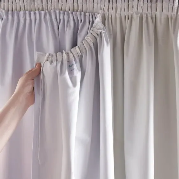 The blackout curtain linings provide complete light blocking with their thermal properties that regulate temperature year-round. Each set includes 2 panels with pencil pleat headers, designed 3-4 inches shorter than main curtains for discreet installation. The linings hang behind existing curtains with the top positioned 2-3 inches below the main curtain header and hem sitting 1 inch above the base. This construction ensures the white lining remains hidden while improving energy efficiency and blocking unwanted external light.