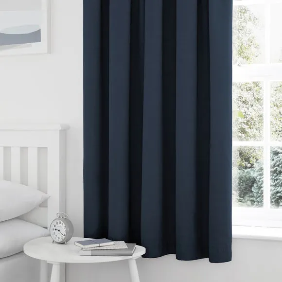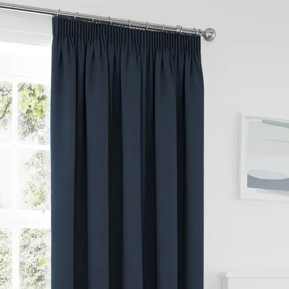 The blackout curtains provide complete light elimination with their specialized lining, featuring traditional pencil pleat headers for easy hanging. Crafted from a durable polycotton blend, the fabric offers easy maintenance and iron-friendly care. The set includes two panels that block external light for enhanced comfort, while the classic pleated design adds timeless appeal. W168 x H182 cm per pair.