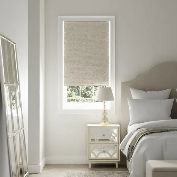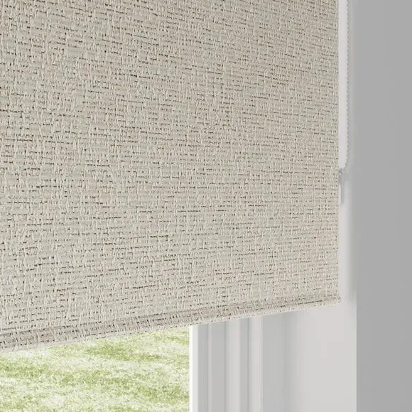 The roller blind provides effective light blocking with its blackout finish, accented by a linear woven texture in recycled polyester. Its metal side chain delivers smooth functionality, while the blackout treatment reduces incoming light and increases privacy. The blind includes complete fixing hardware for simple installation.