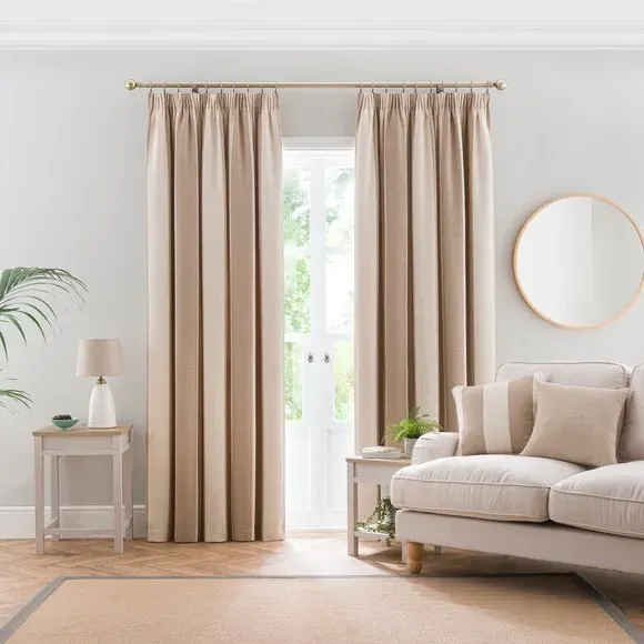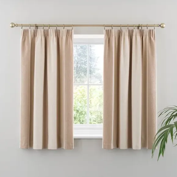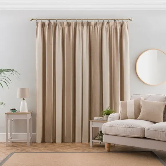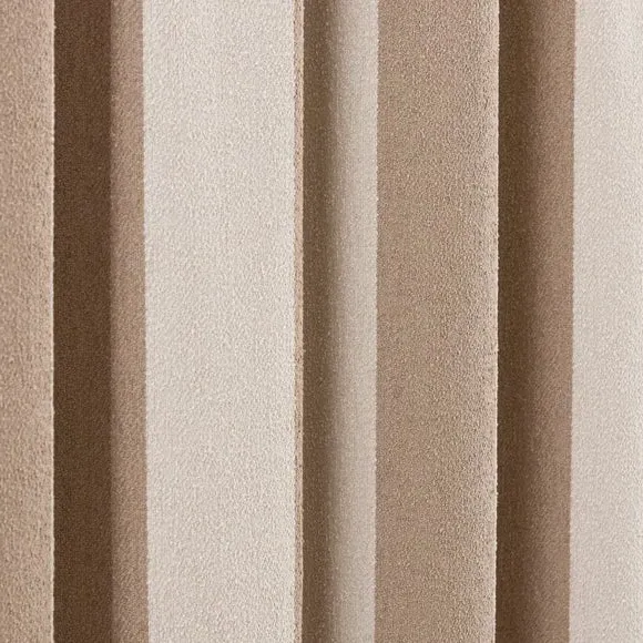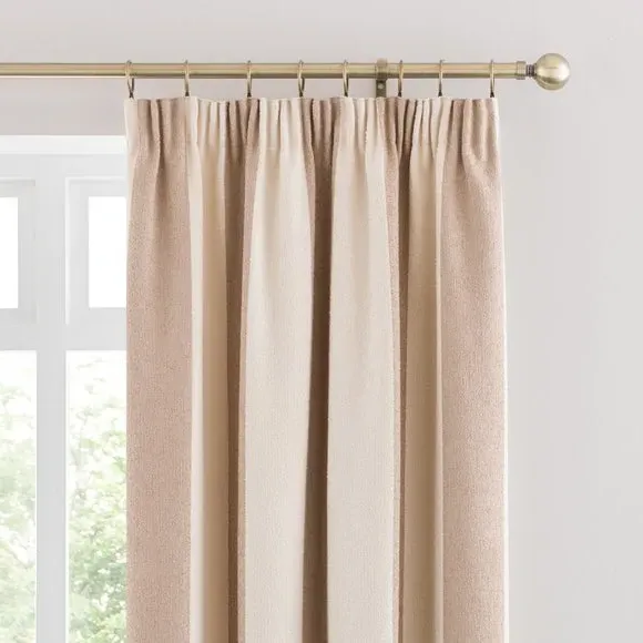 The curtains feature textured boucle fabric with a wide block stripe design, crafted from recycled materials for sustainable style. The pencil pleat header provides classic refinement while the recycled polyester lining adds proper drape and structure. With their harmonious natural tones, these curtains complement various interior styles, and the detailed construction ensures an effortlessly tailored appearance.
