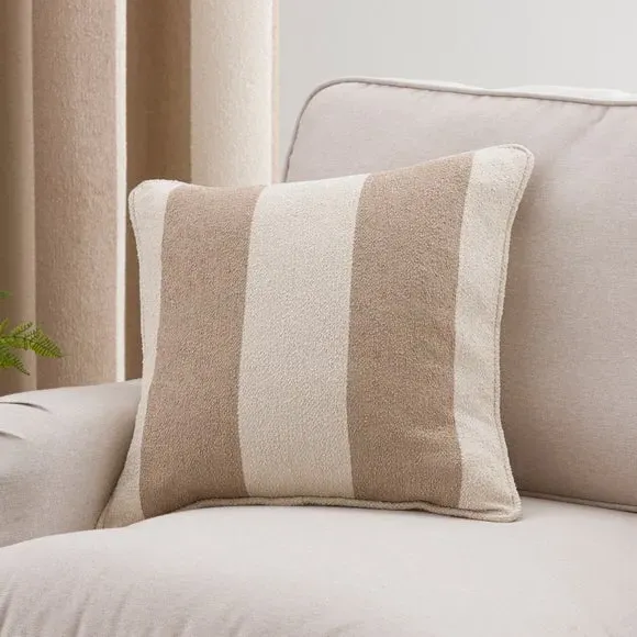 * Textured Boucle fabric in a wide block stripe design* Crafted from recycled materials* Pencil pleat header* Recycled polyester lining for drape* Matching cushion available The curtain features a captivating block stripe pattern, providing a modern and timeless aesthetic. The harmonious colour palette make these curtains a versatile style companion, matching many interior styles. Designed with attention to detail, the pencil pleat header adds a touch of classic refinement and complements the textured boucle yarns offering an effortlessly tailored look. Available in a wide range of sizes.