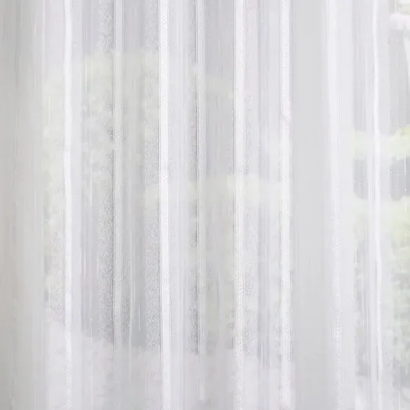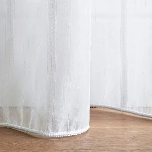 The Chevron Voile Curtains feature a lightweight polyester composition with a subtle textured chevron stripe design. The delicate pattern adds modern texture while allowing soft light to filter through, enhancing privacy with its semi-sheer construction. Available in multiple header options, these made-to-measure curtains provide a tailored fit for any window. The durable polyester fabric ensures easy maintenance and long-lasting performance.
