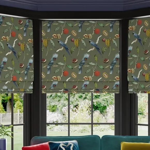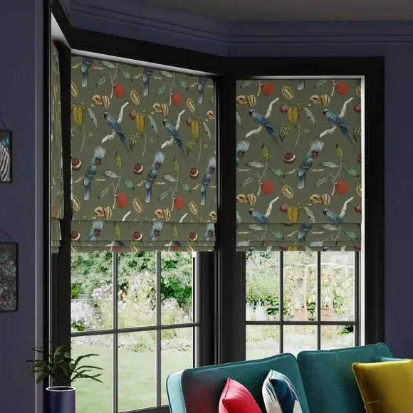 The digitally printed design features an intricately hand painted cockatoo and foliage placement design elegantly presented on a rich ink or sophisticated olive ground. The Maximalist Cockatoo design is bold, fun, and perfect for a truly showstopping look in your home. Our Web Exclusive Maximalist range features 12 stunning, unique designs for curtains, upon a beautiful velvet fabric base, and includes a wide range of styles. Introducing wildlife and storytelling into your décor, with designs like Bengal, Cockatoo, Wagtail and Passion, will create a stunning focal point in any room. Inspired by nature, Maximalist also includes ‘full of life’ wildflower scenery fabrics such as Magnolia, Iris, Jacobean, Tropical and Palm. Displaying bright and wonderful colours upon soft velvet fabric bases will add drama and movement to any room.**Choosing your lining:*** Blackout provides minimal light disturbance in your home making it perfect for bedrooms.* Thermal helps to keep the warmth in and the cool air out meaning it’s great for family rooms or lounges.* Our Standard Lining is perfect if you like the glow of natural light whilst your curtains are closed whilst still maintaining your privacy.**Choosing your fitting type:*** Inside the recess: this gives a tidy, snug finish as it’s made to fit your window exactly.* Outside the recess: this option is great if you don’t want the blind to be visible from the outside when it’s drawn up.**Choosing which side you’d like the operating chain:*** Think about where your blind will be situated and what furniture may be near it – choose the side that is easier for you to access.**Child Safety:**We add clips to the back of our roman blinds to attach the cords to the fabric. They also double up as a child safety feature. If pressure is exerted the clips will detach to prevent the risk of strangulation. If the clips detach accidentally during normal use, they can be easily re-clipped back into place.**Online Only:**This product is only available to order online. Our expert virtual consultants can provide advice on measuring/fitting and style tips and our free samples can be ordered online to be delivered straight to your home to help you choose a fabric that's right for you. Once you're happy, simply place your order online and we'll do the rest. Please note: If your measured width is over 130cm your blinds may come with a fabric join to provide the full width required.
