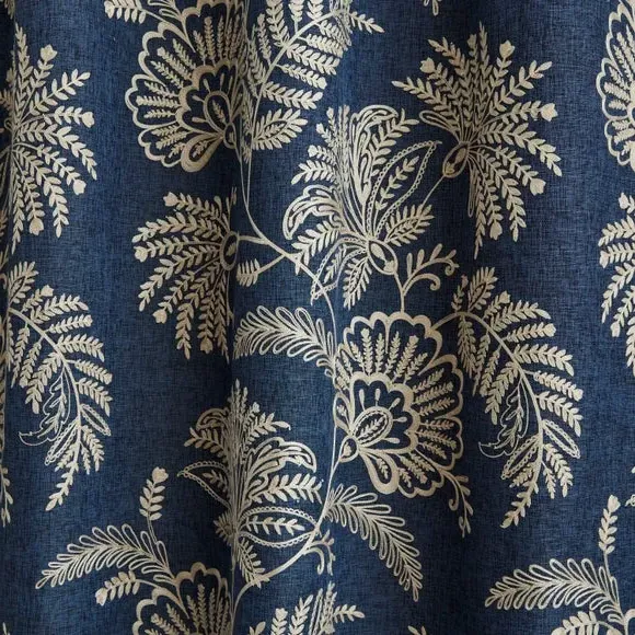 The curtains feature embroidered floral patterns with eyelet headers for easy hanging. Each set includes two fully lined panels that provide enhanced privacy and light control, while the polyester construction ensures durability and easy maintenance. The embroidered detailing adds texture and visual interest to the fabric surface.