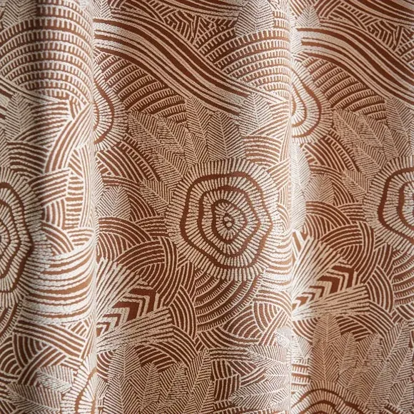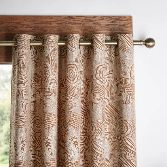 The curtains offer luxurious style with their jacquard face fabric, featuring antique brass eyelets for easy hanging. The full lining provides excellent drape and light control, while the durable construction ensures long-lasting performance. Each set includes 2 curtain panels with polished brass hardware that complements the rich caramel tone.
