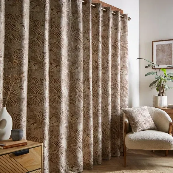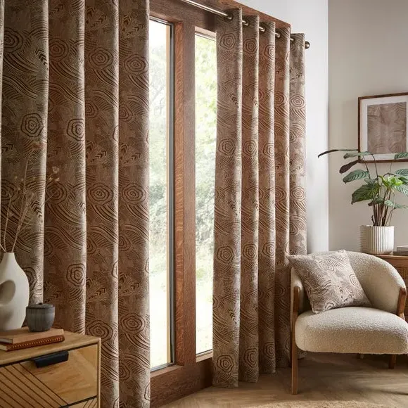 * Includes 2 x curtain panels* Jacquard fabric* Fully lined* Antique brass eyelets* Matching cushion available Add a touch of refined style to your windows with the Ougi Eyelet Curtains, crafted from luxurious jacquard face fabric for a sophisticated look. Fully lined to provide excellent drape and light control, these curtains are designed with durable antique brass eyelets for easy hanging and a polished finish. Pair them with the matching Ougi Cushion, sold separately, to create a cohesive and elegant interior.